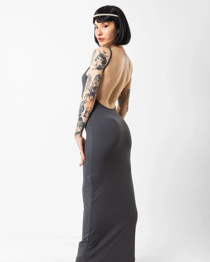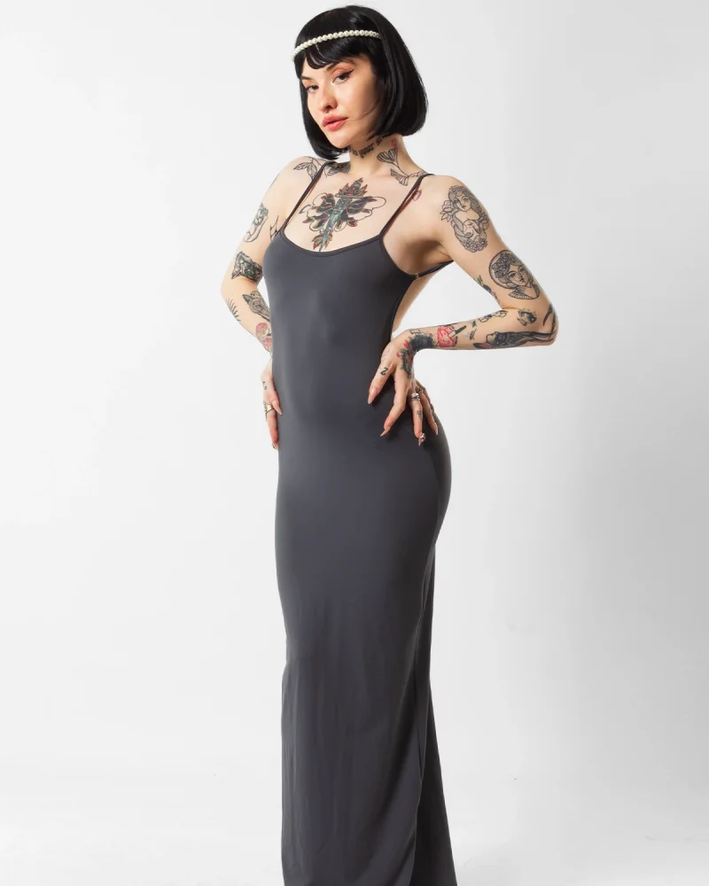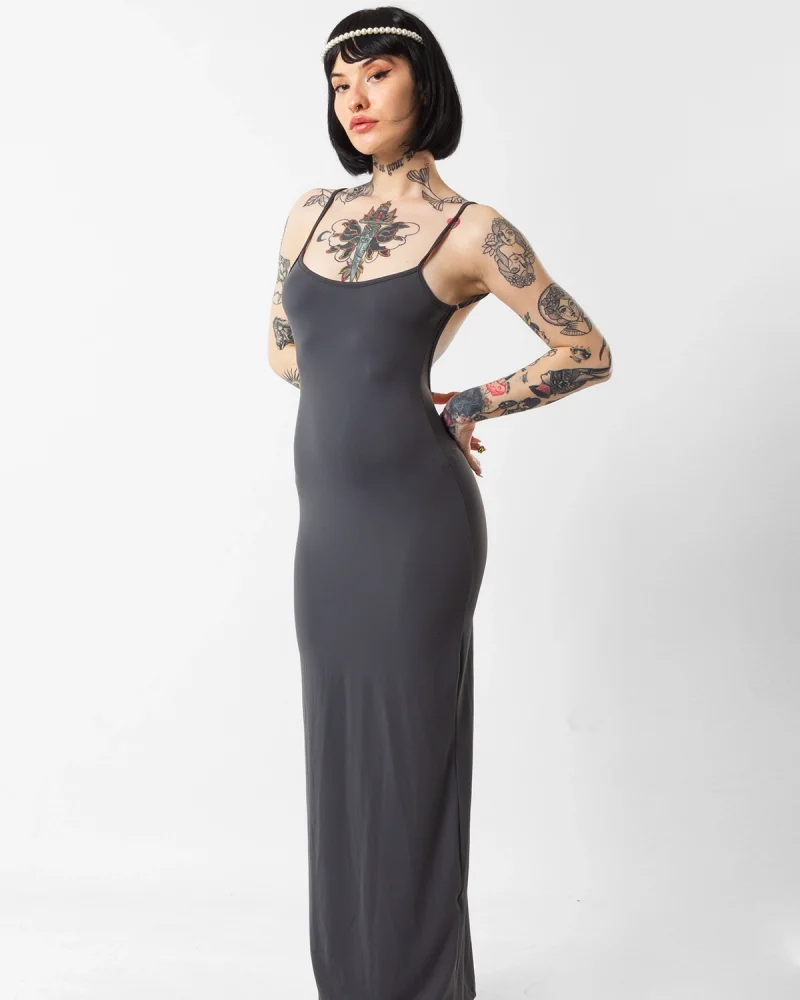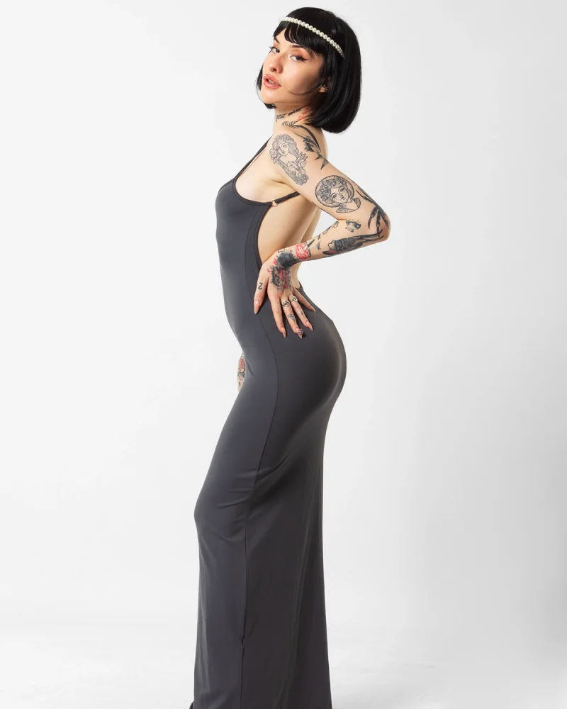 İnce Askılı Sırt Dekolteli Füme Sandy Uzun Elbise