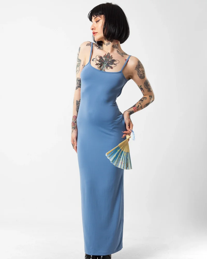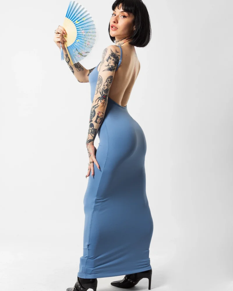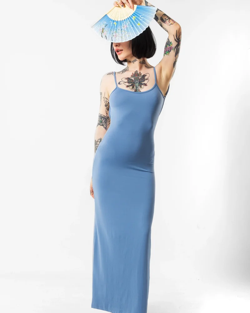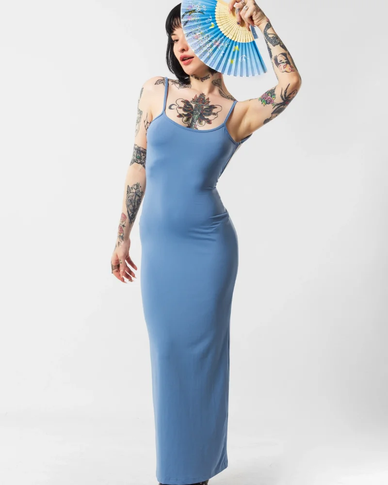 İnce Askılı Sırt Dekolteli Mavi Sandy Uzun Elbise