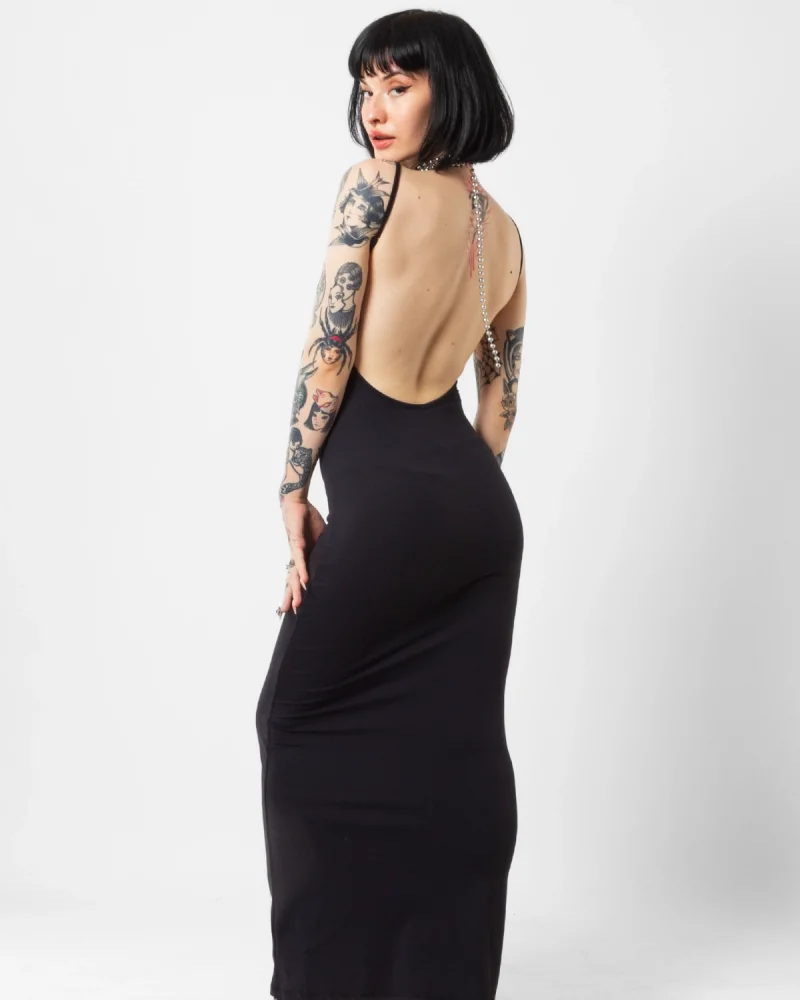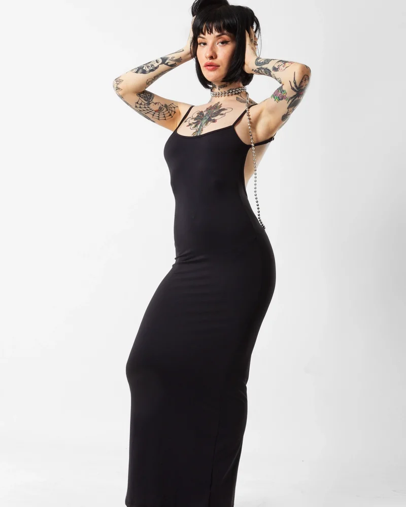 İnce Askılı Sırt Dekolteli Siyah Sandy Uzun Elbise