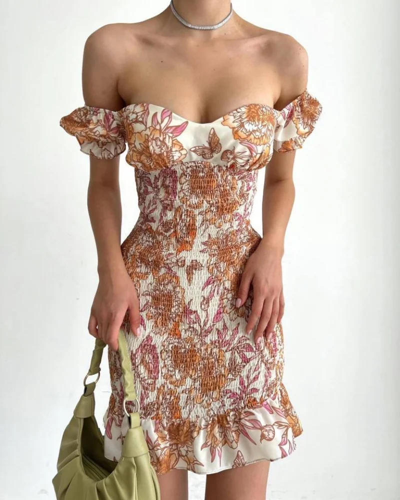 Kahve Çiçek Desenli Fırfırlı Mini Elbise