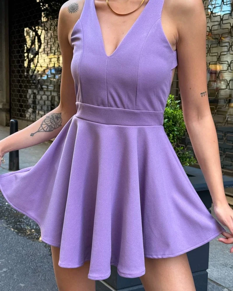 Sırt Dekolteli Mor Volanlı Sıfır Kol Şortlu Elbise