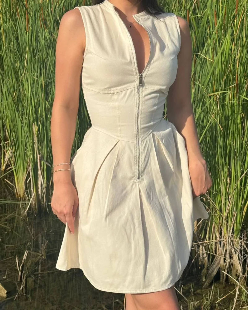 Yarım Fermuarlı Sıfır Kollu Krem Mini Elbise