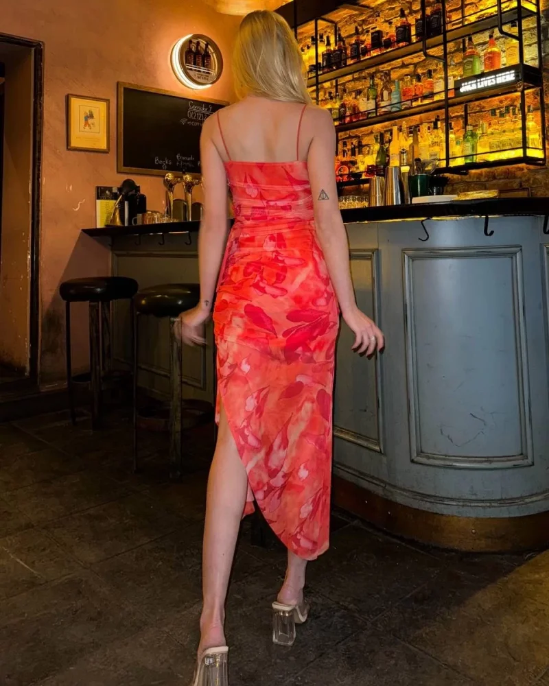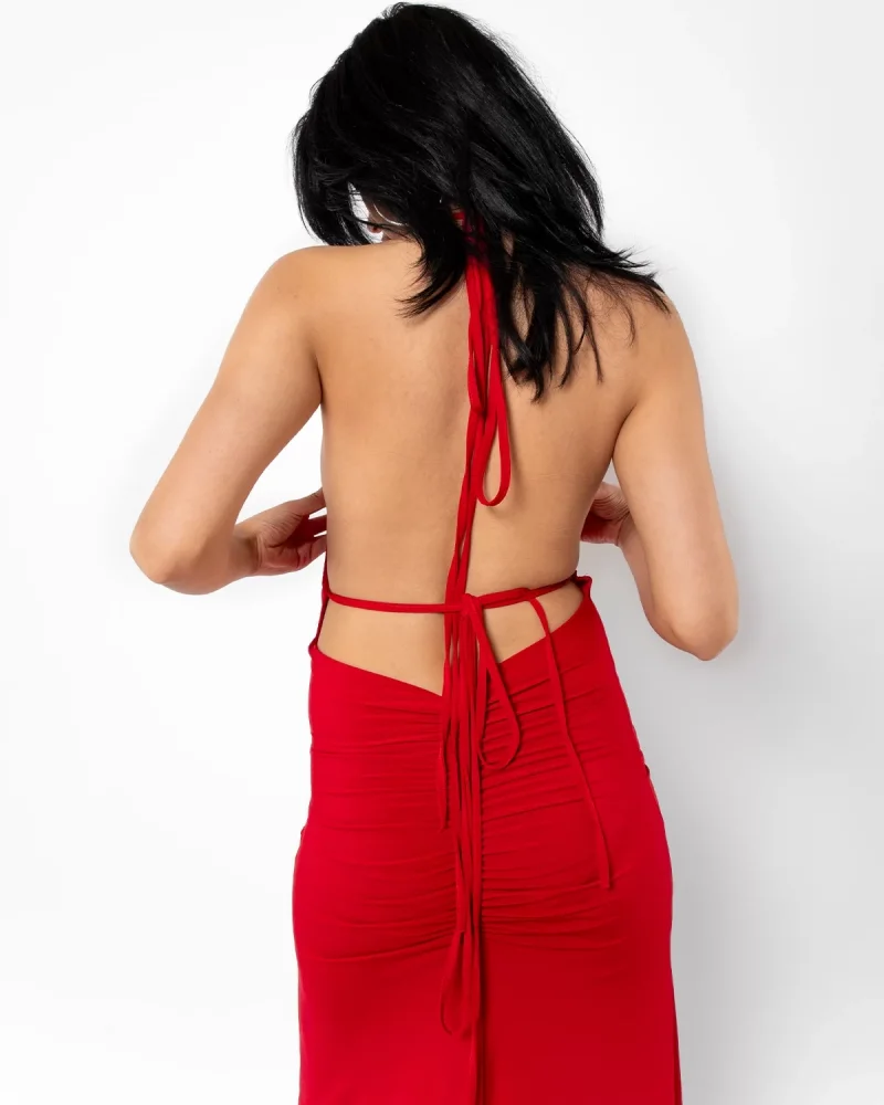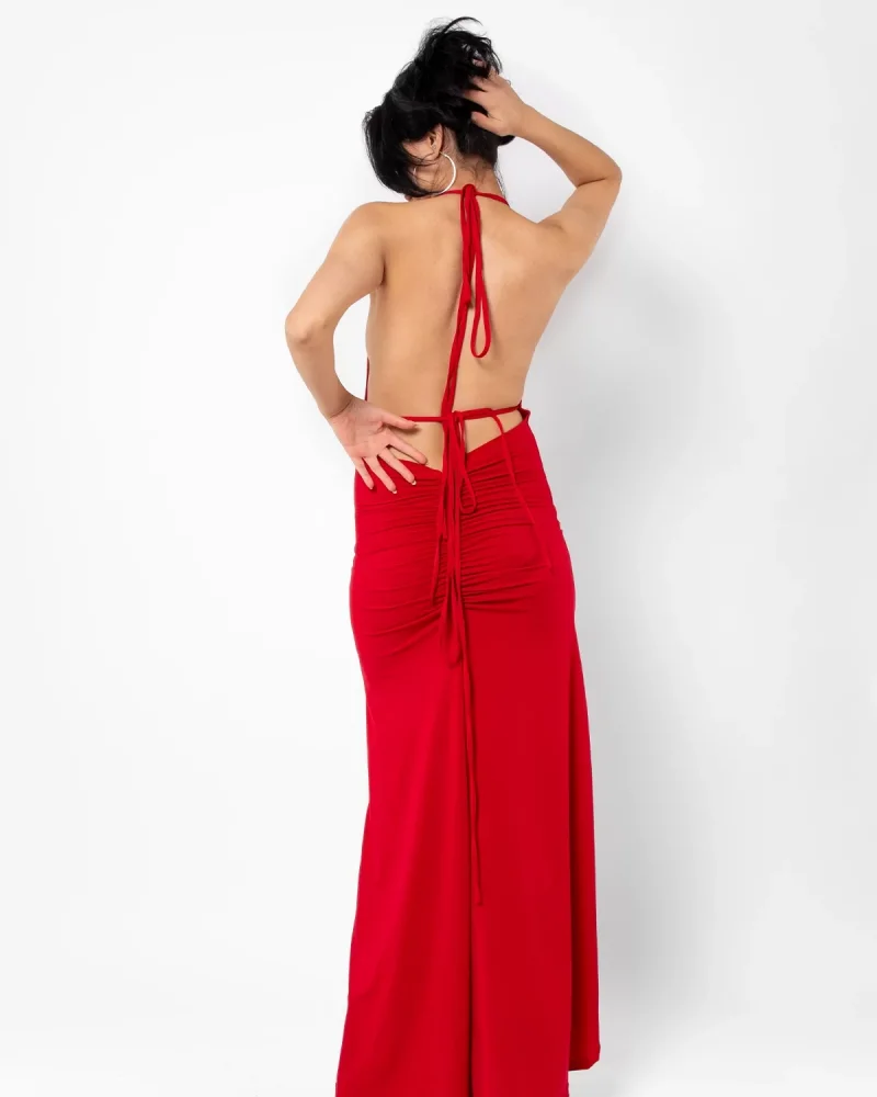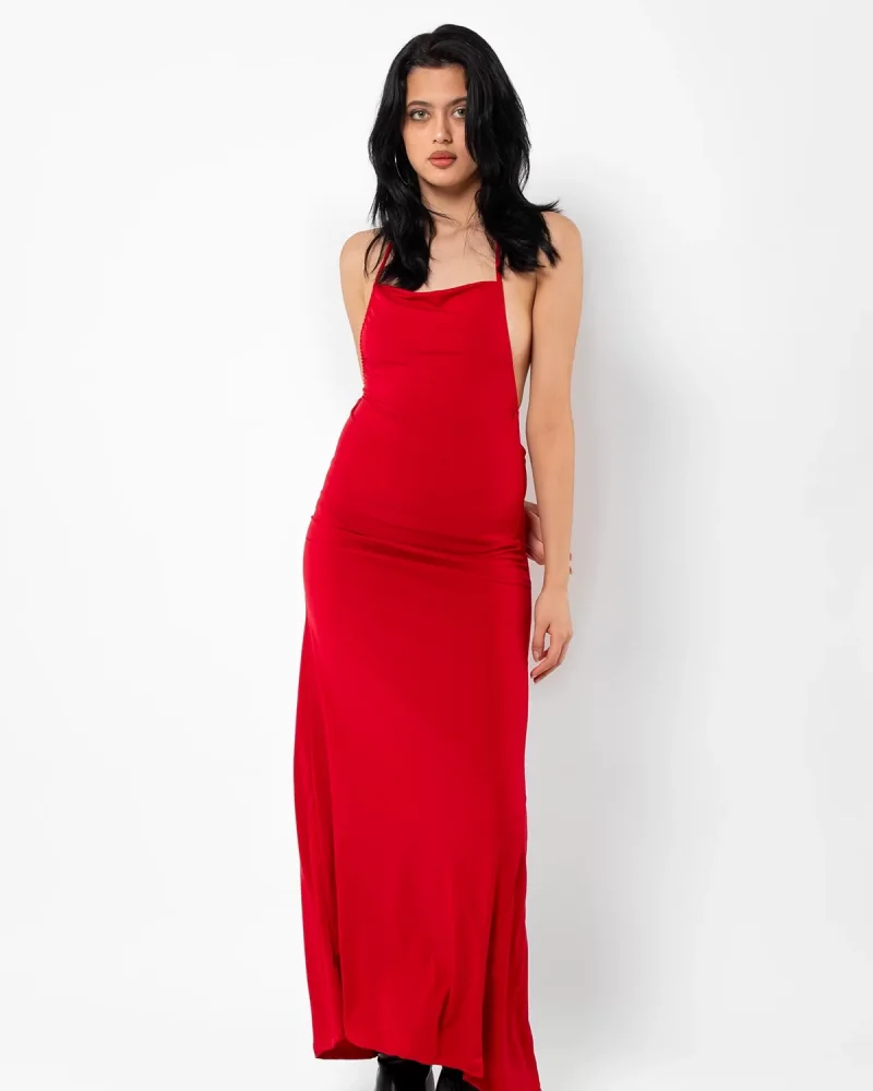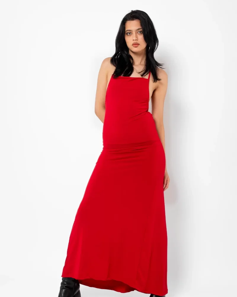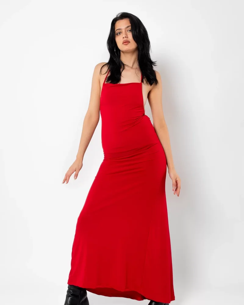 Ayar Askılı Uzun Sırt Dekolteli Kırmızı Elbise