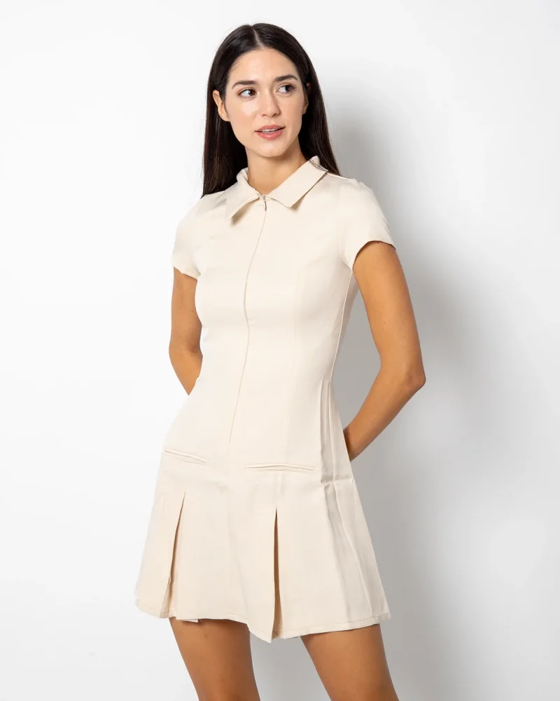 Bej Polo Yaka Cep Detaylı Pileli Mini Elbise