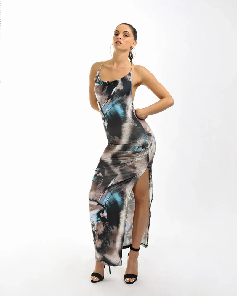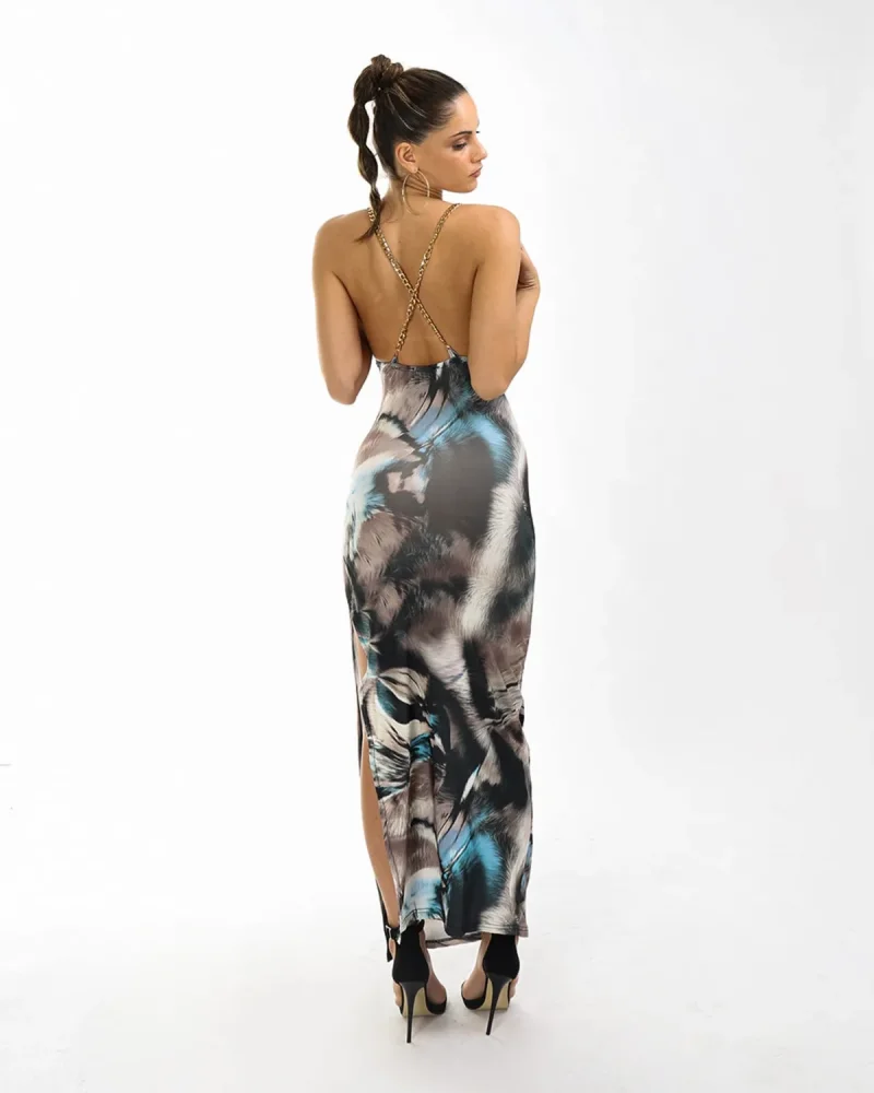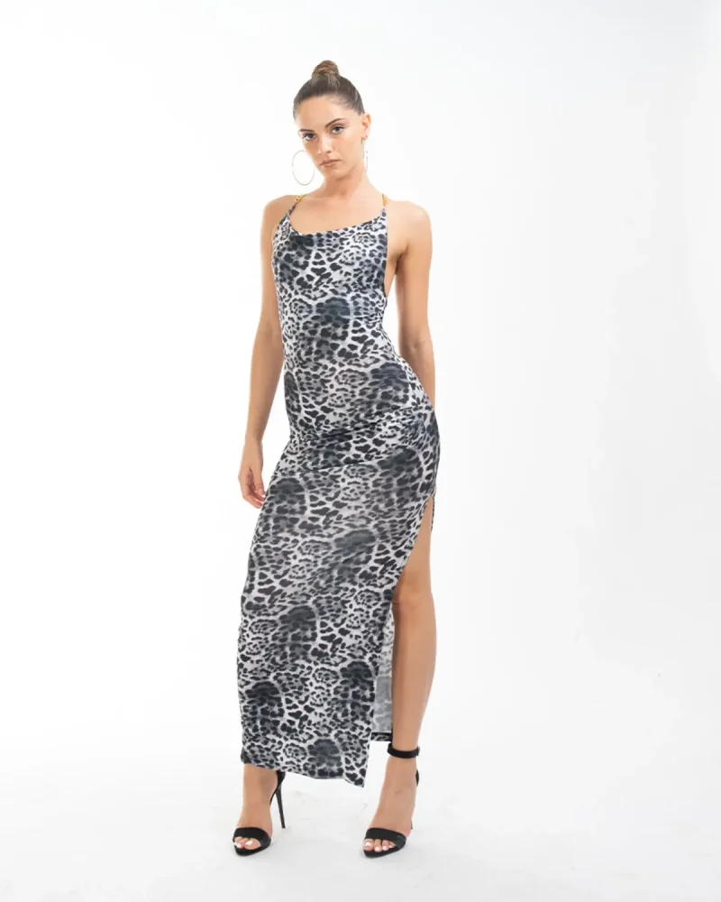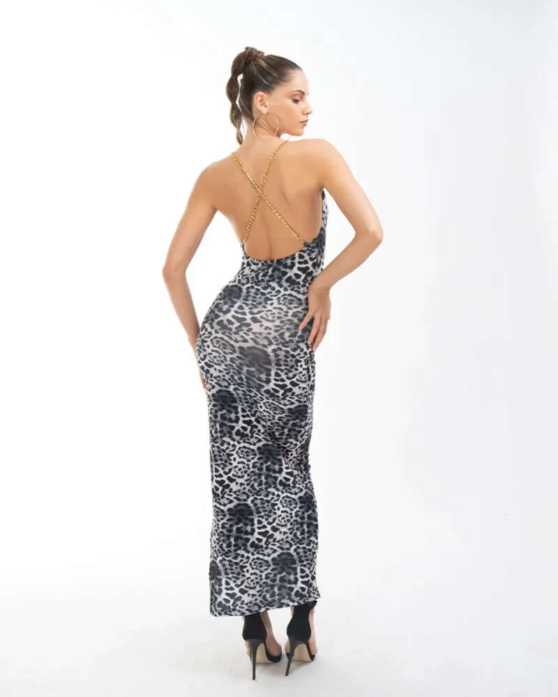 Degaje Yaka Zincir Askılı Maxi Boy Leopar Desenli Elbise