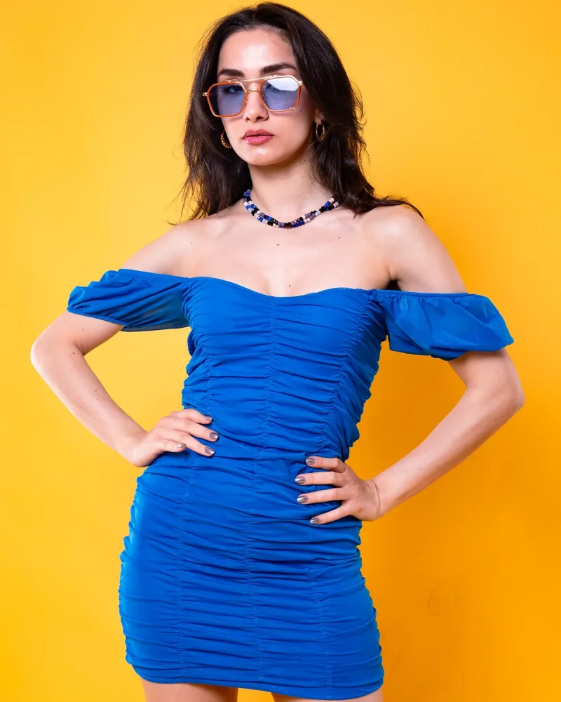 Fırfır Detaylı Omuz Dekolteli Mavi Mini Elbise