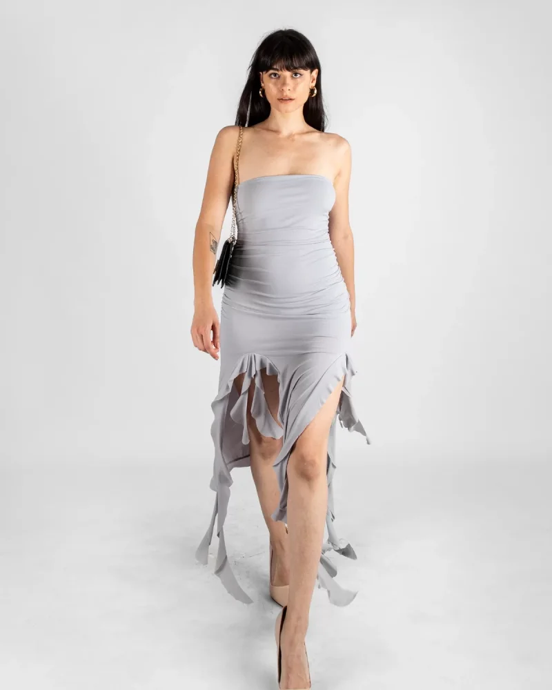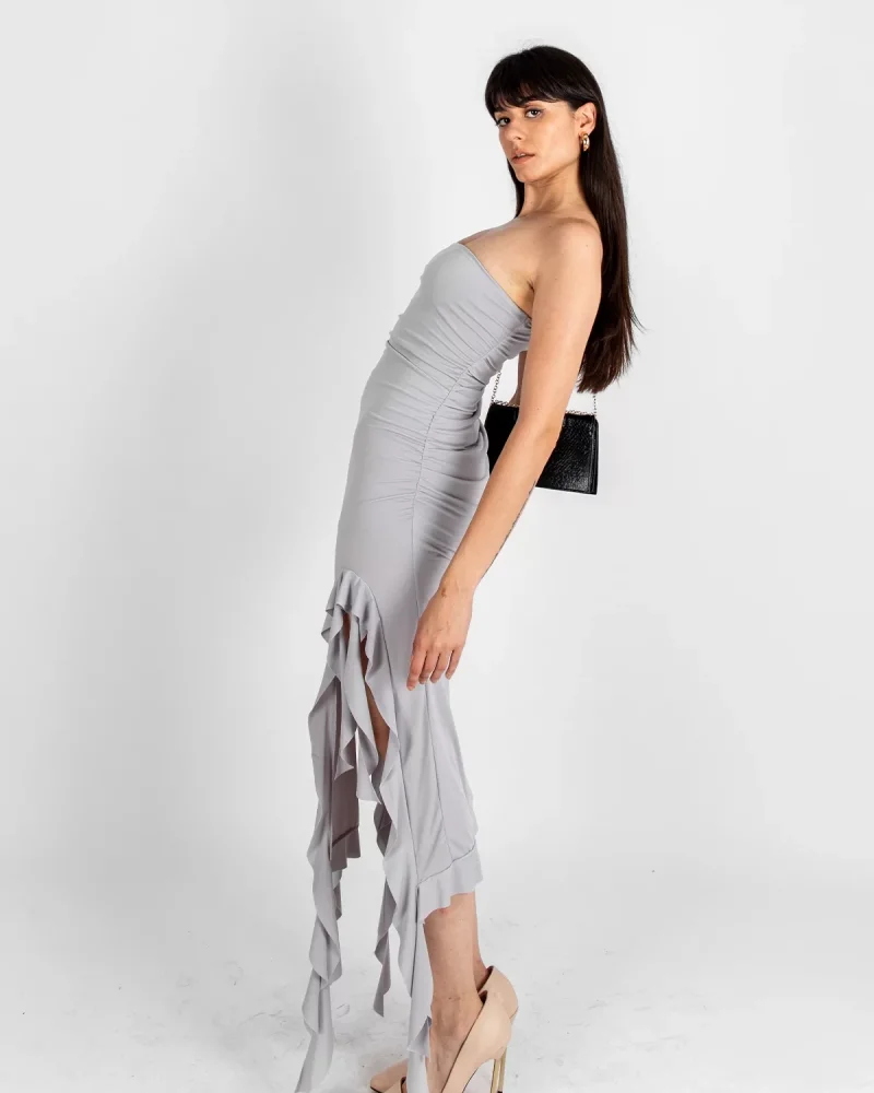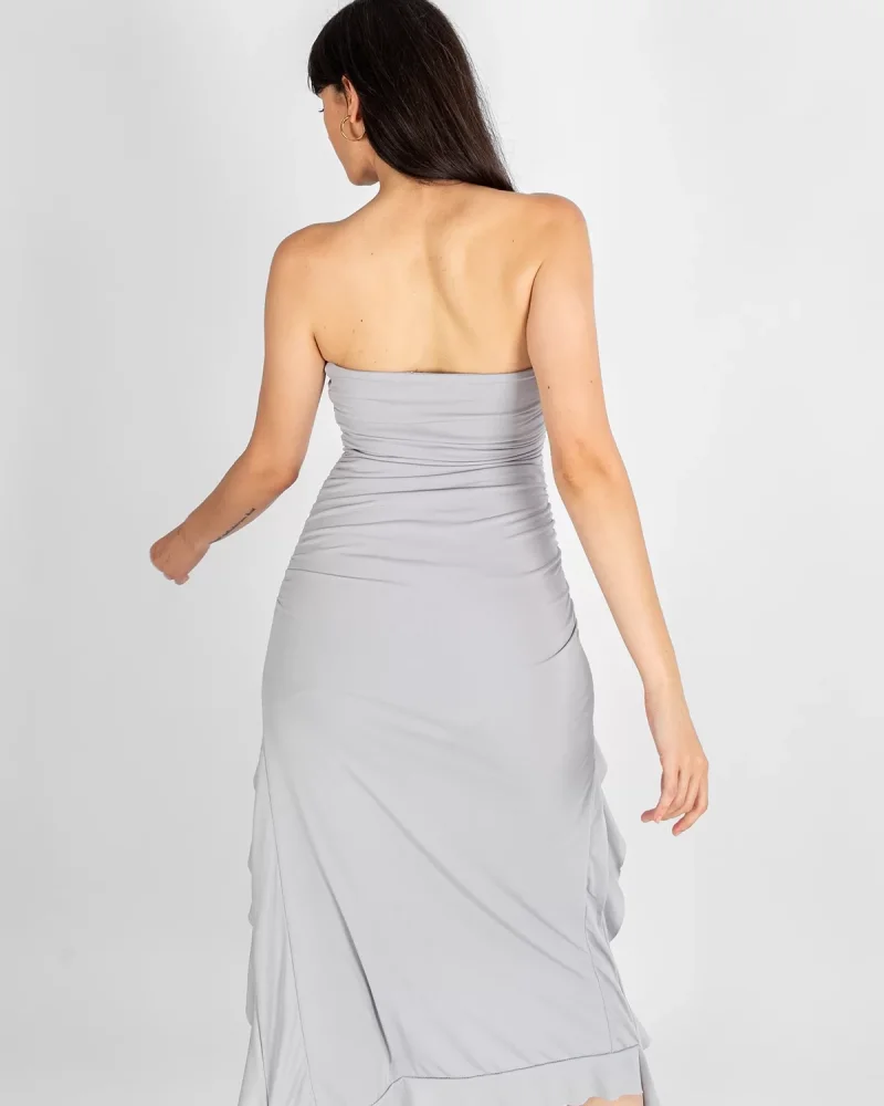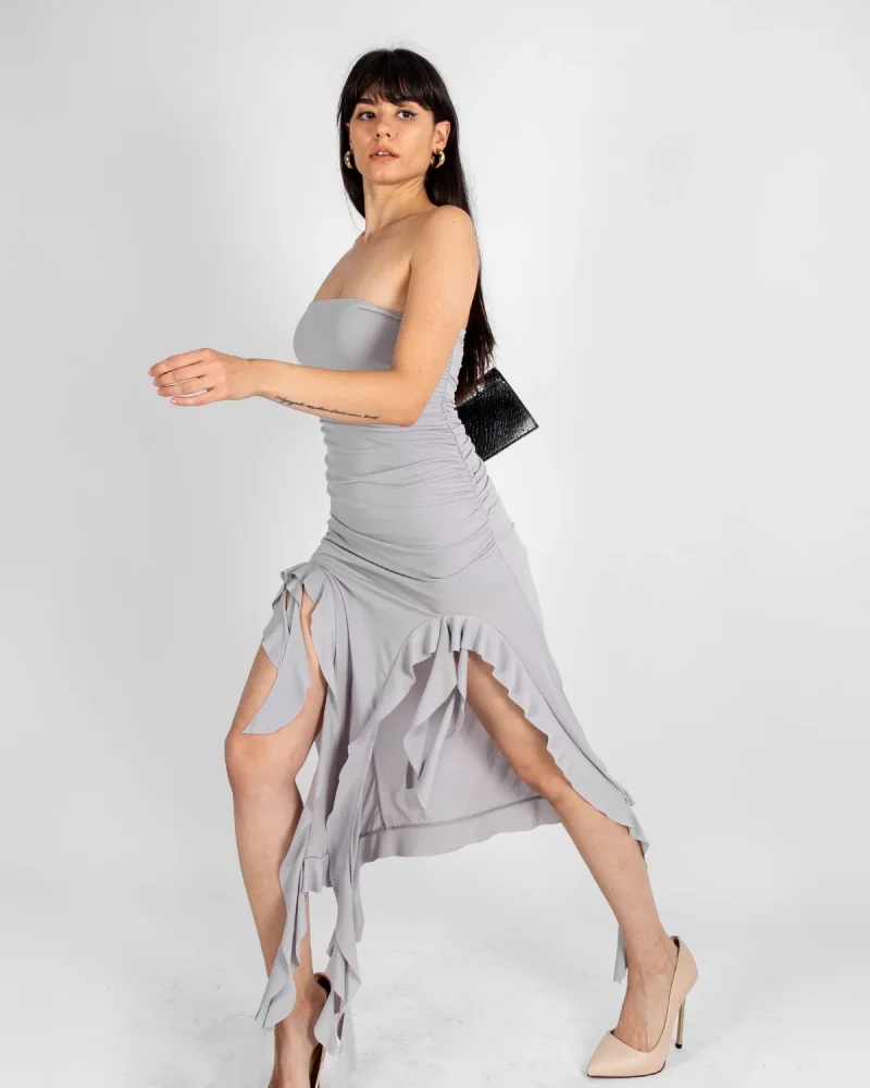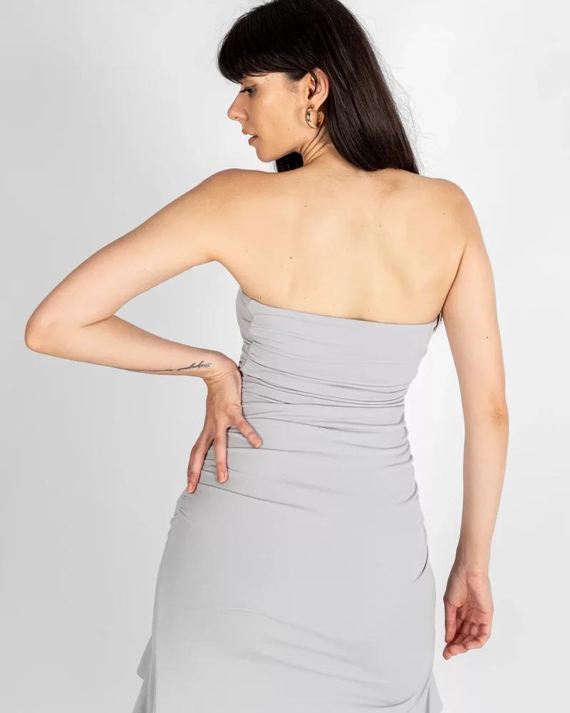 Fırfırlı Straplez Midi Boy Gri Elbise