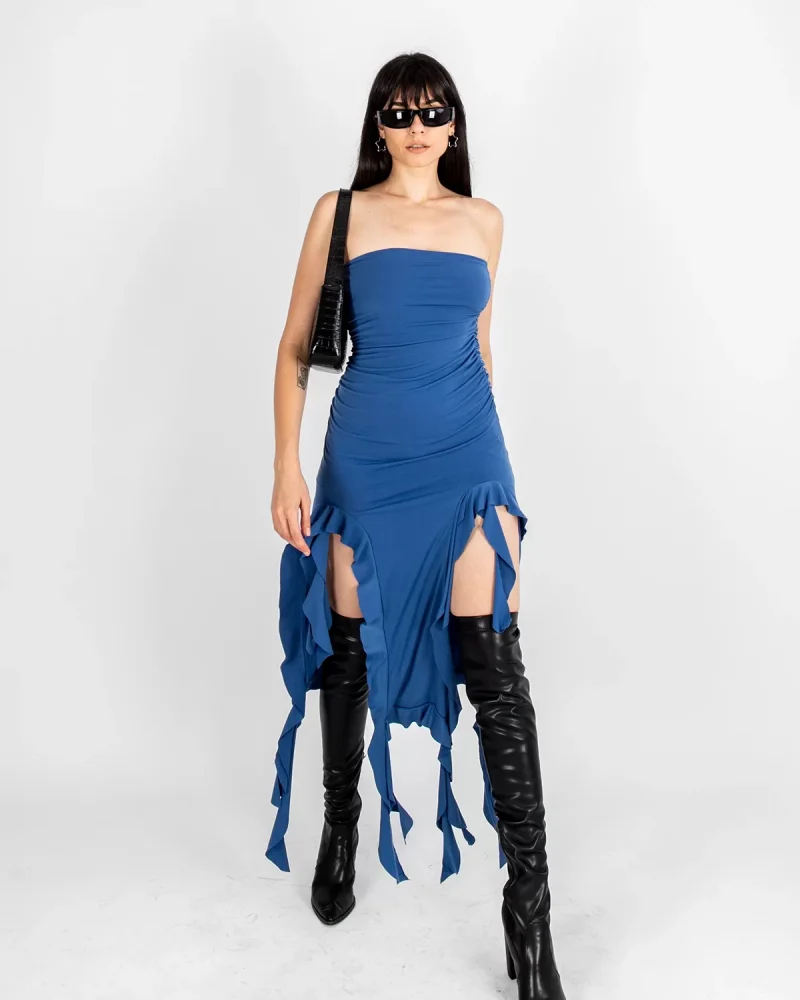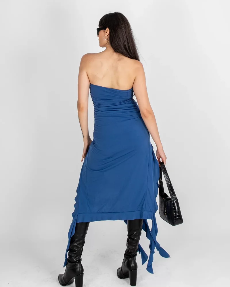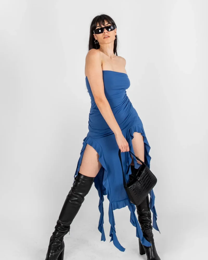 Fırfırlı Straplez Midi Boy Mavi Elbise