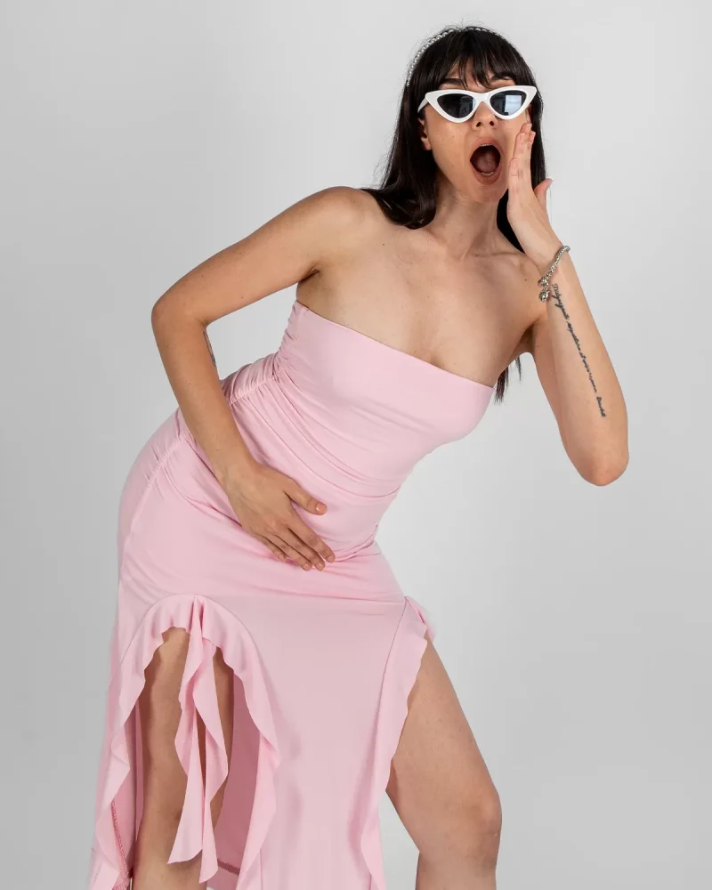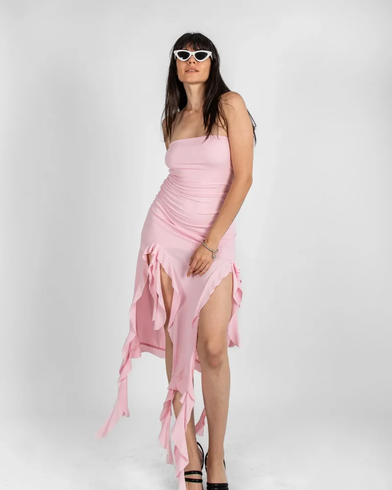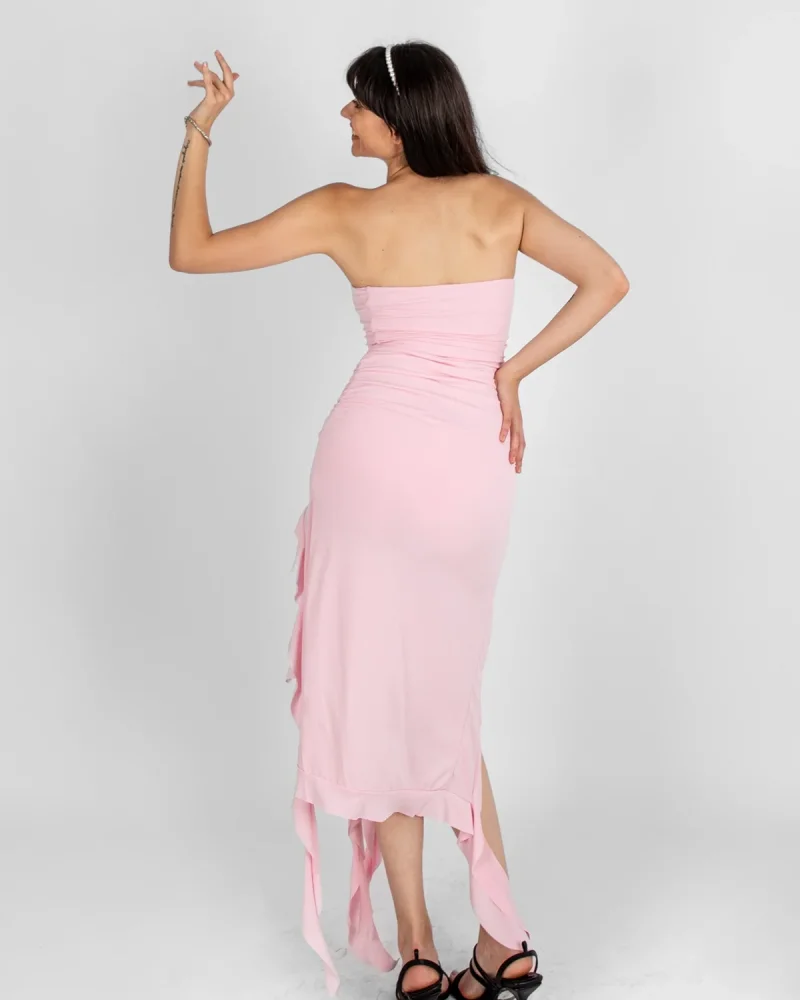 Fırfırlı Straplez Midi Boy Pembe Elbise