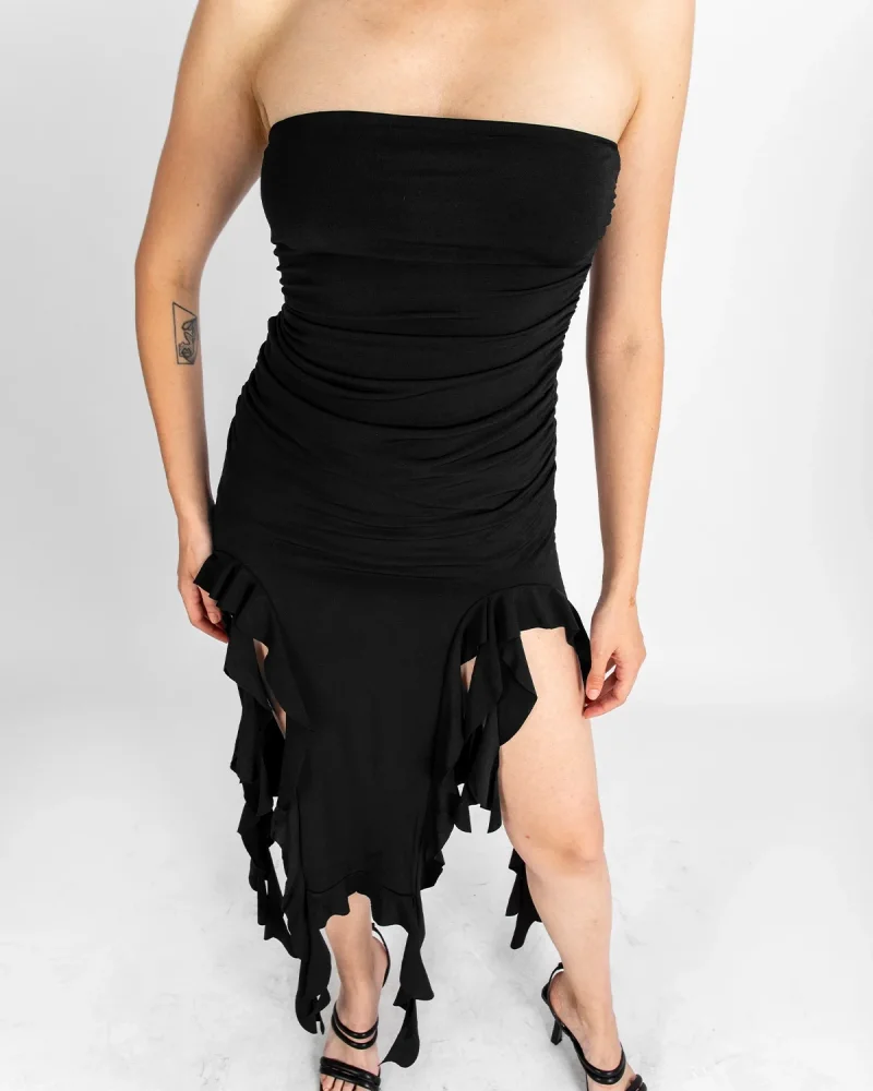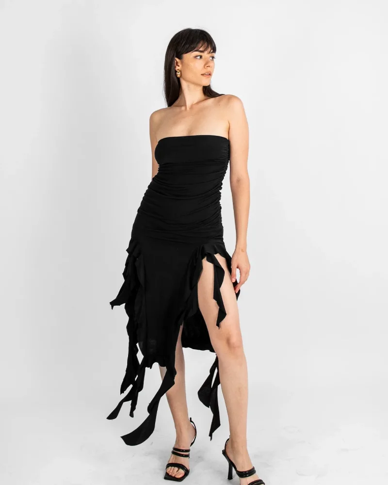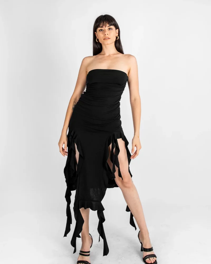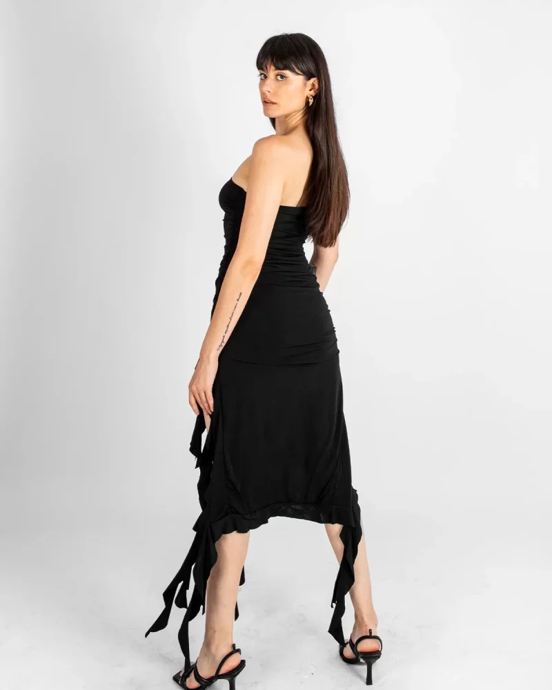 Fırfırlı Straplez Midi Boy Siyah Elbise