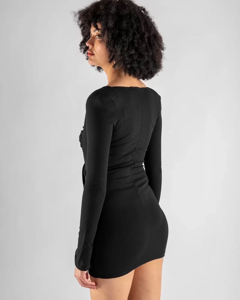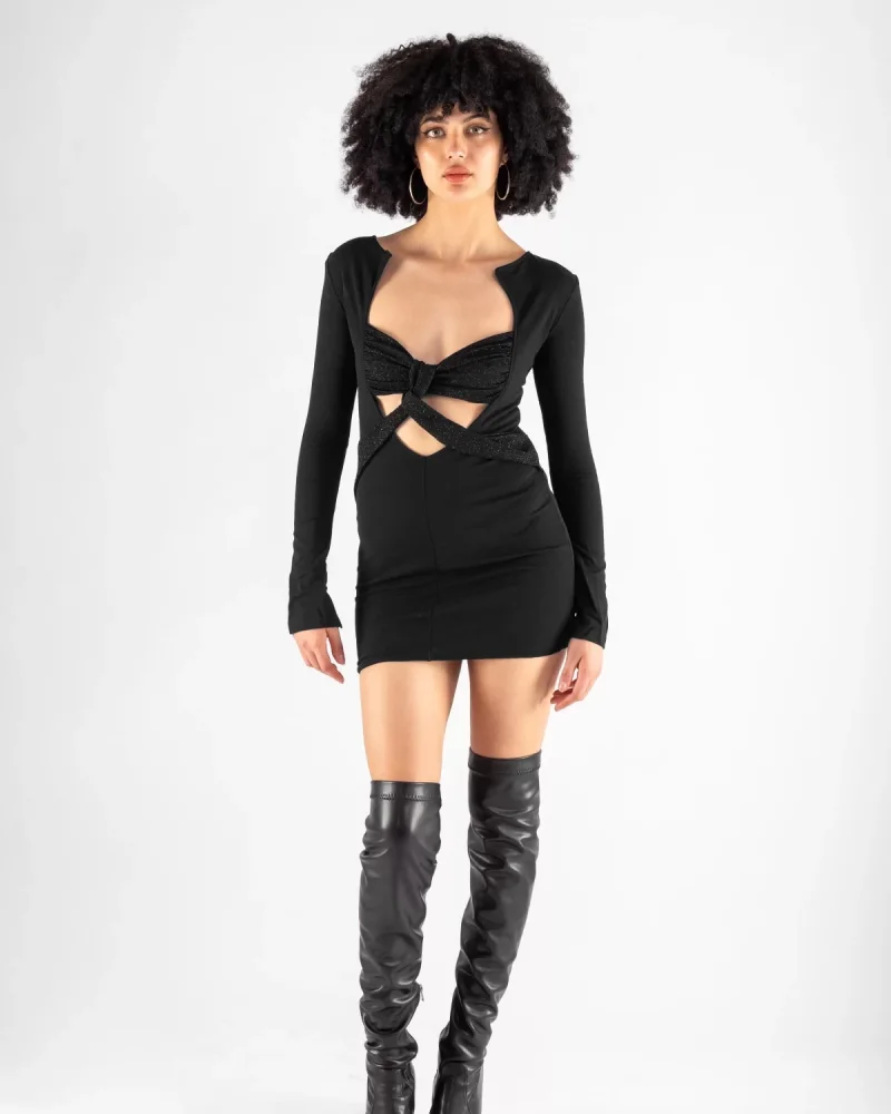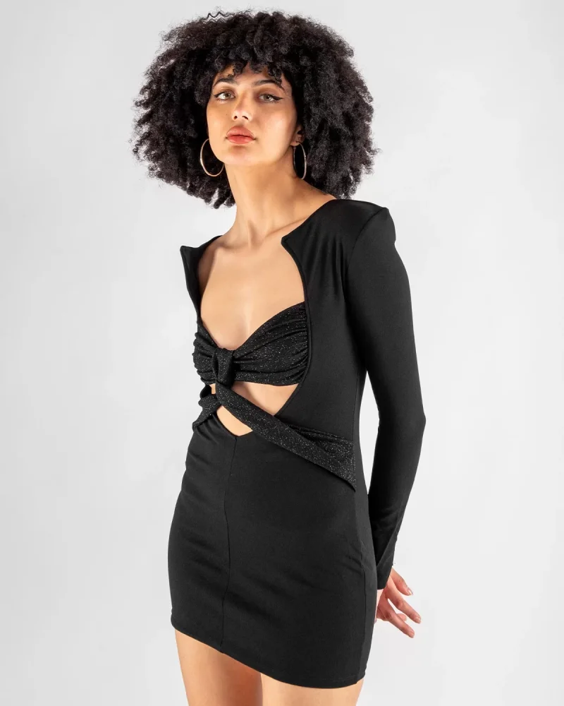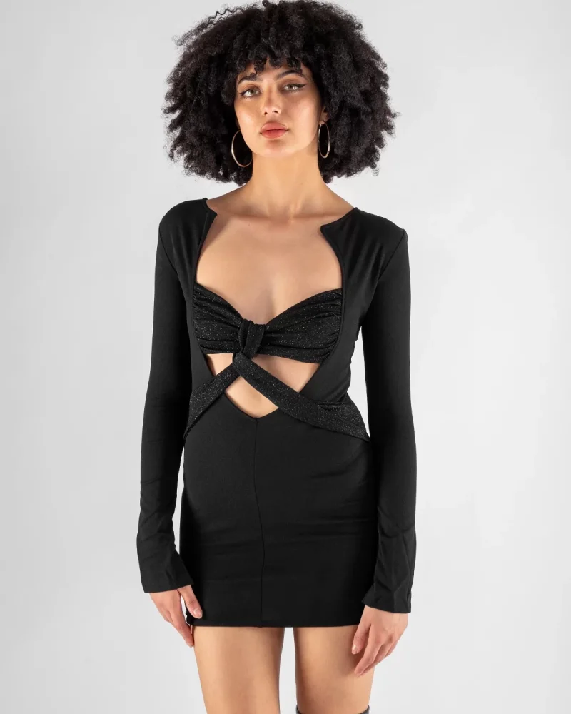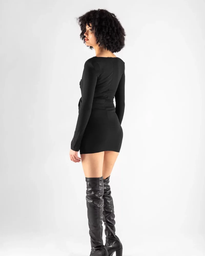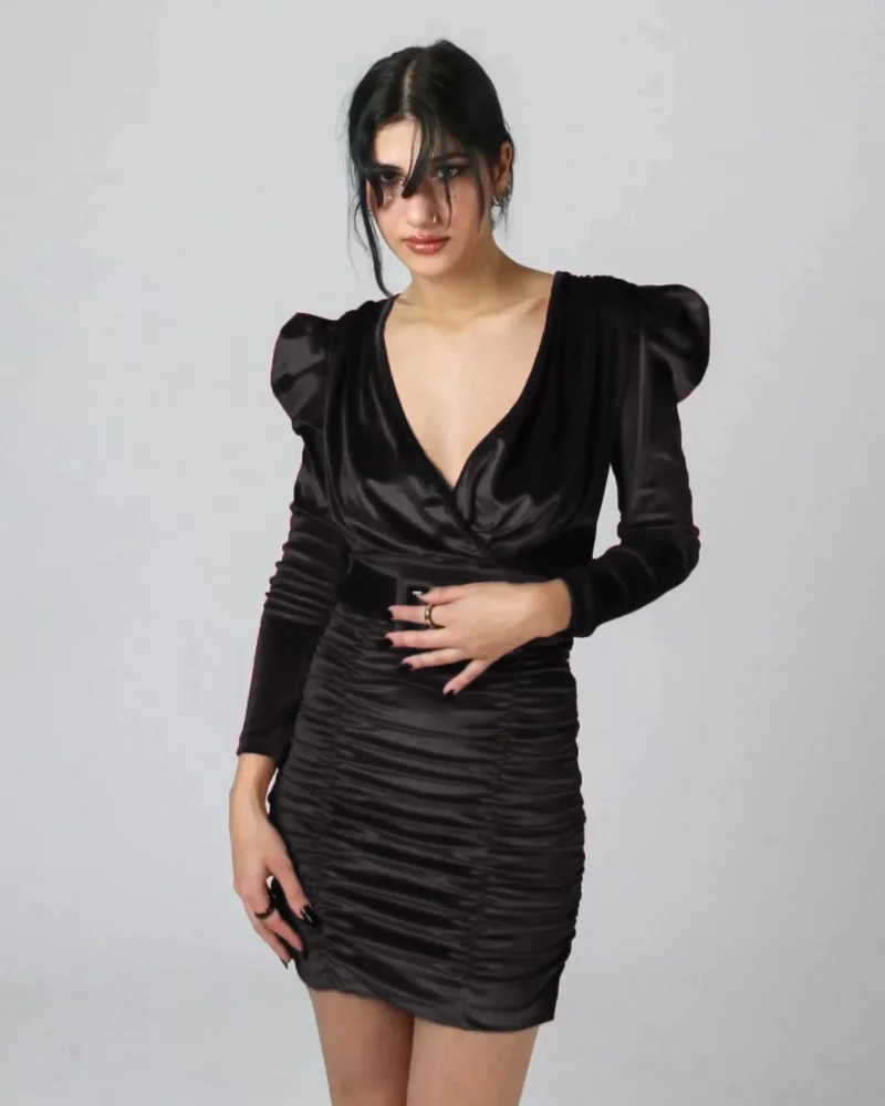 Saten Kadife Kemer Detaylı Göğüs Dekolteli Uzun Kollu Siyah Elbise