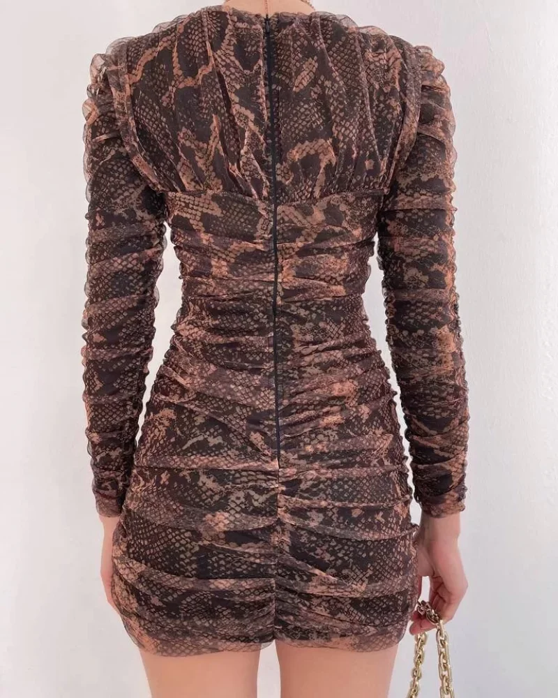 Kahve Yılan Desenli Fermuarlı Tül Detaylı Mini Elbise