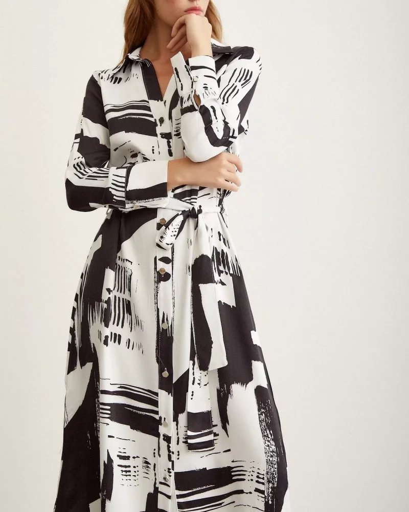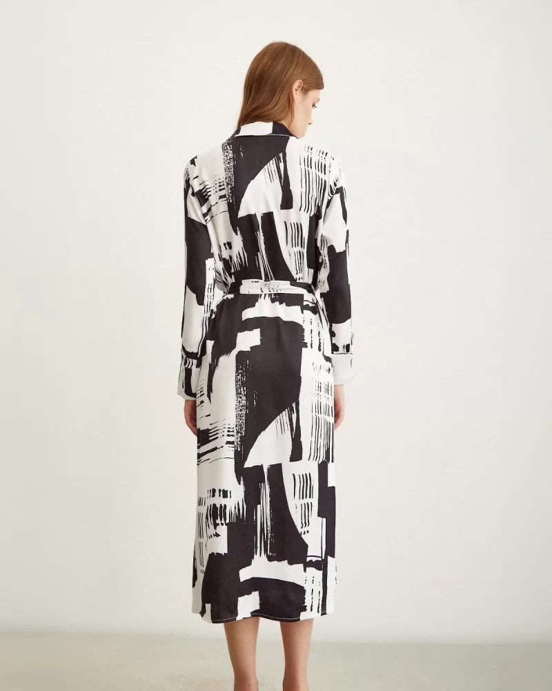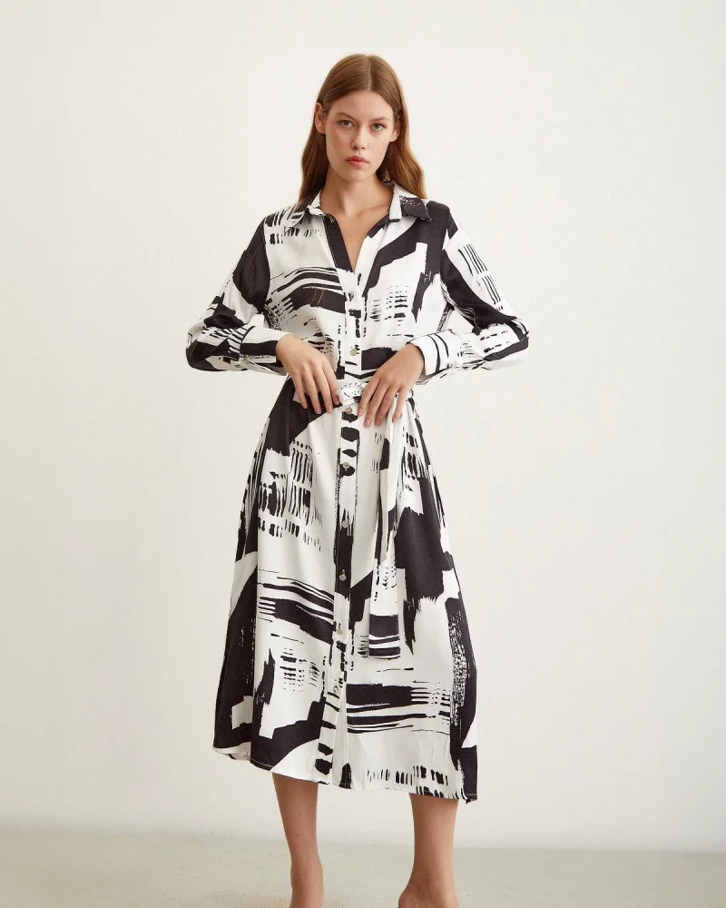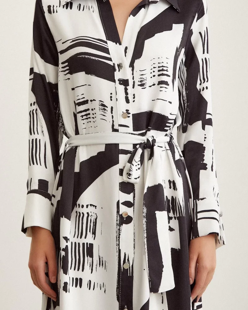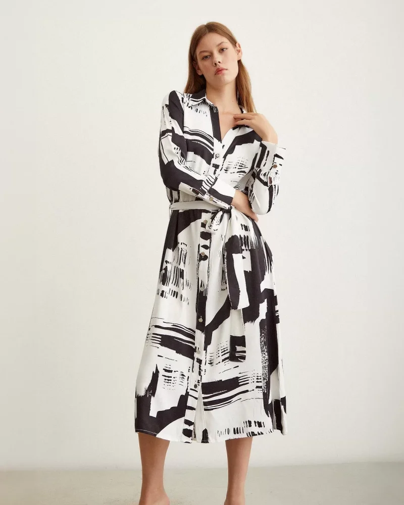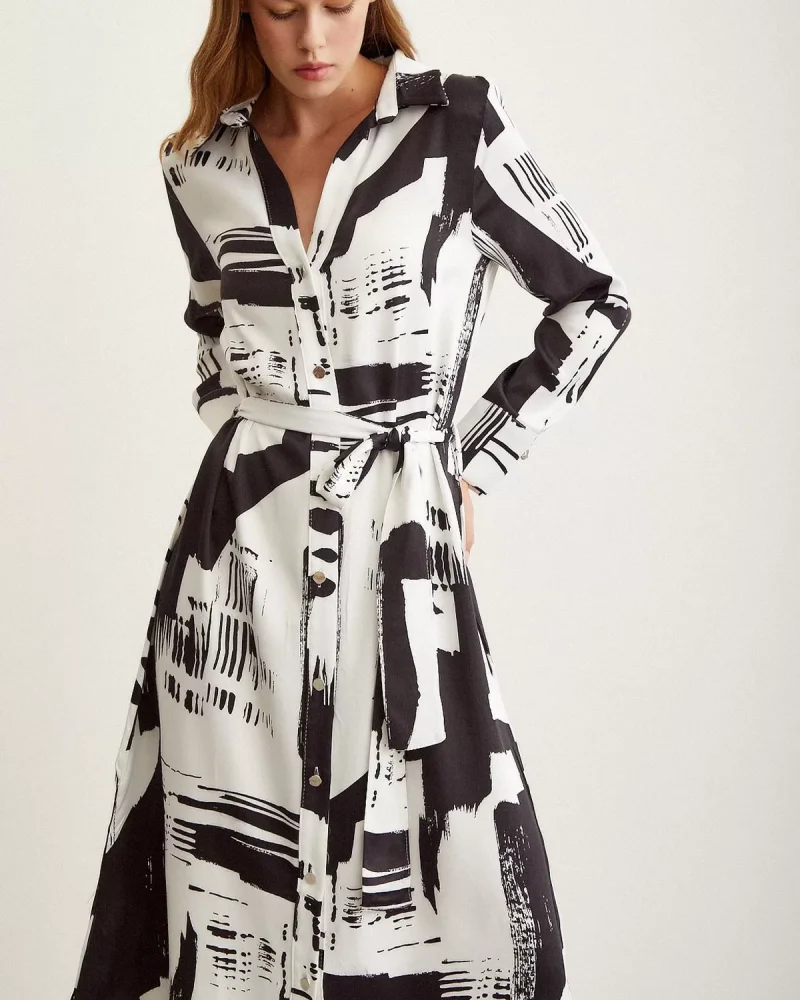 Önden Düğmeli Desenli Siyah Gömlek Elbise