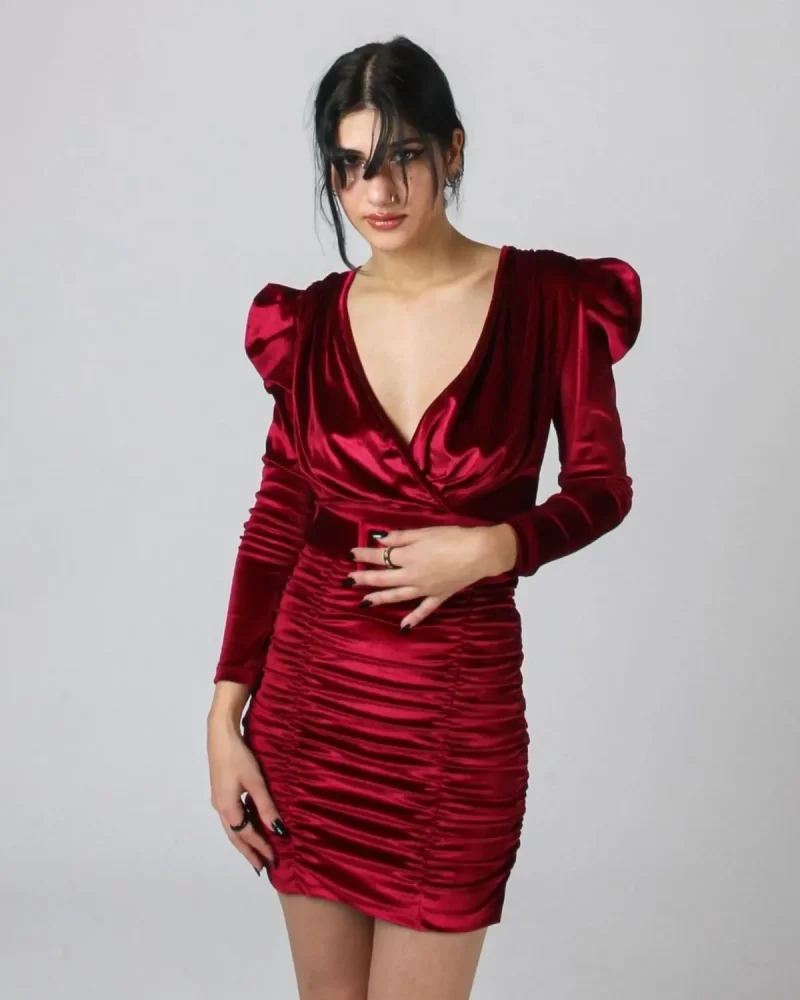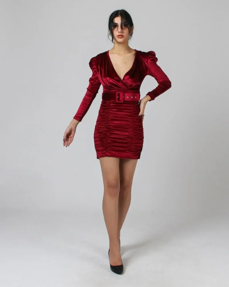 Saten Kadife Kemer Detaylı Göğüs Dekolteli Uzun Kollu Bordo Elbise