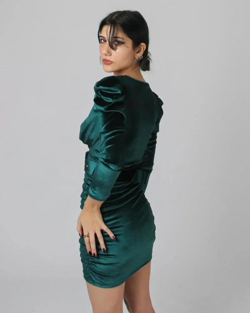 Saten Kadife Kemer Detaylı Göğüs Dekolteli Uzun Kollu Yeşil Elbise