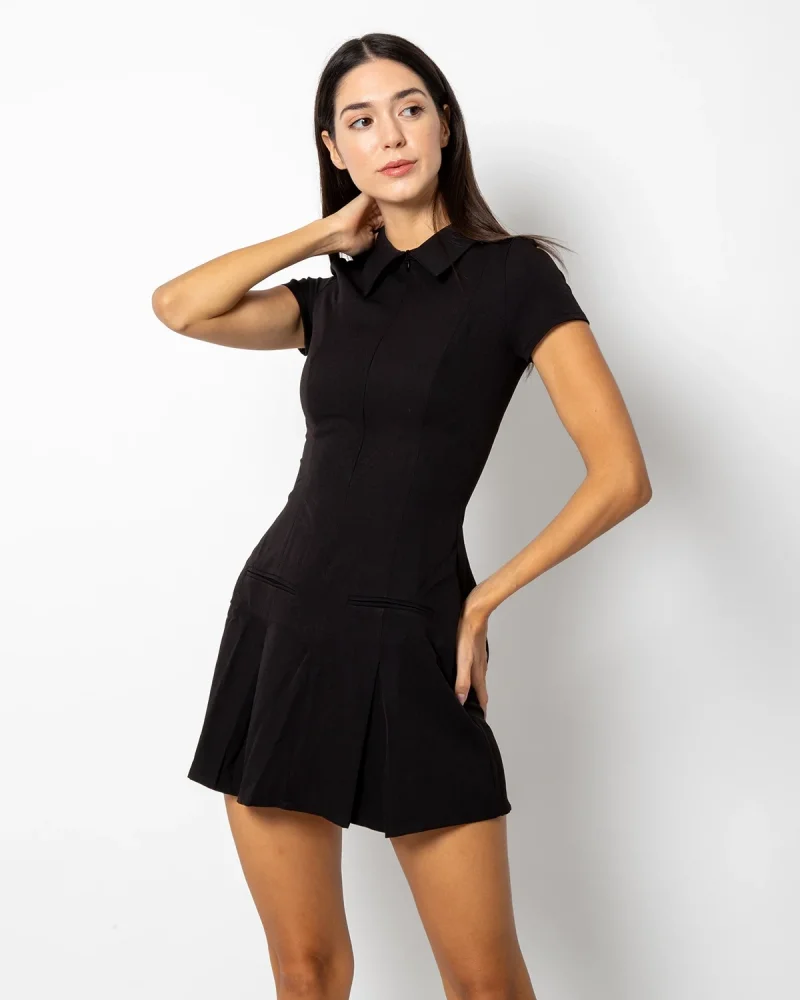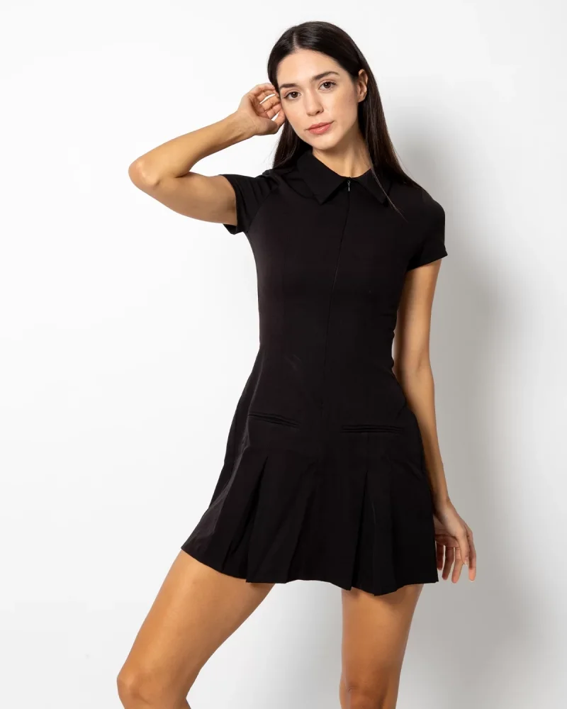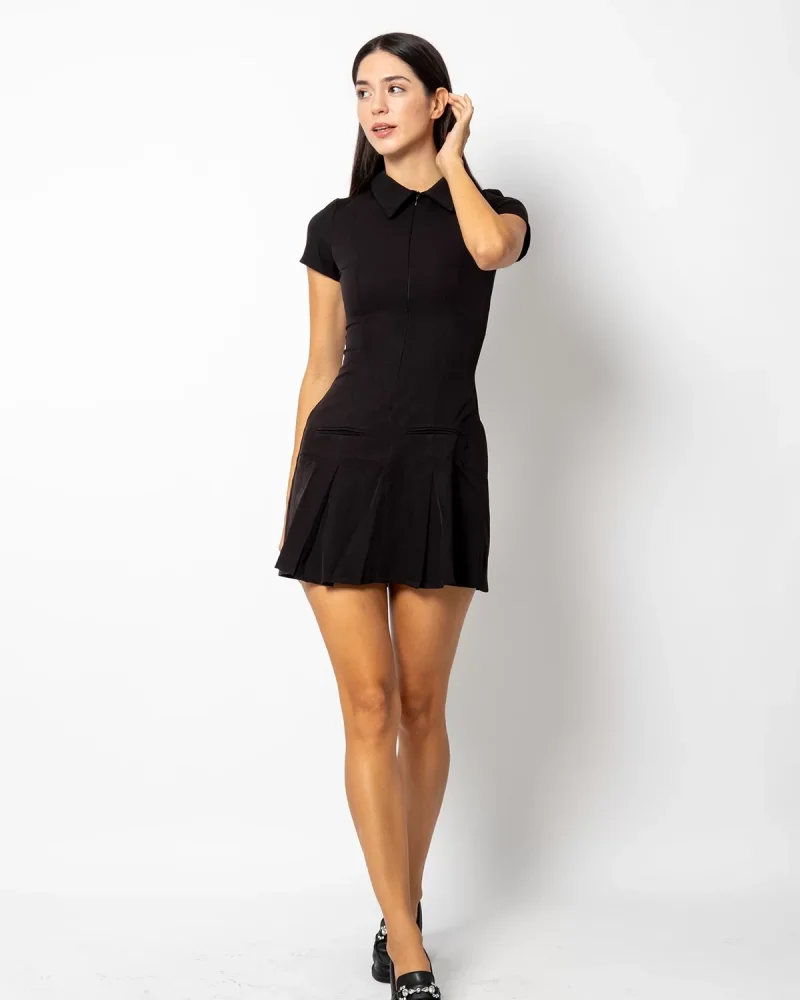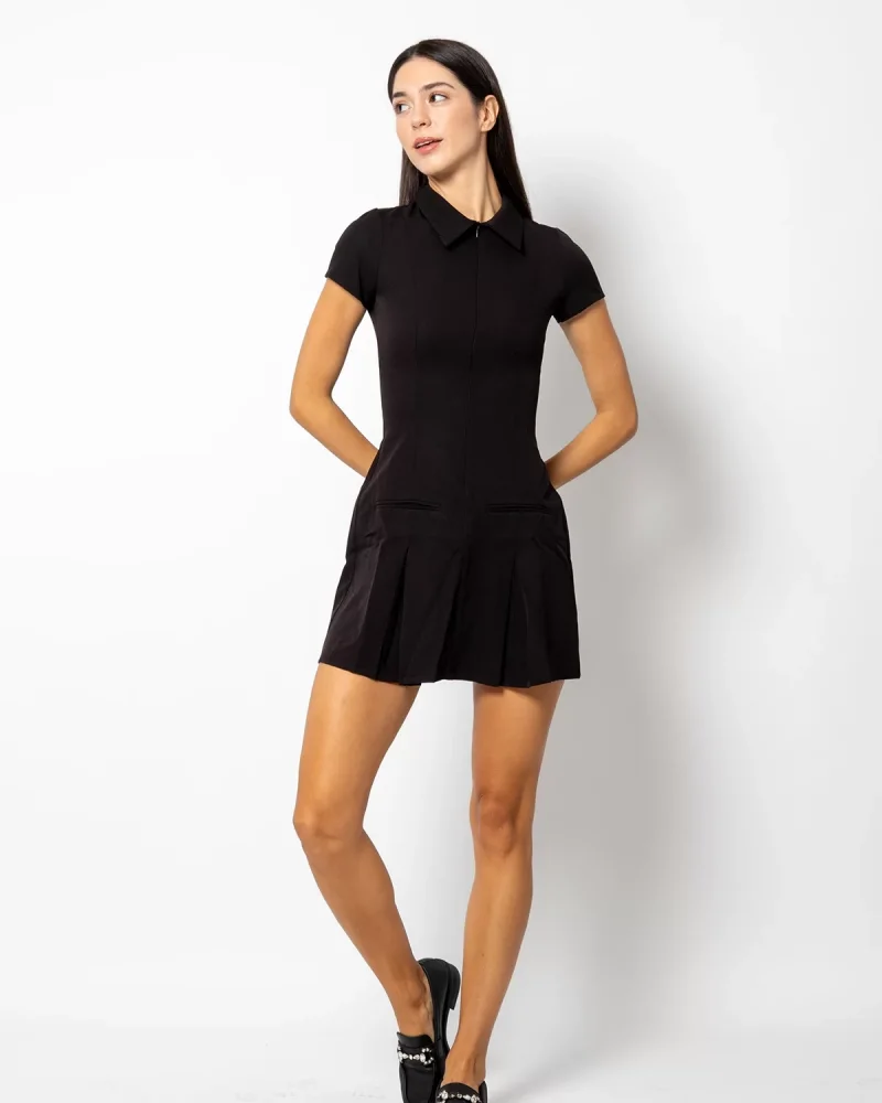 Siyah Polo Yaka Cep Detaylı Pileli Mini Elbise
