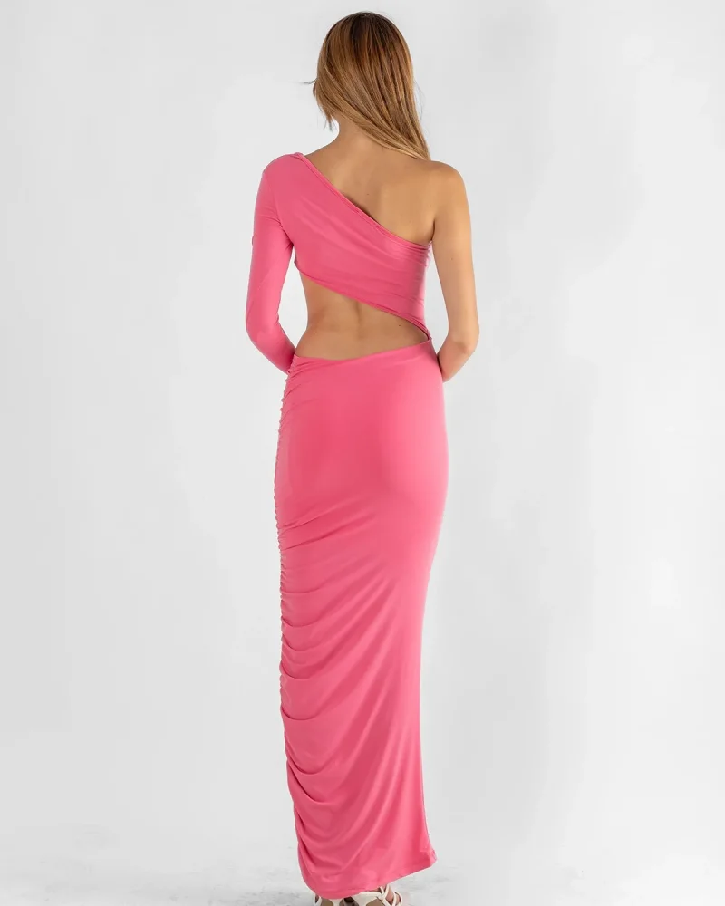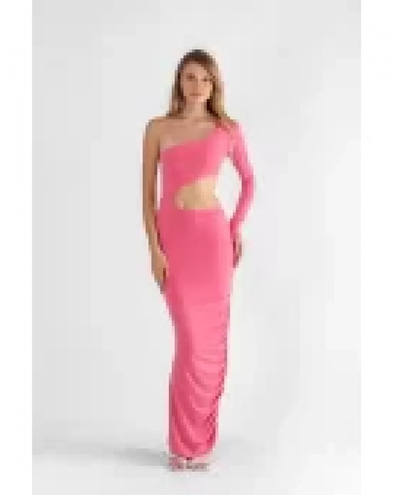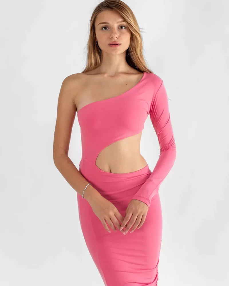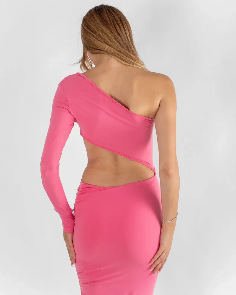 Tek Kol Bel Dekolteli Büzgülü Pembe Elbise
