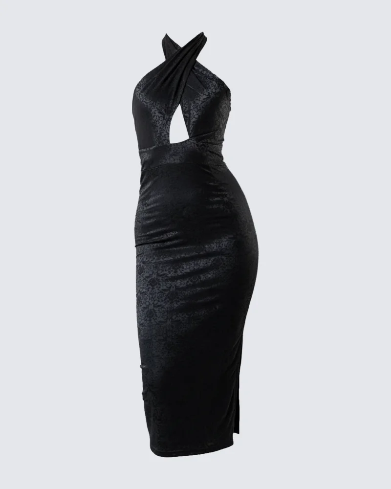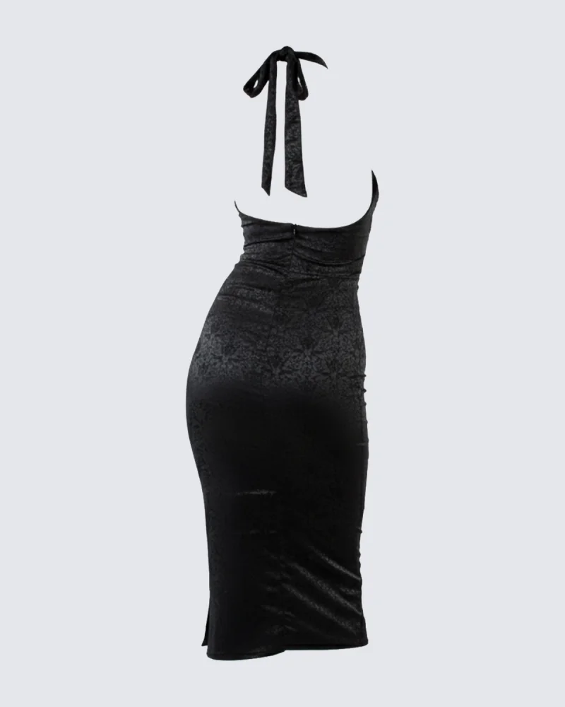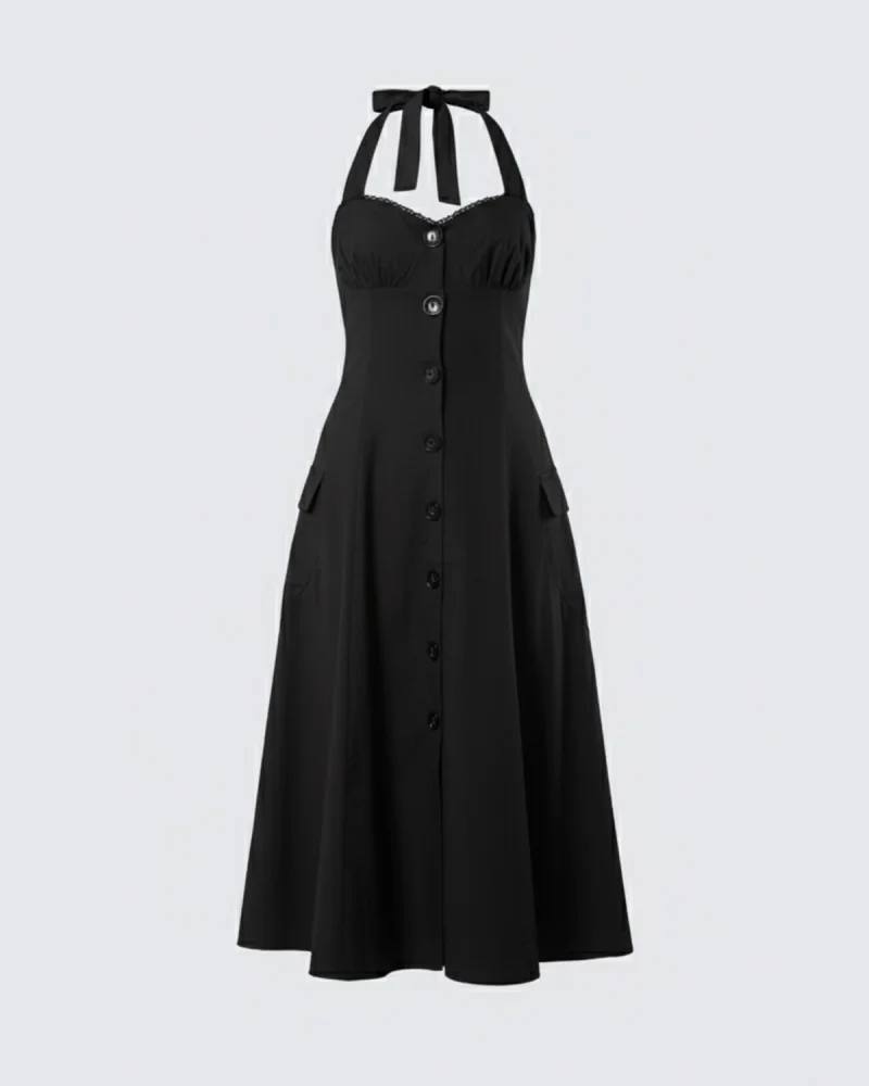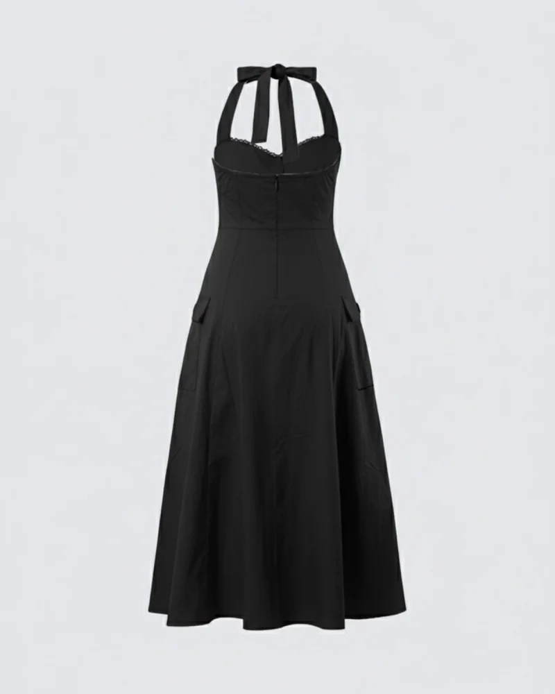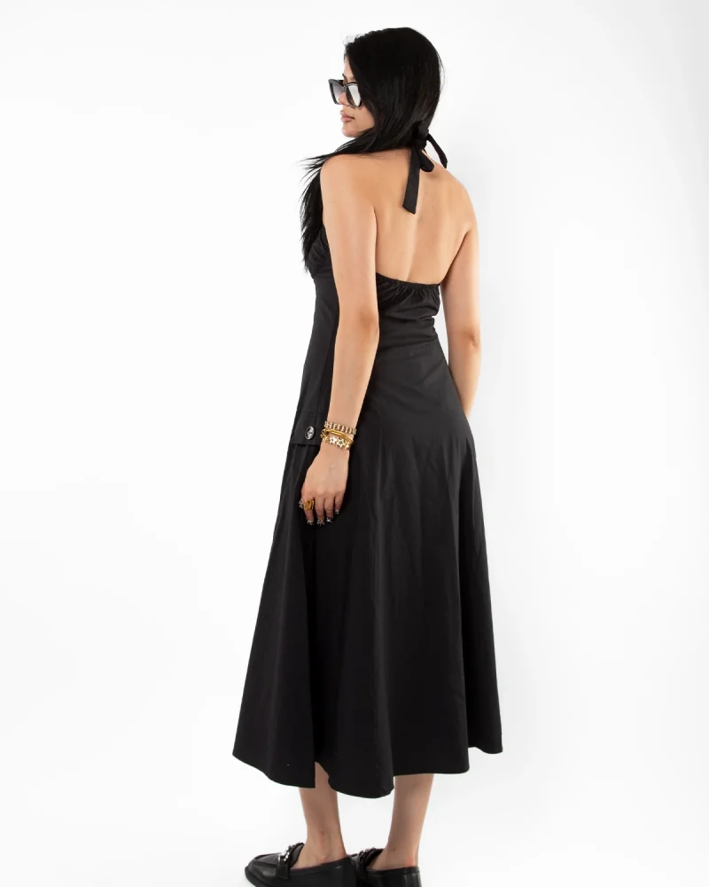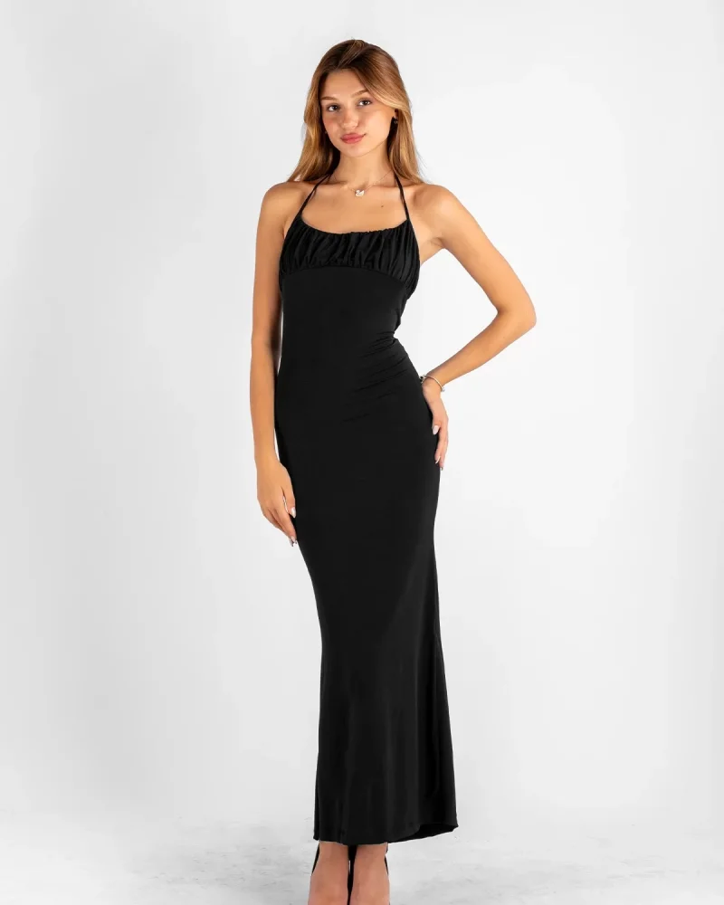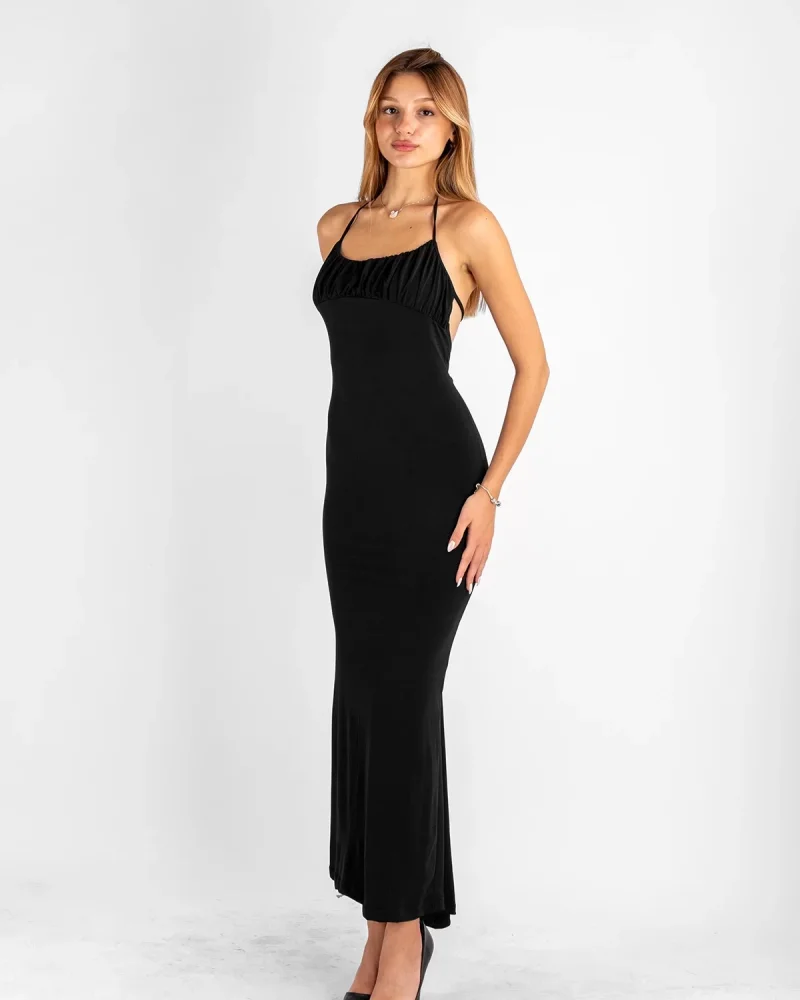 Sırt Dekolteli Asklı Midi Boy Siyah Elbise