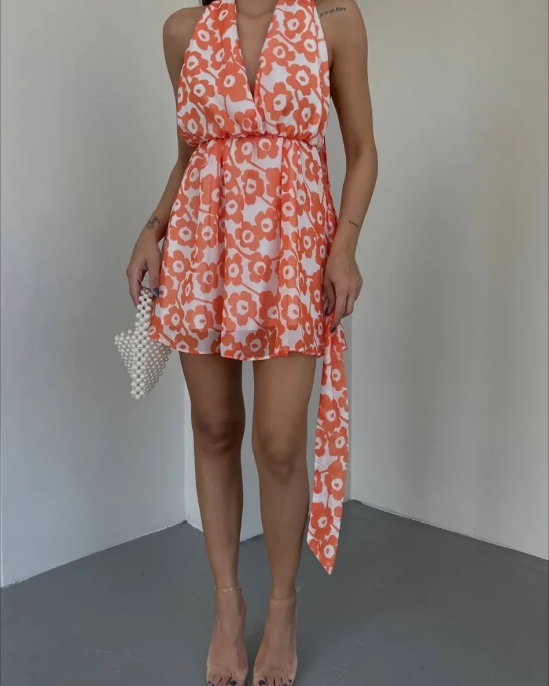 Çiçek Desenli Bağlamalı Göğüs Dekolteli Turuncu Mini Elbise