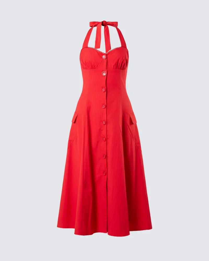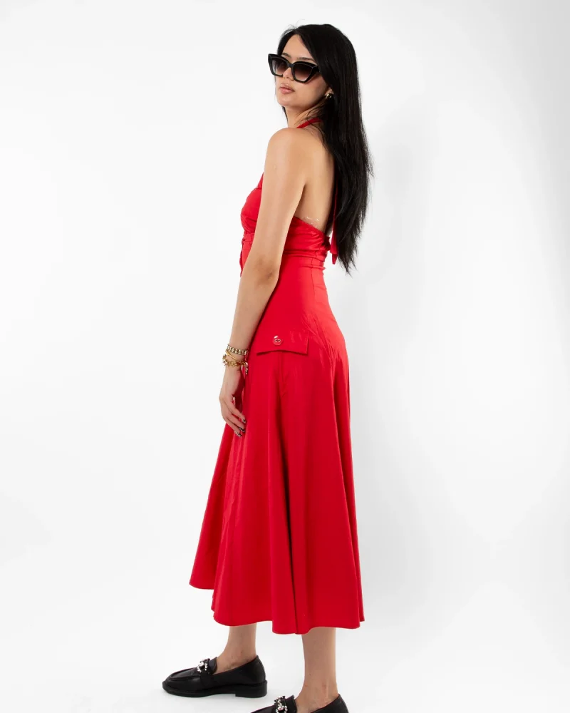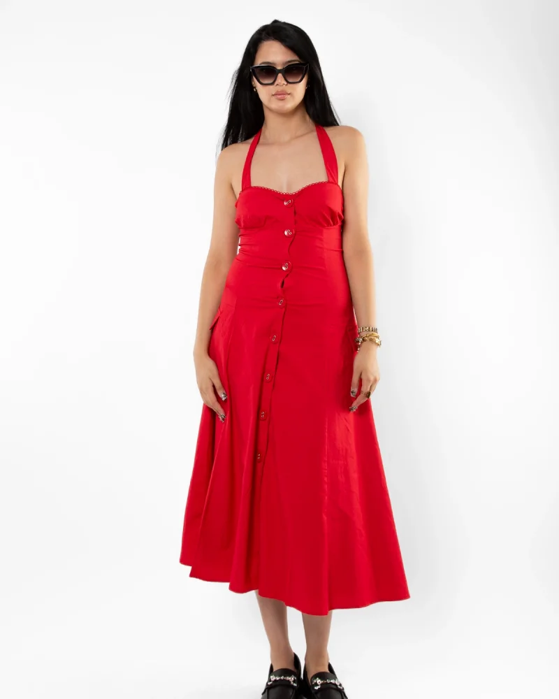 Düğmeli Kırmızı Poplin Elbise