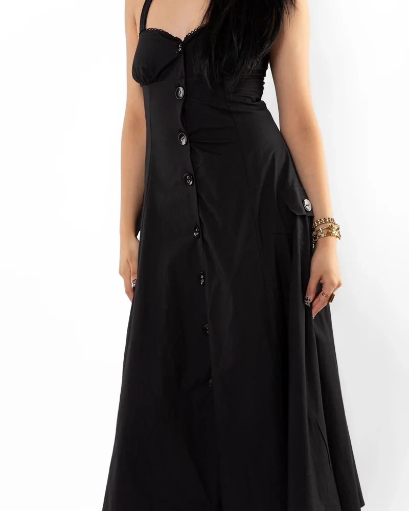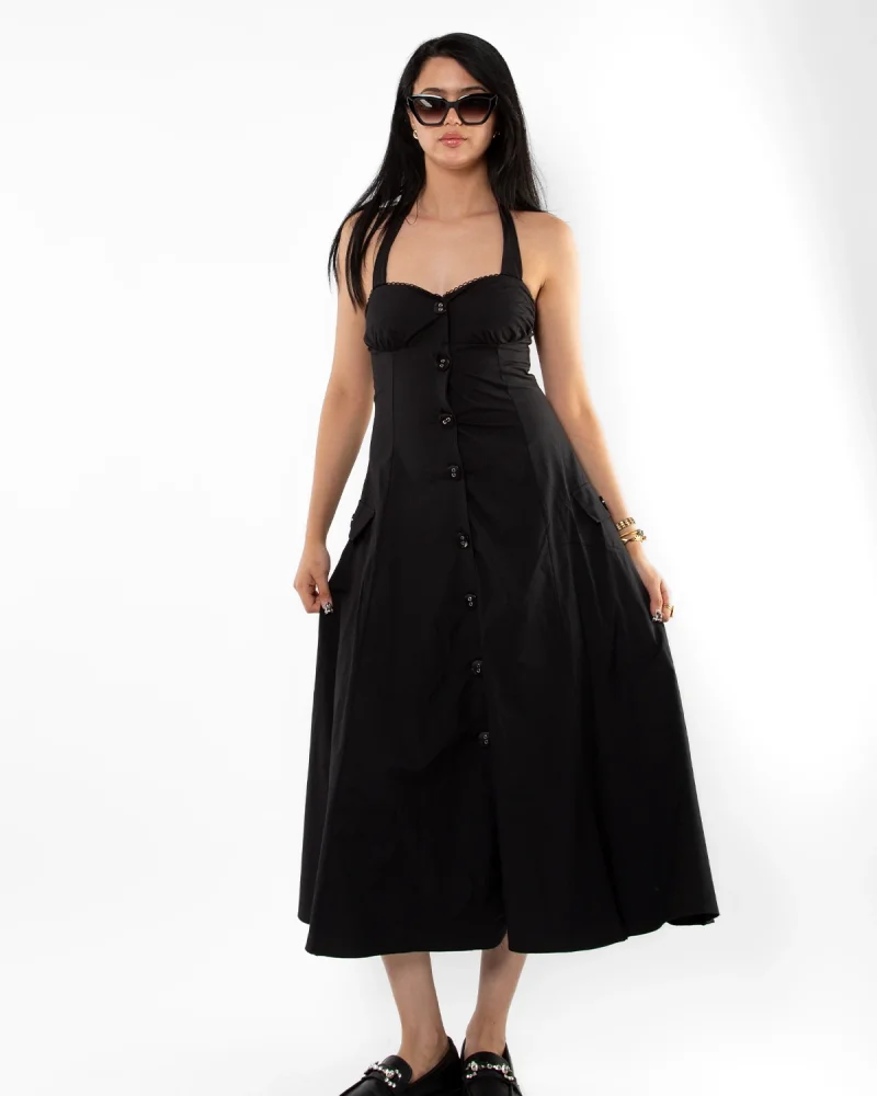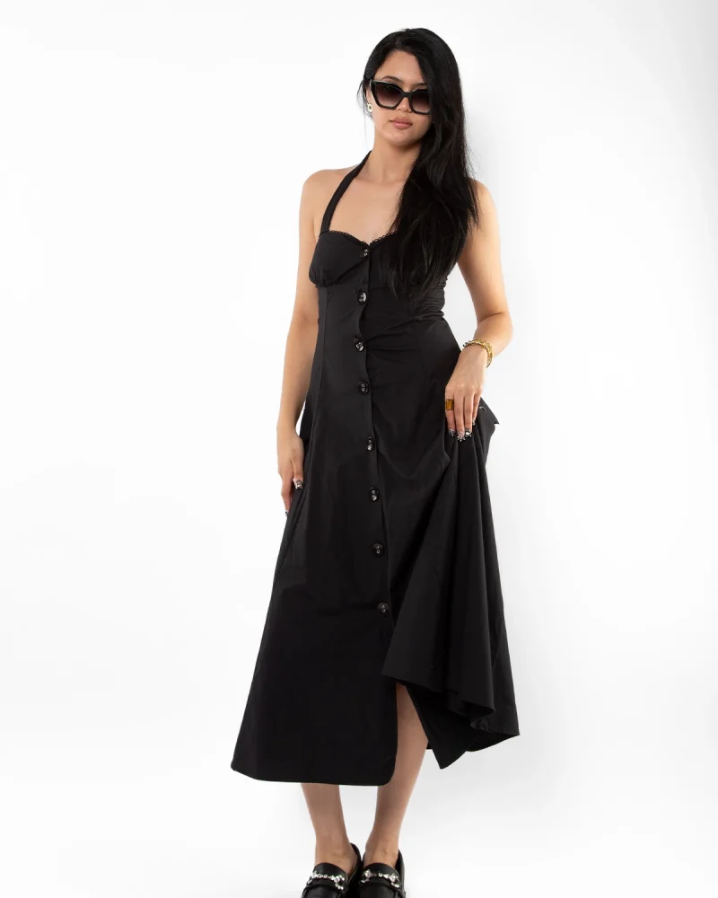Düğmeli Siyah Poplin Elbise
