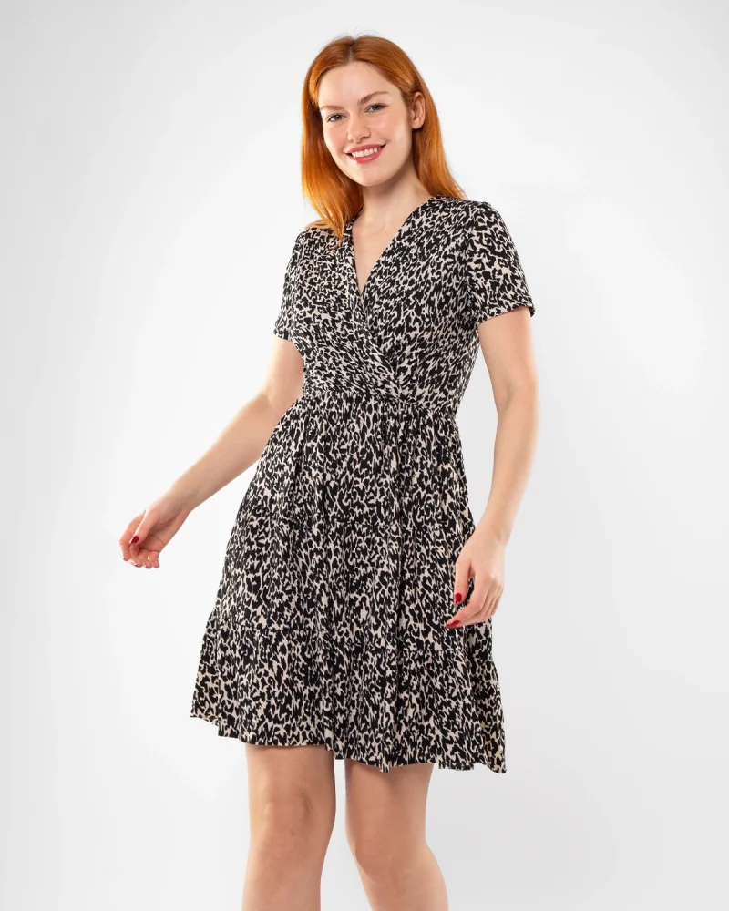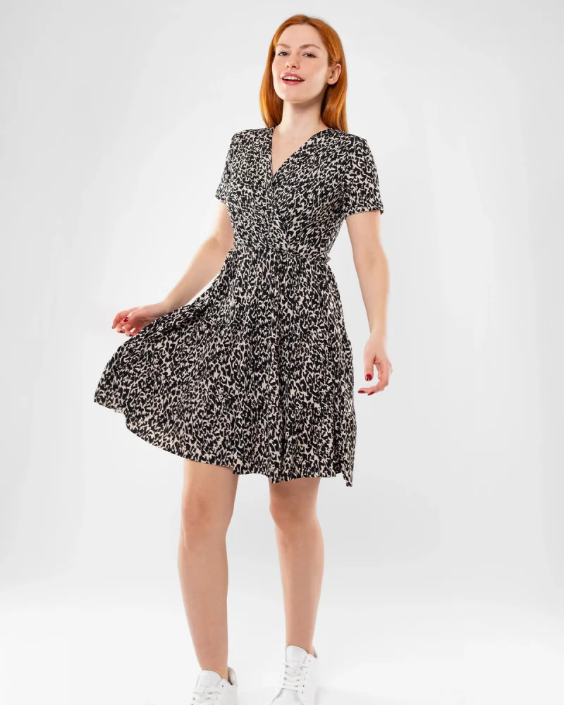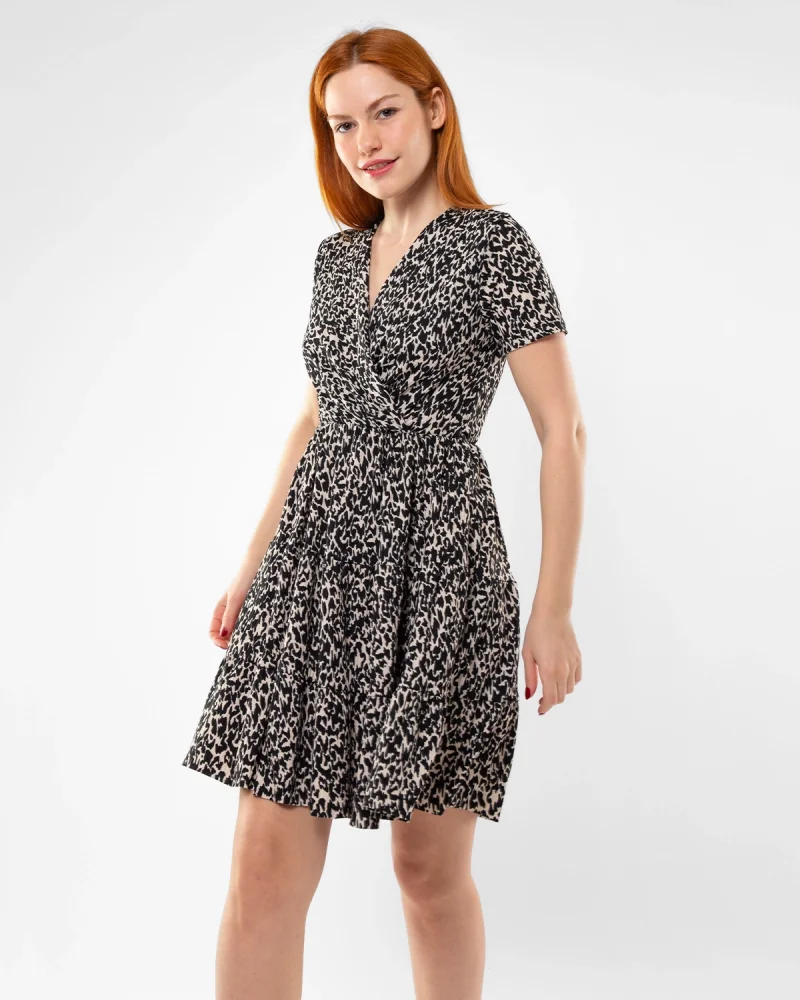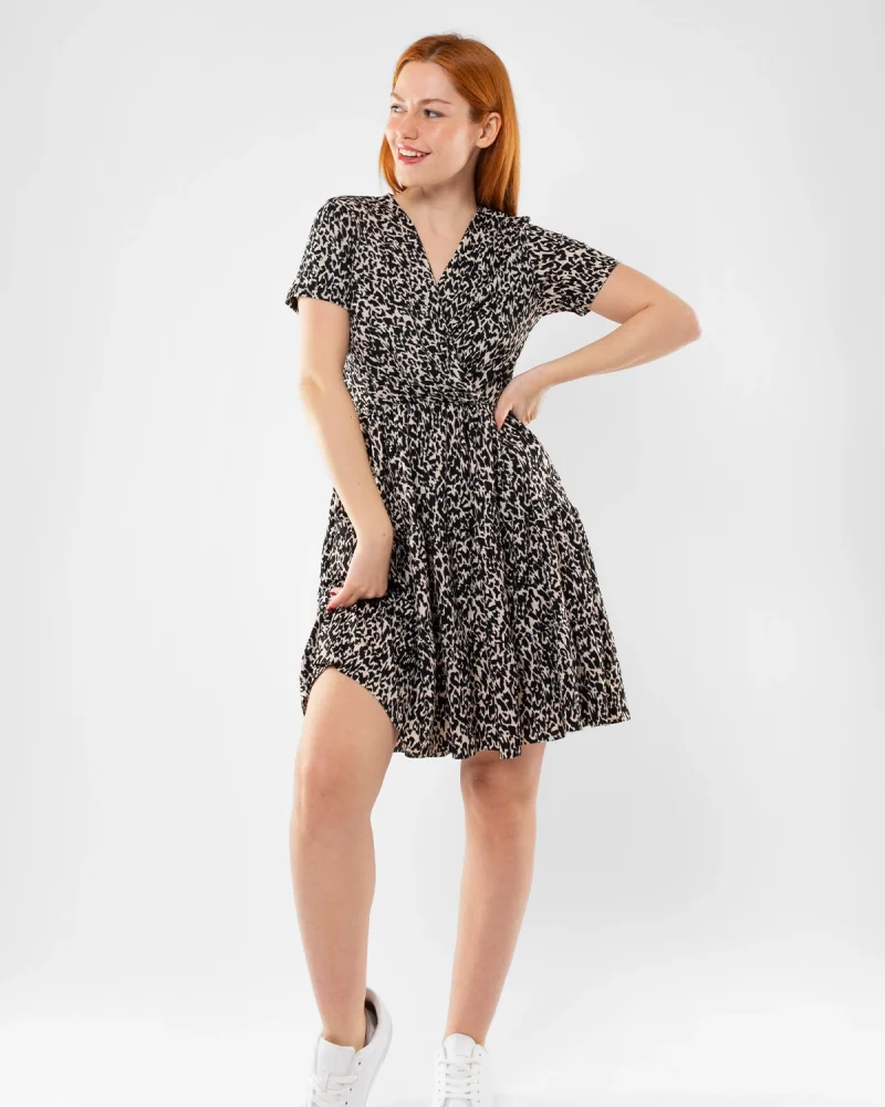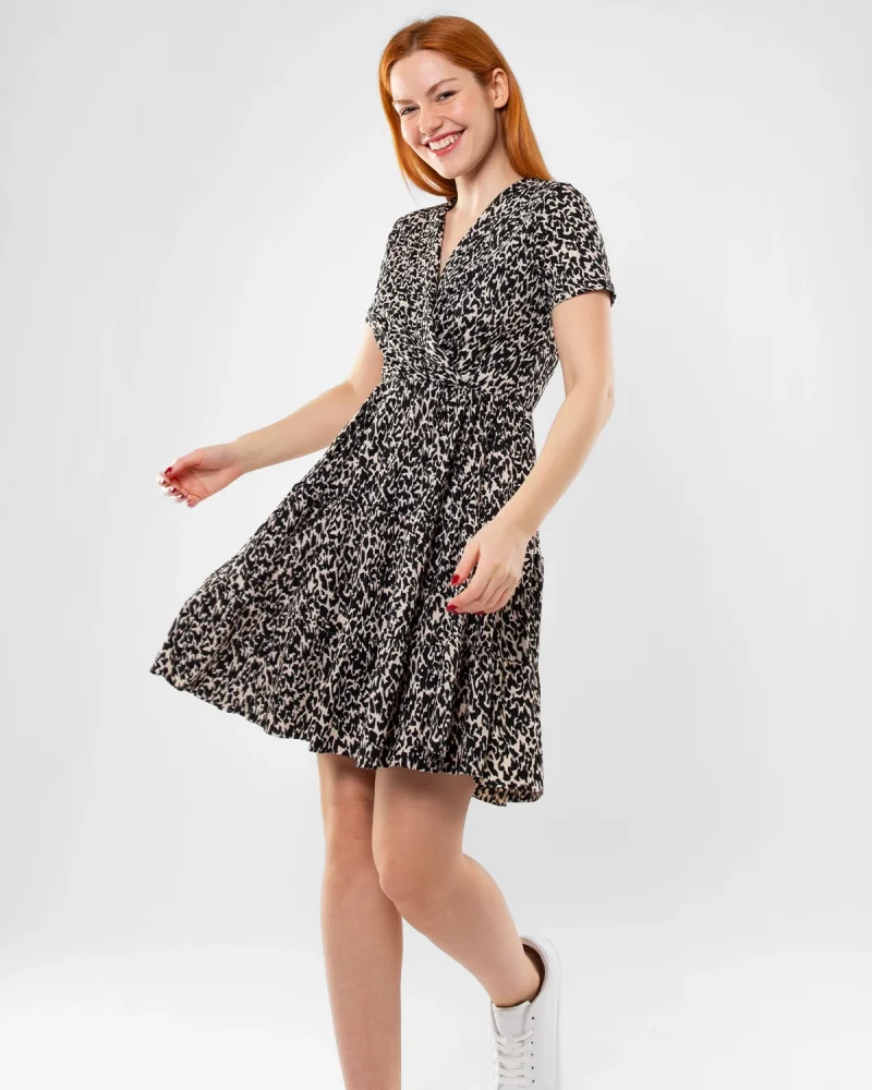 Kruvaze Yaka Leopar Desenli Mini Elbise