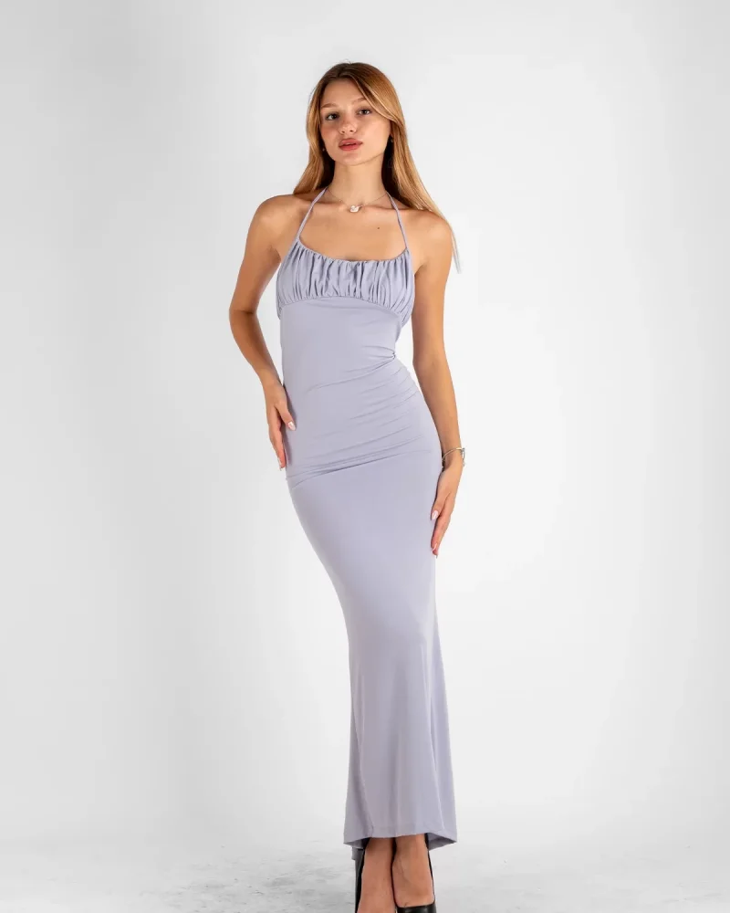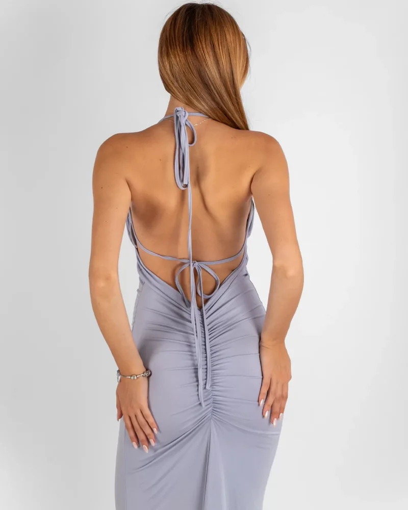 Sırt Dekolteli Asklı Midi Boy Gri Elbise