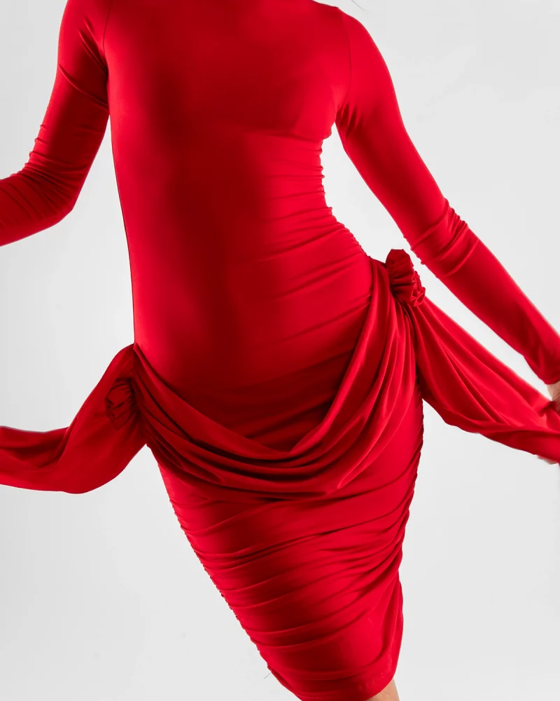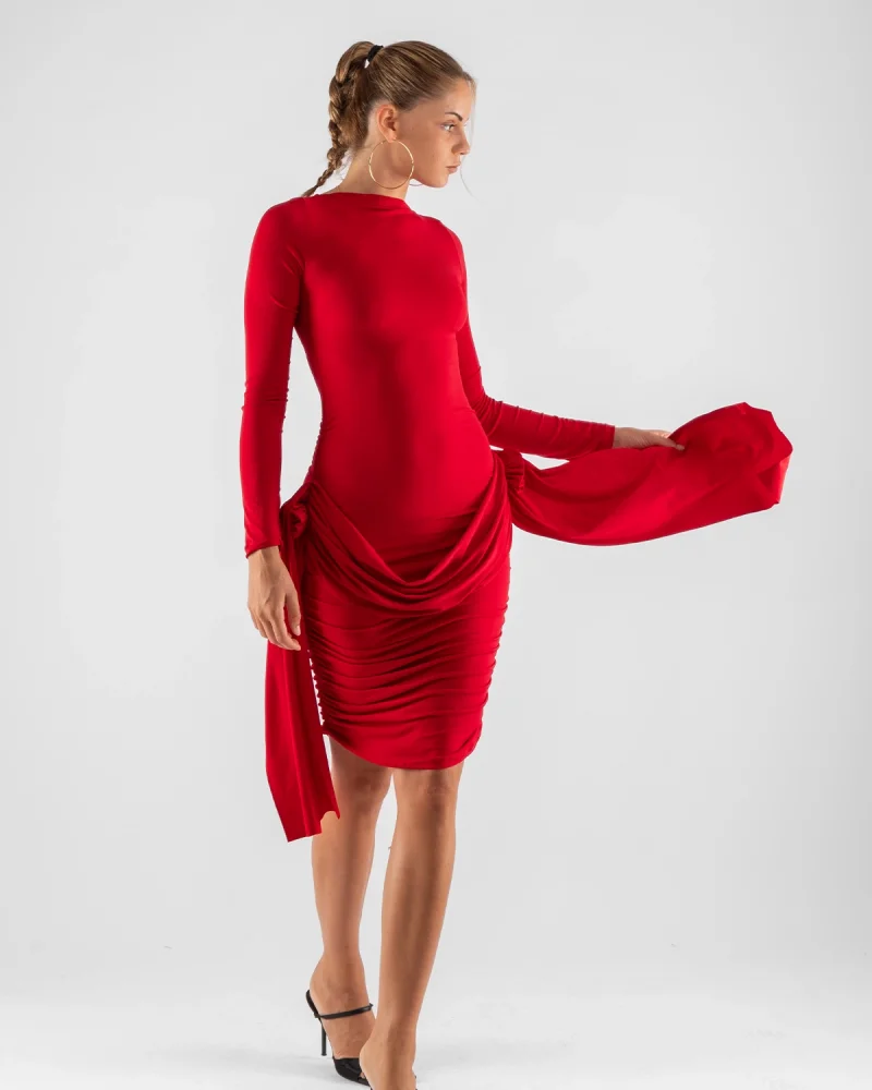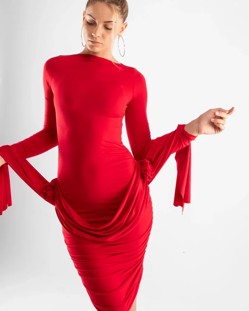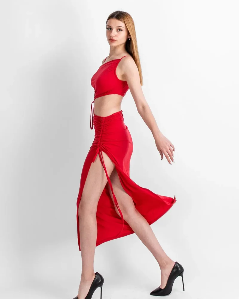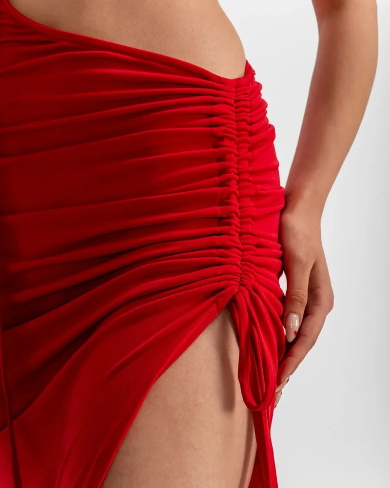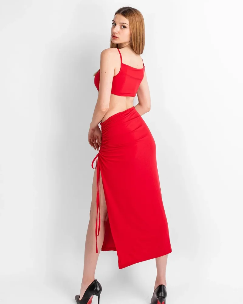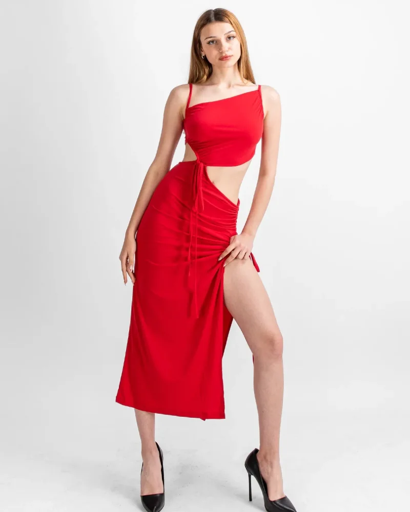 Yırtmaç Detaylı Bağlamalı Askılı Kırmızı Elbise