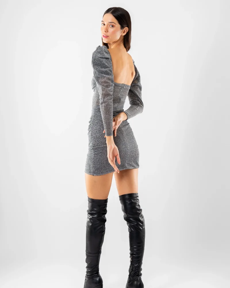 Balon Kol Gloplu Sim Detaylı Gri Mini Elbise