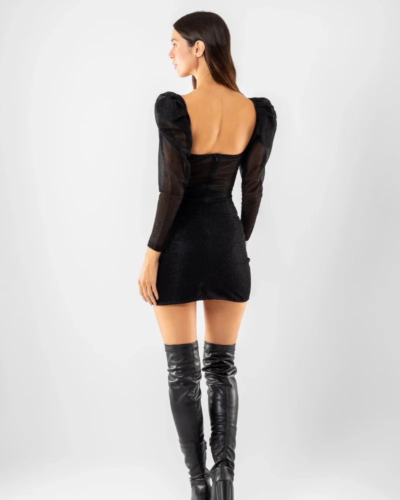 Balon Kol Gloplu Sim Detaylı Siyah Mini Elbise