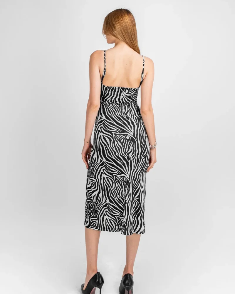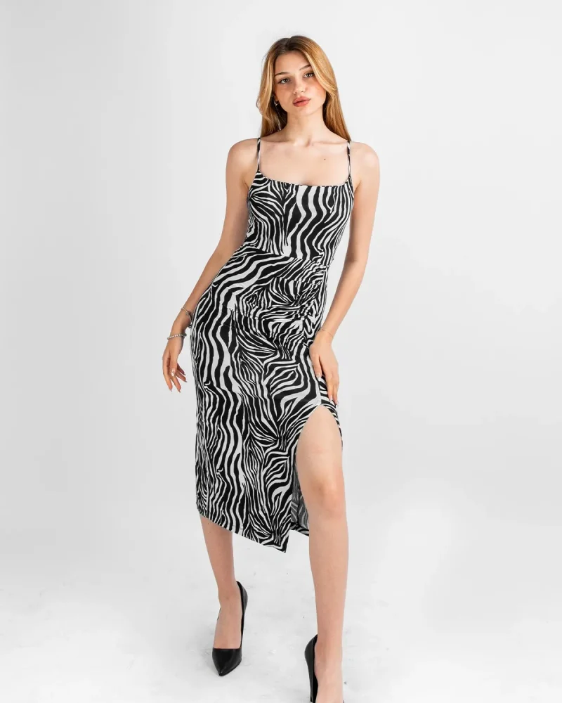 Büzgülü Askılı Zebra Desen Midi Boy Kumaş Elbise