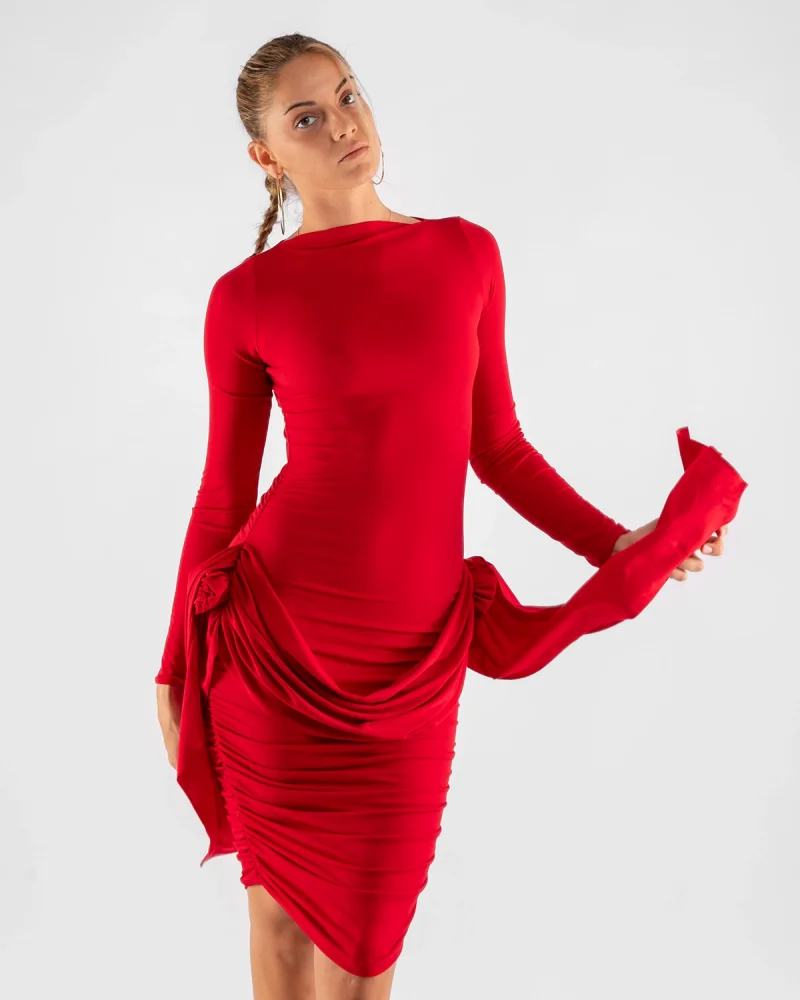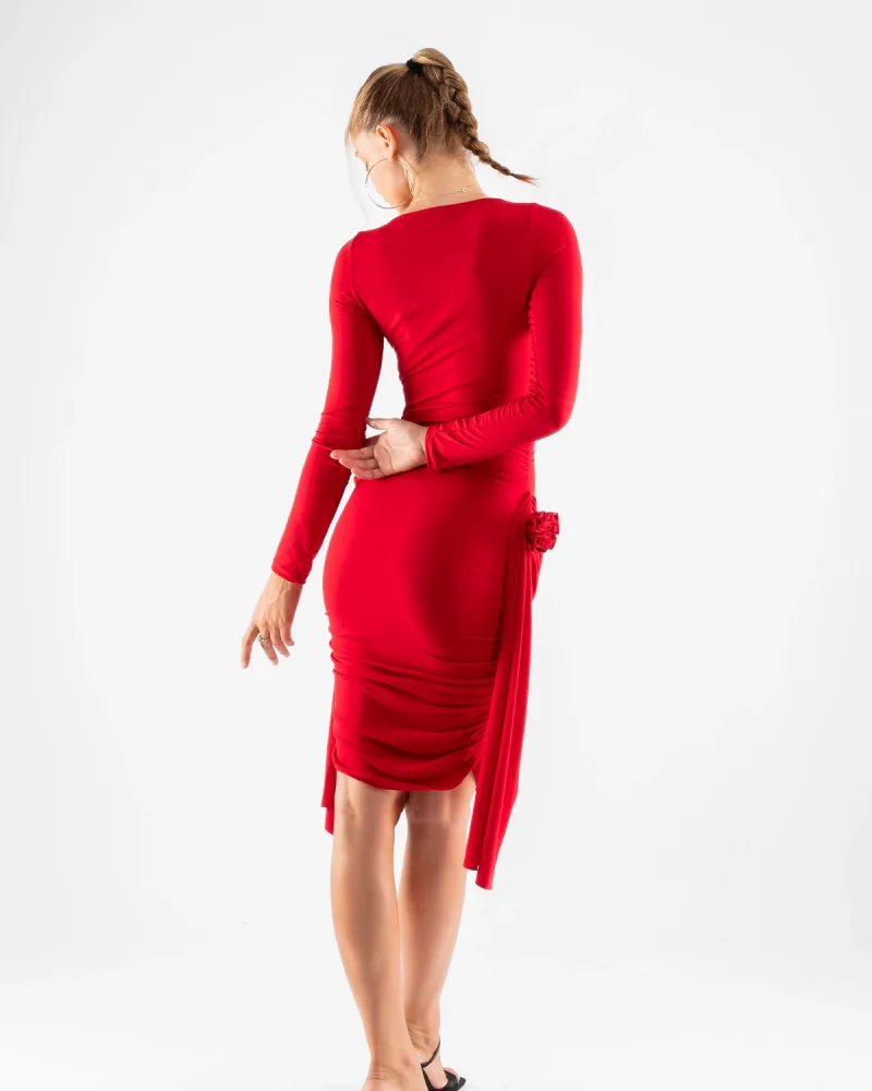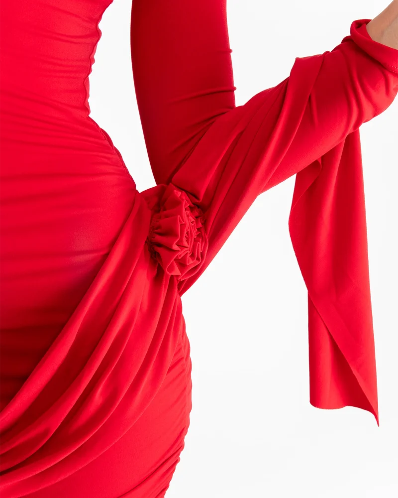 Gül Detaylı Saçaklı Kırmızı Mini Elbise