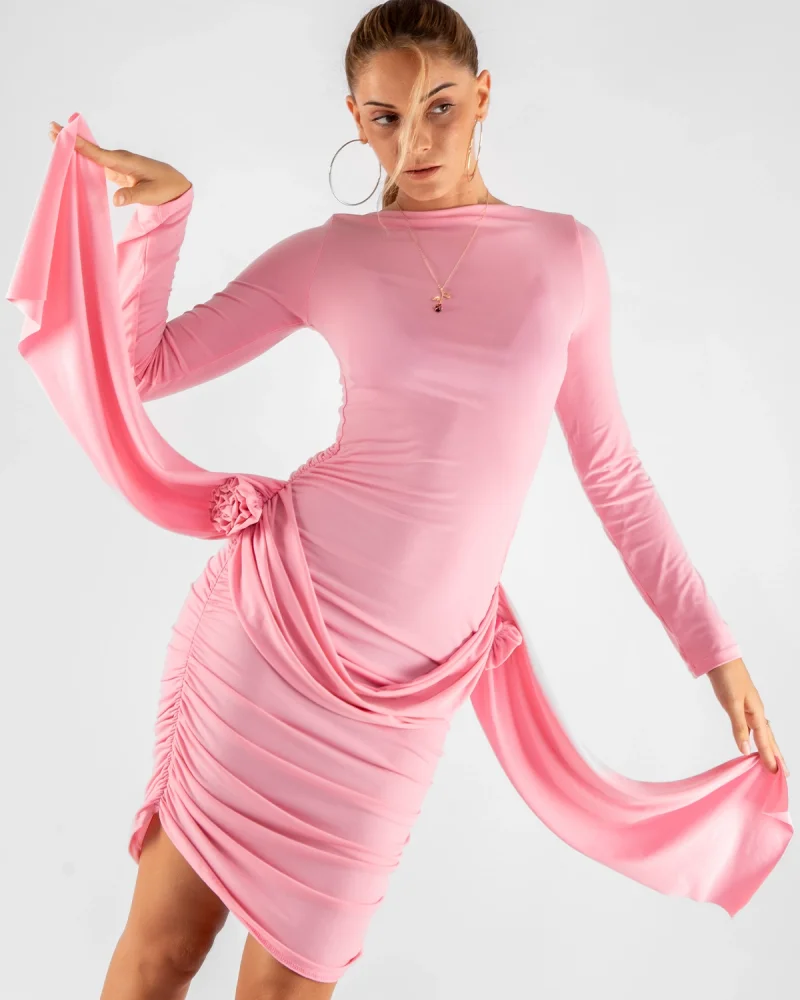 Gül Detaylı Saçaklı Pembe Mini Elbise