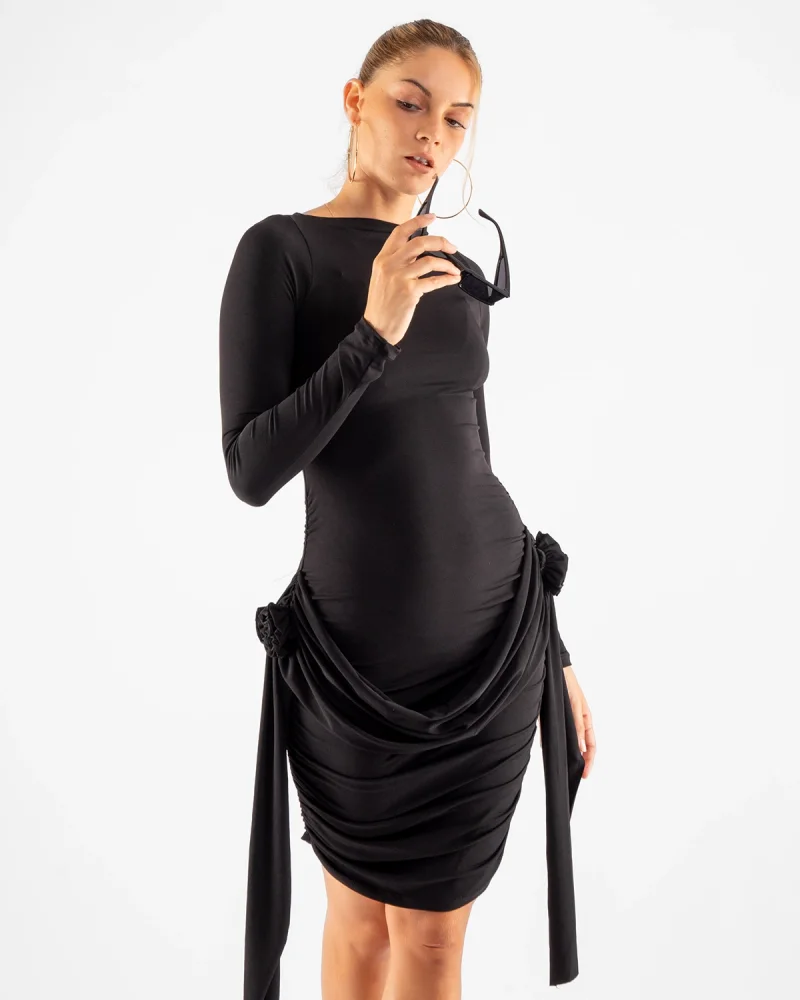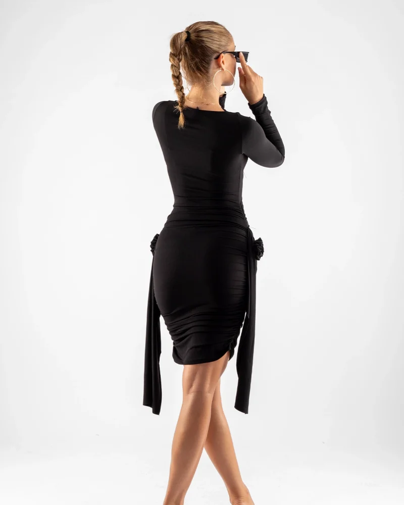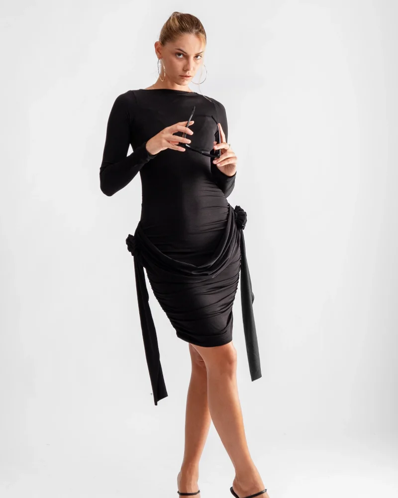 Gül Detaylı Saçaklı Siyah Mini Elbise