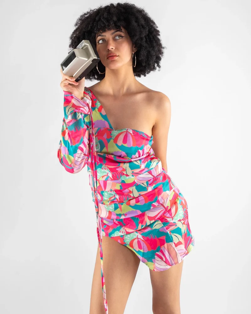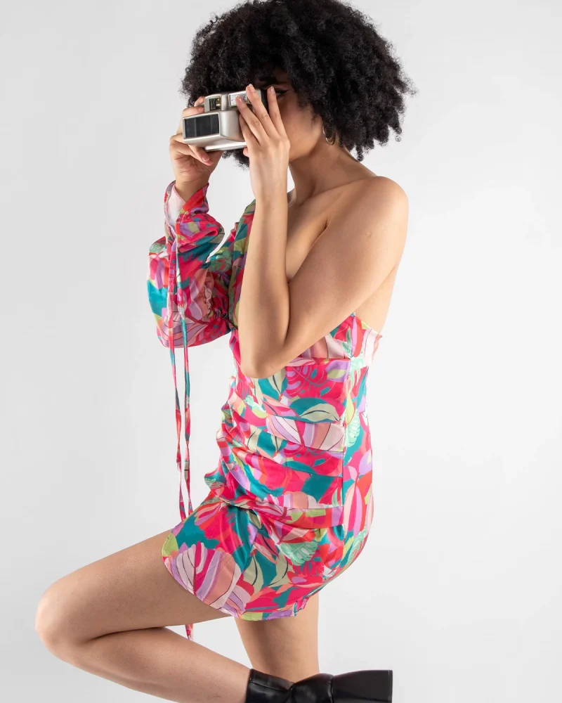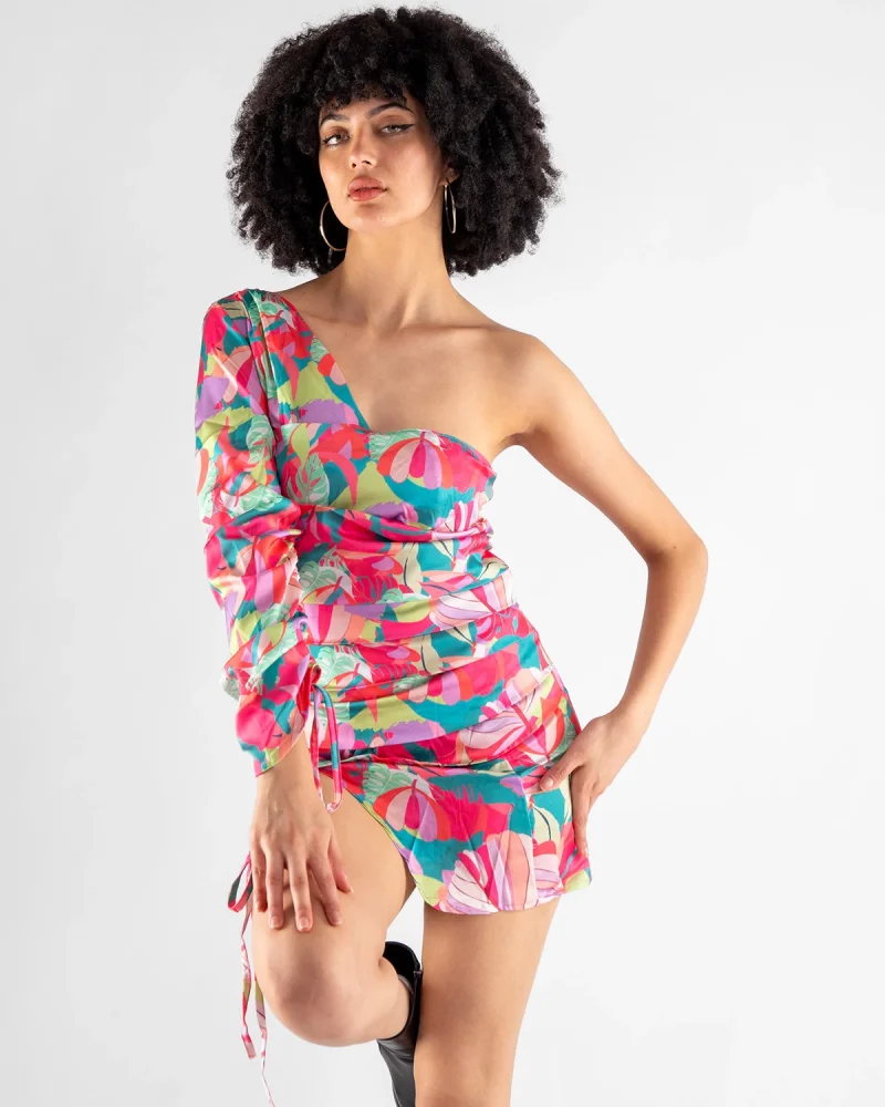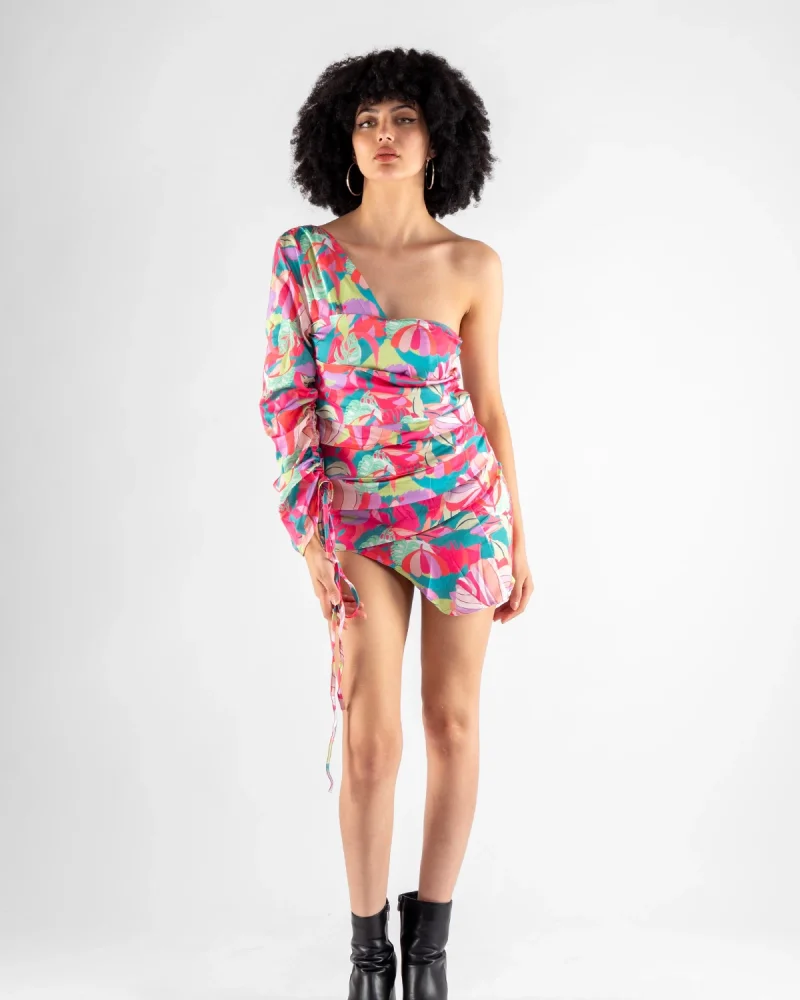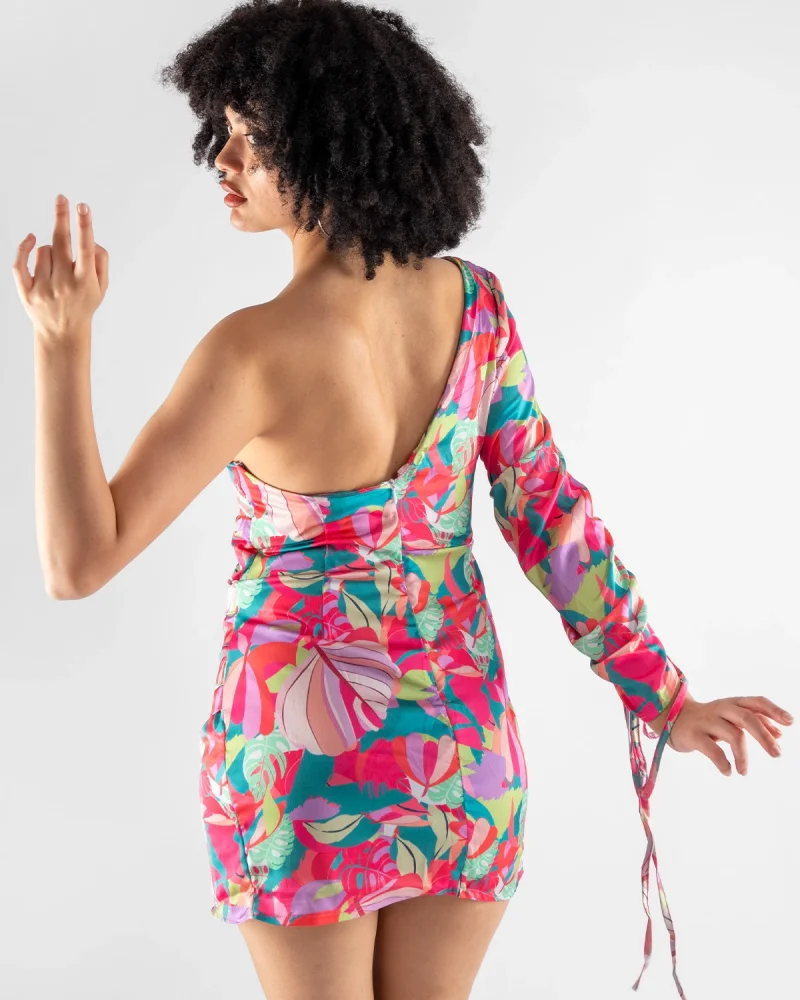 Tek Kol Omuz Detaylı Saten Pembe Mini Elbise