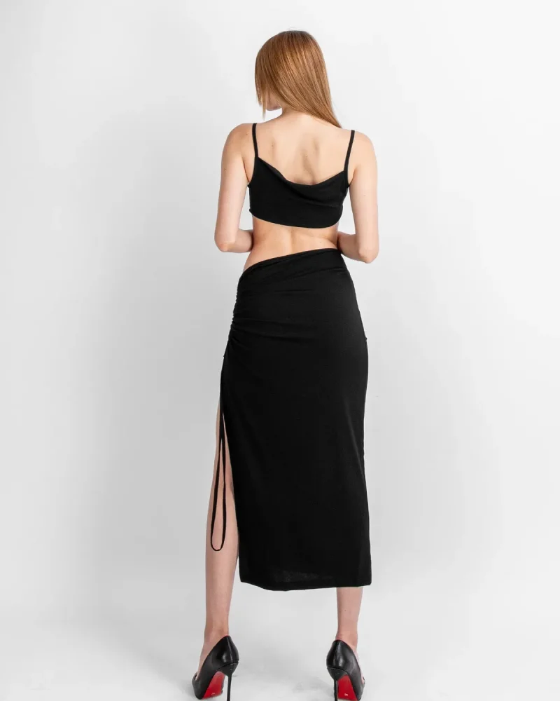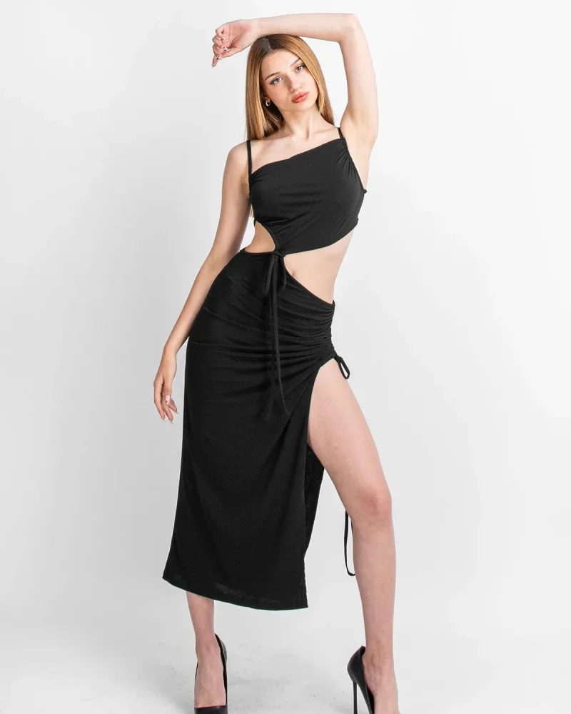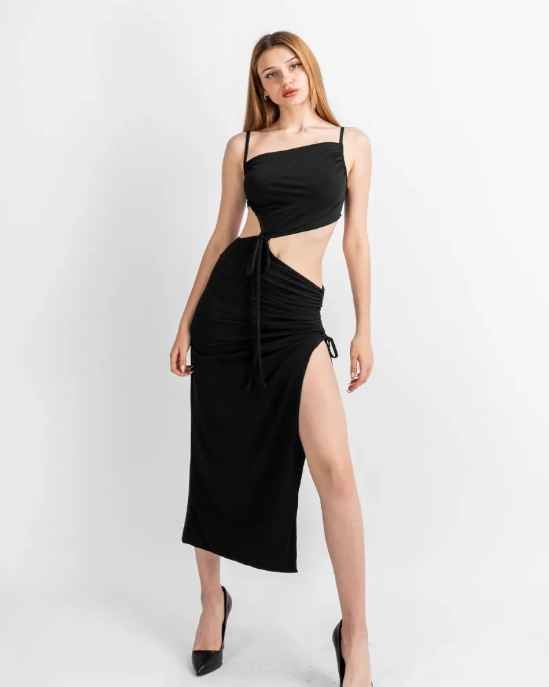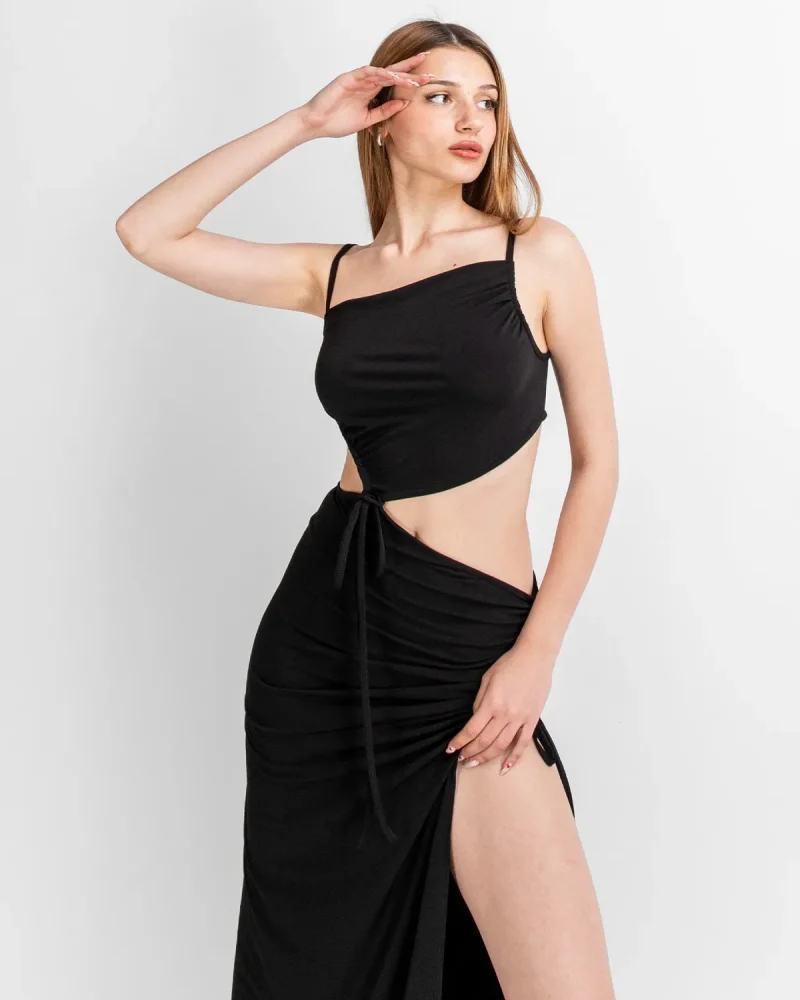 Yırtmaç Detaylı Bağlamalı Askılı Siyah Elbise