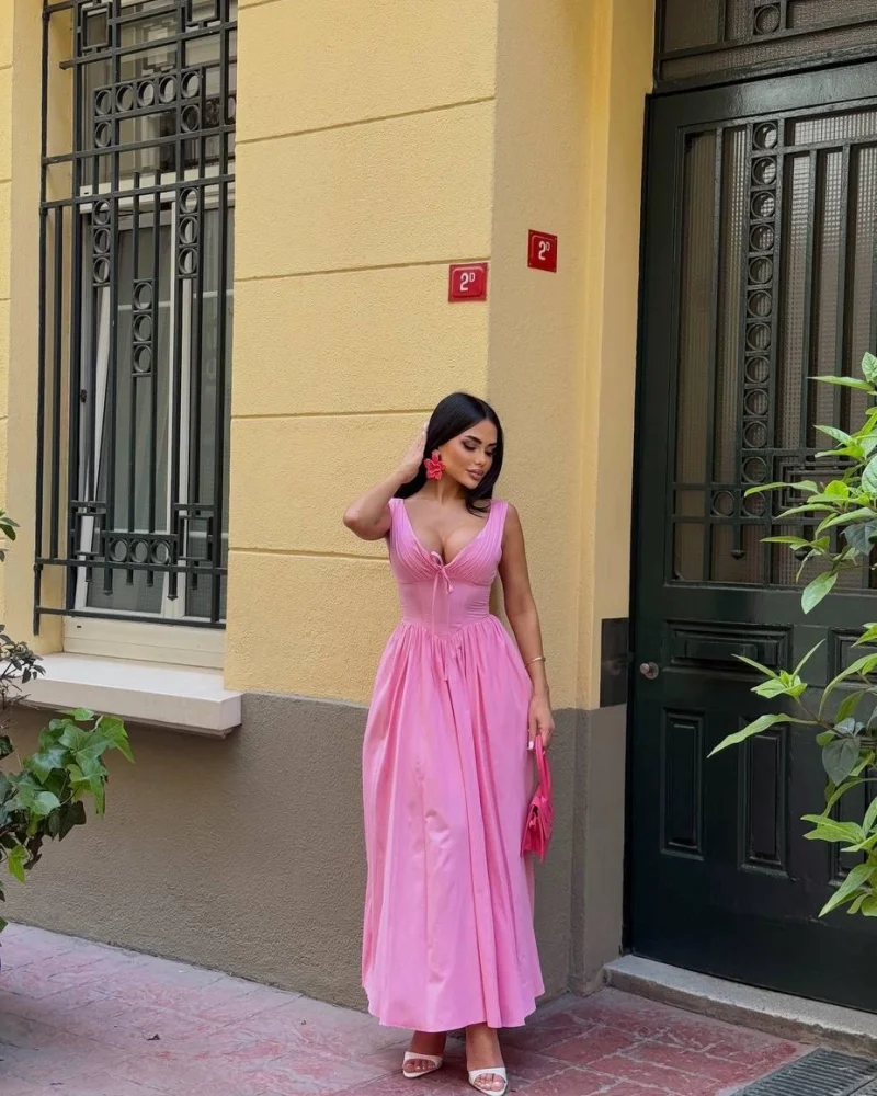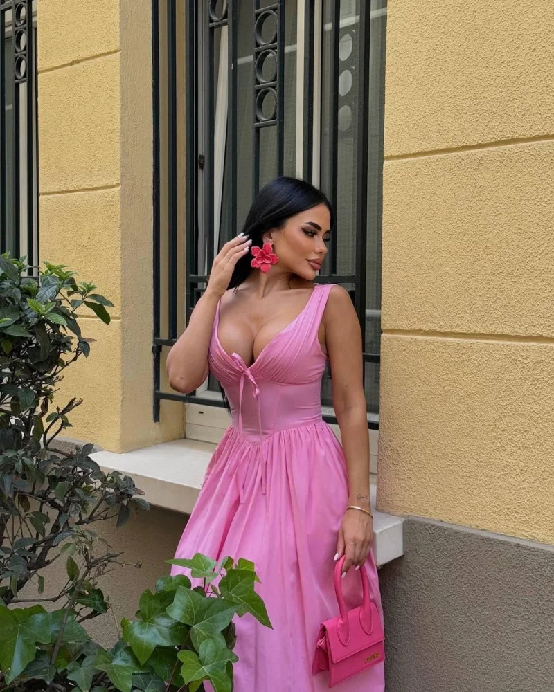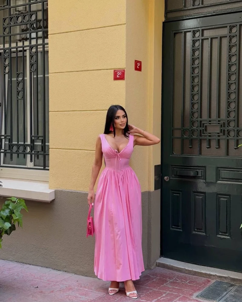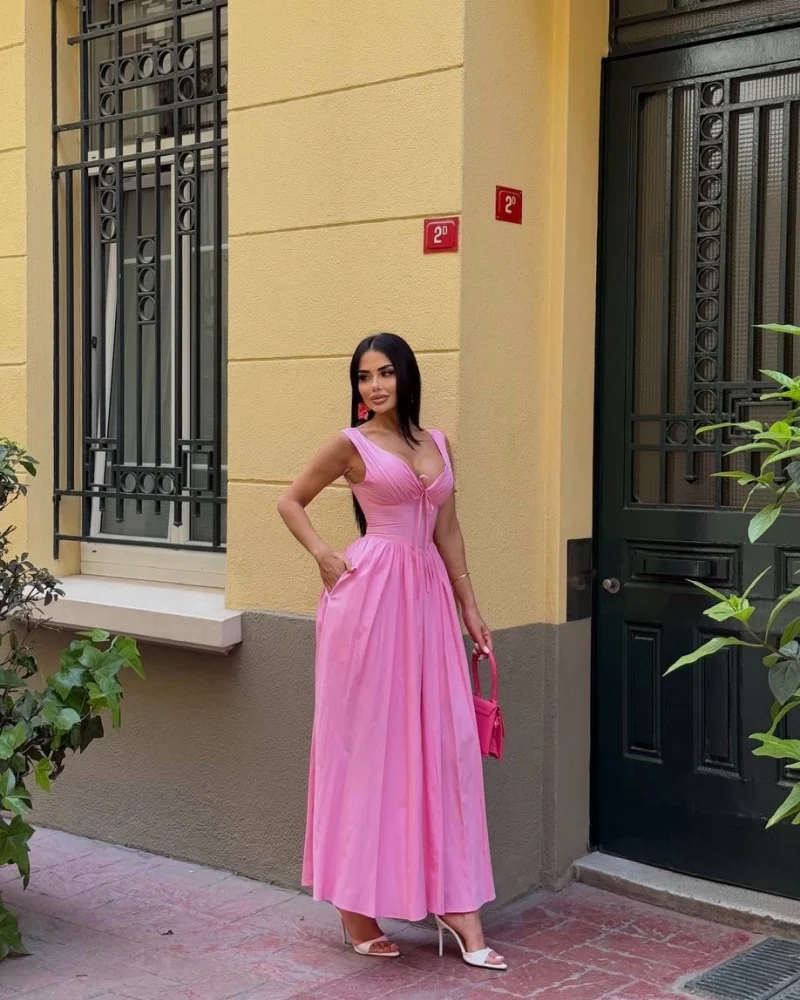 Dantel İşlemeli Askılı Pembe Elbise