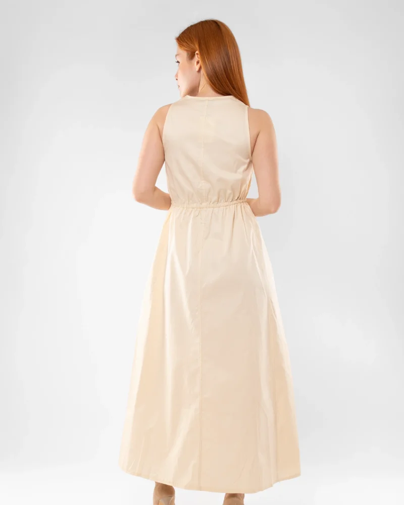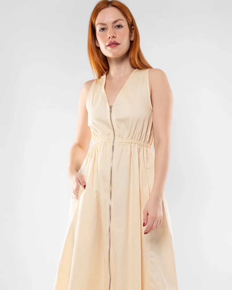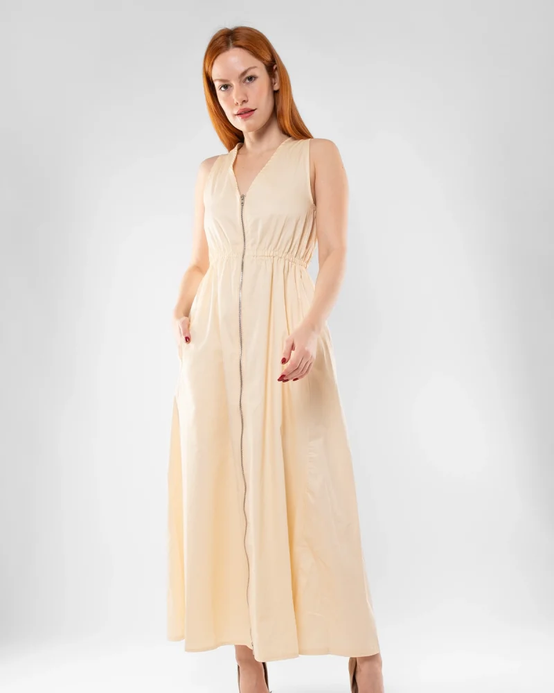 Cep Detaylı Ön Fermuarlı Ekru Uzun Elbise