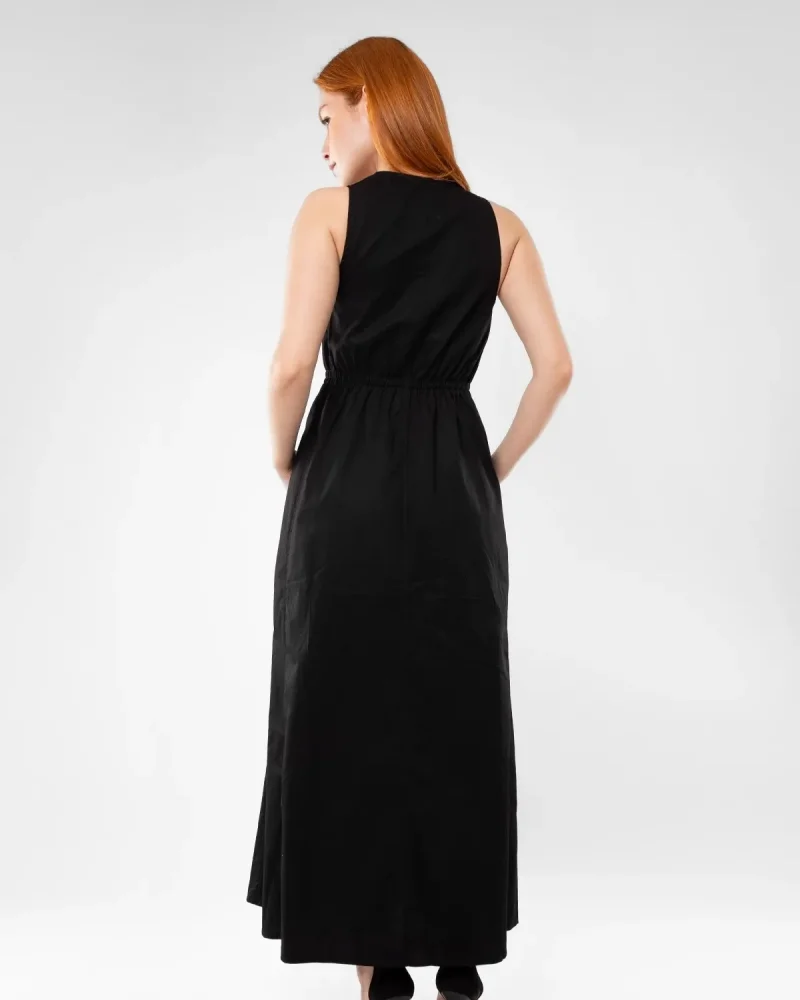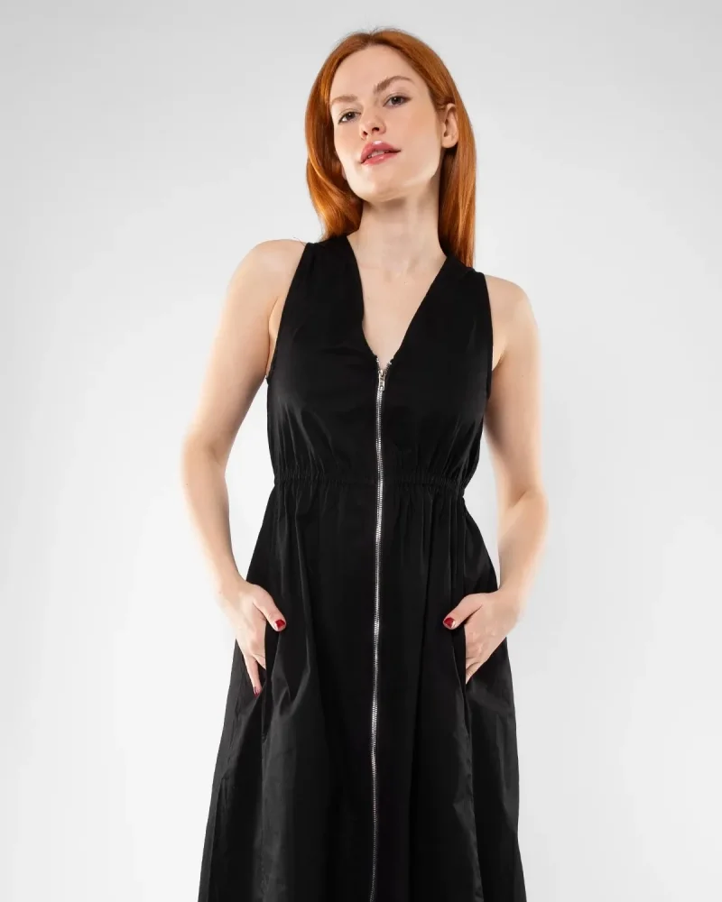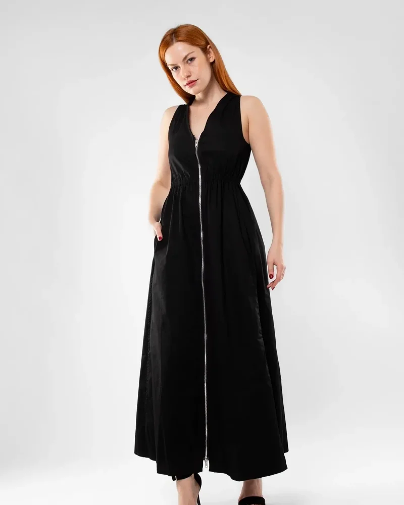 Cep Detaylı Ön Fermuarlı Siyah Uzun Elbise