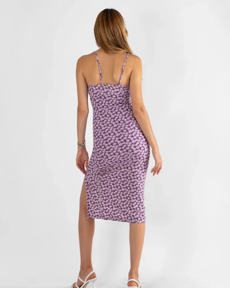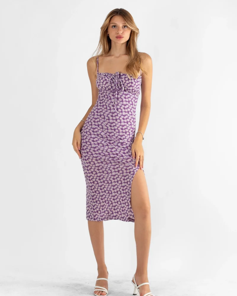 Papatya Desenli Askılı Yırtmaçlı Midi Boy Elbise