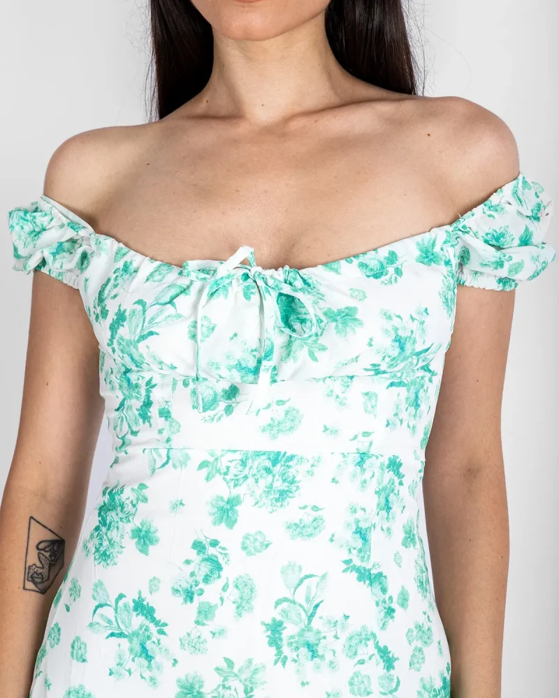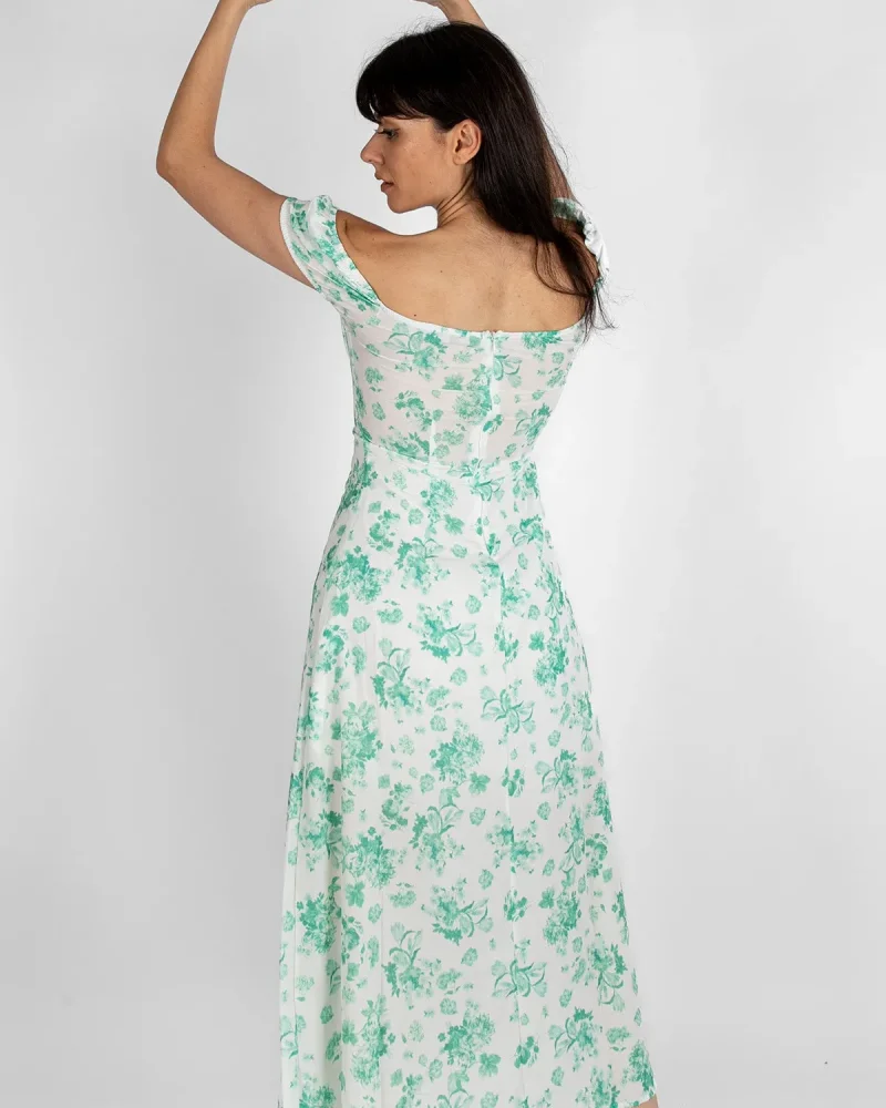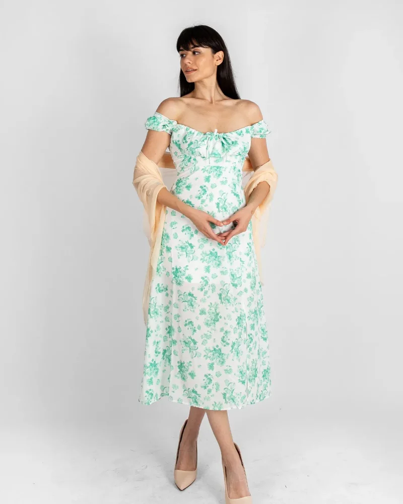 Çiçek Desenli Midi Boy Astarlı Yeşil Elbise