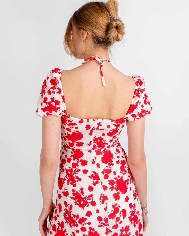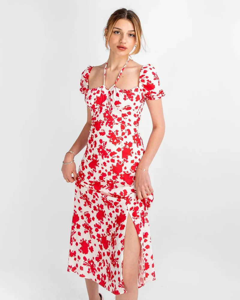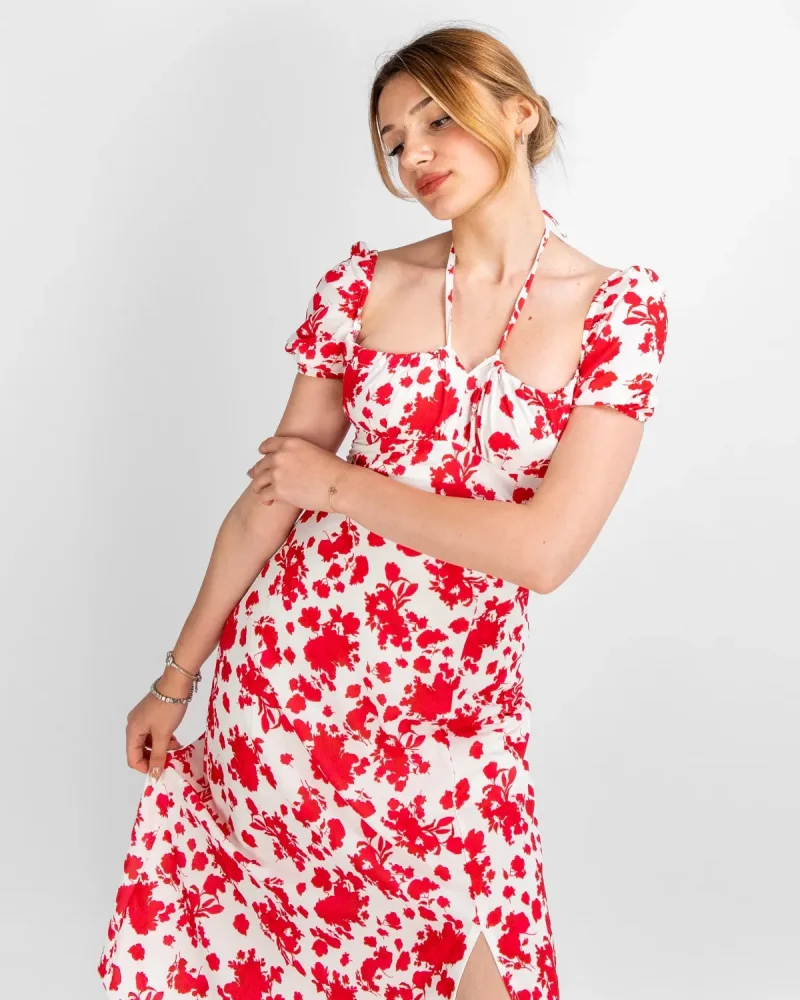 Çiçek Desenli Midi Boy Astarlı Kırmızı Elbise