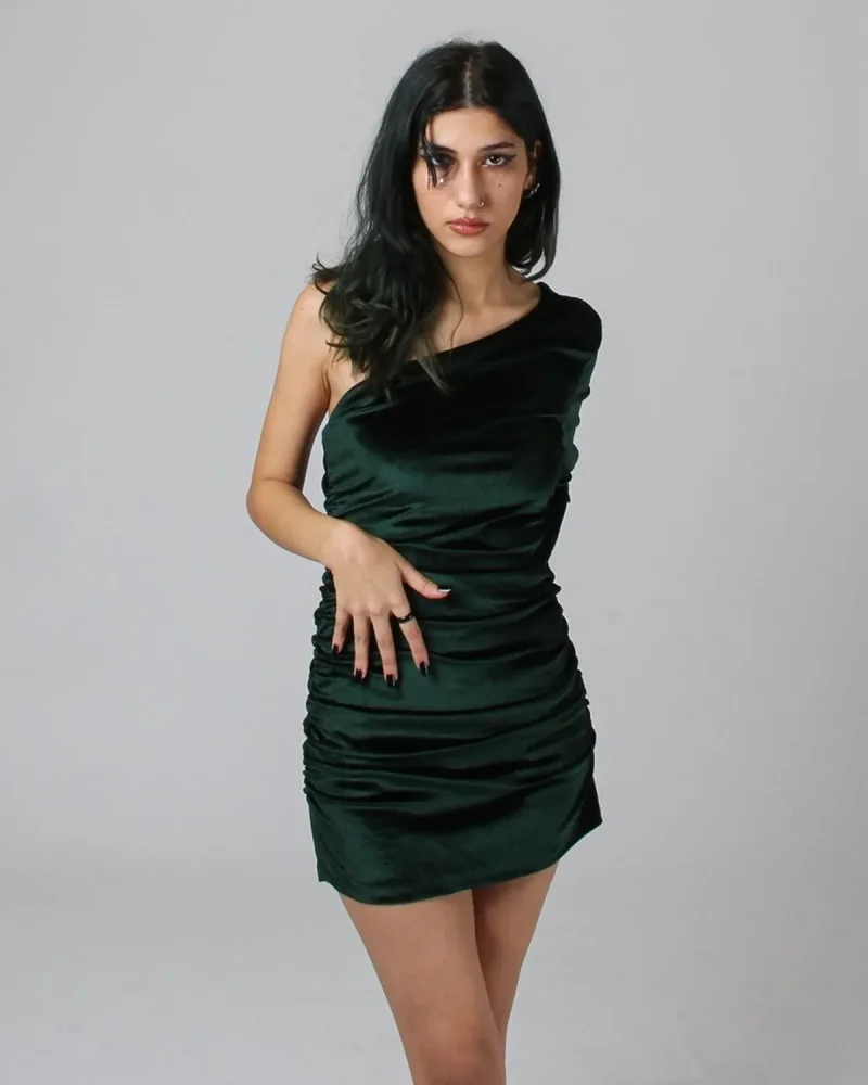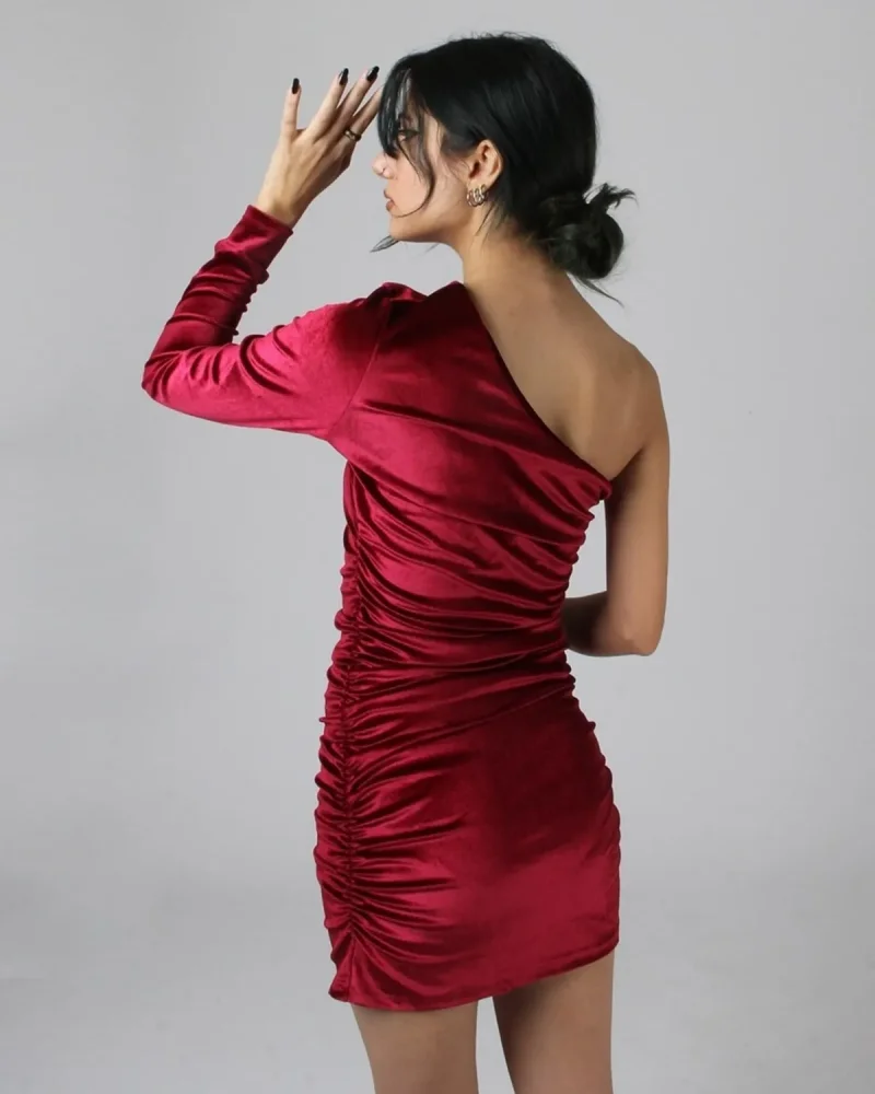 Saten Kadife Tek Kol Omuz Detaylı Elbise