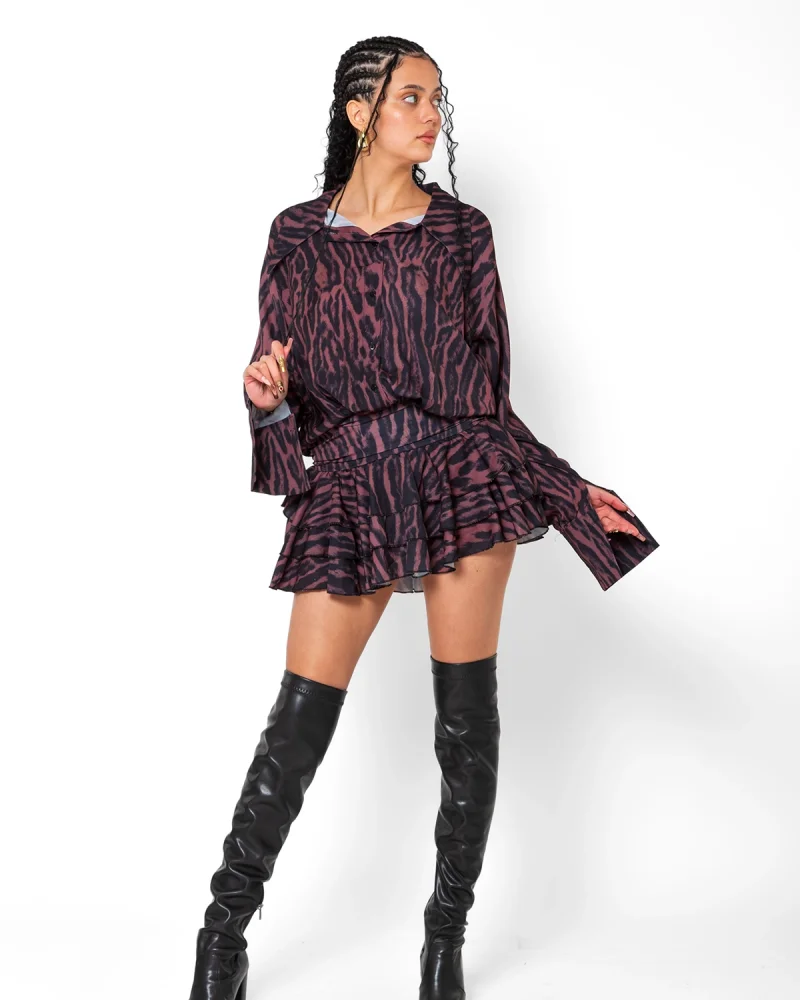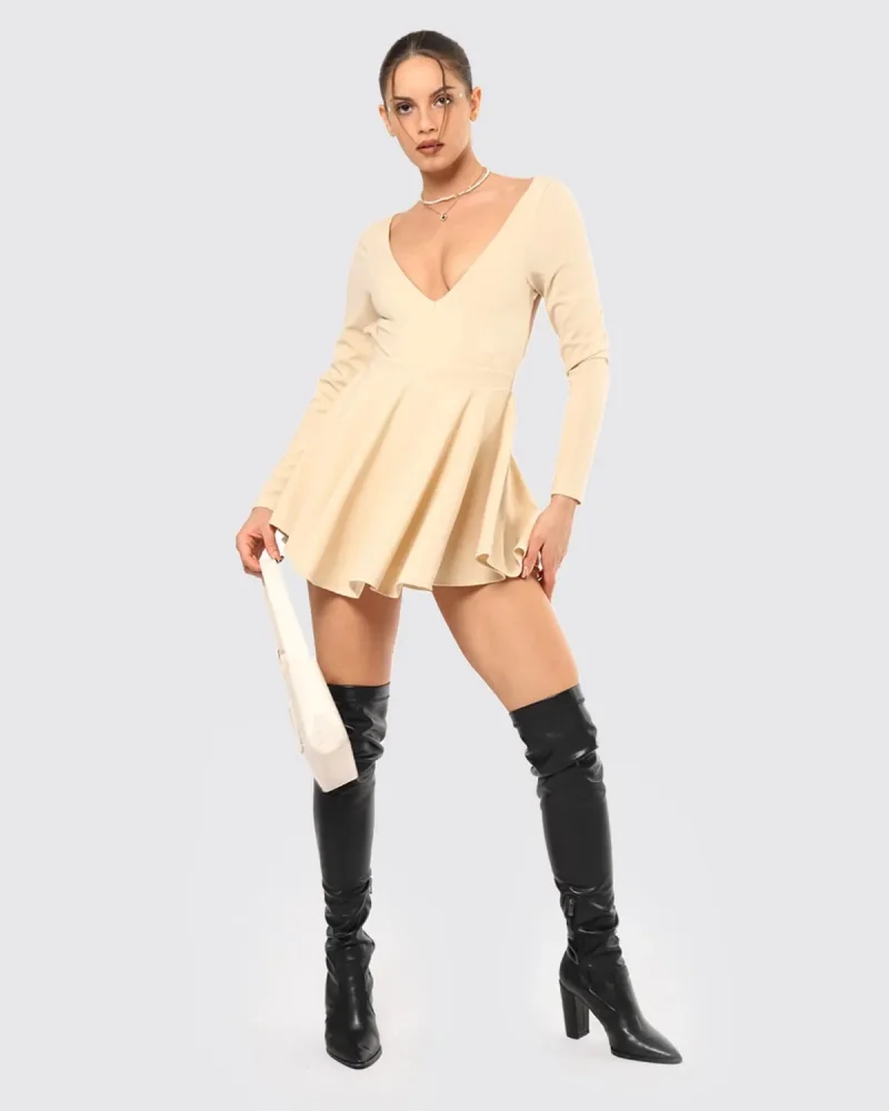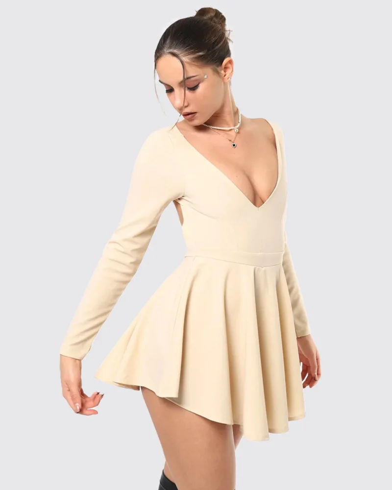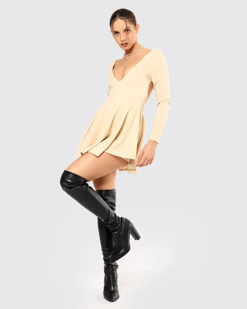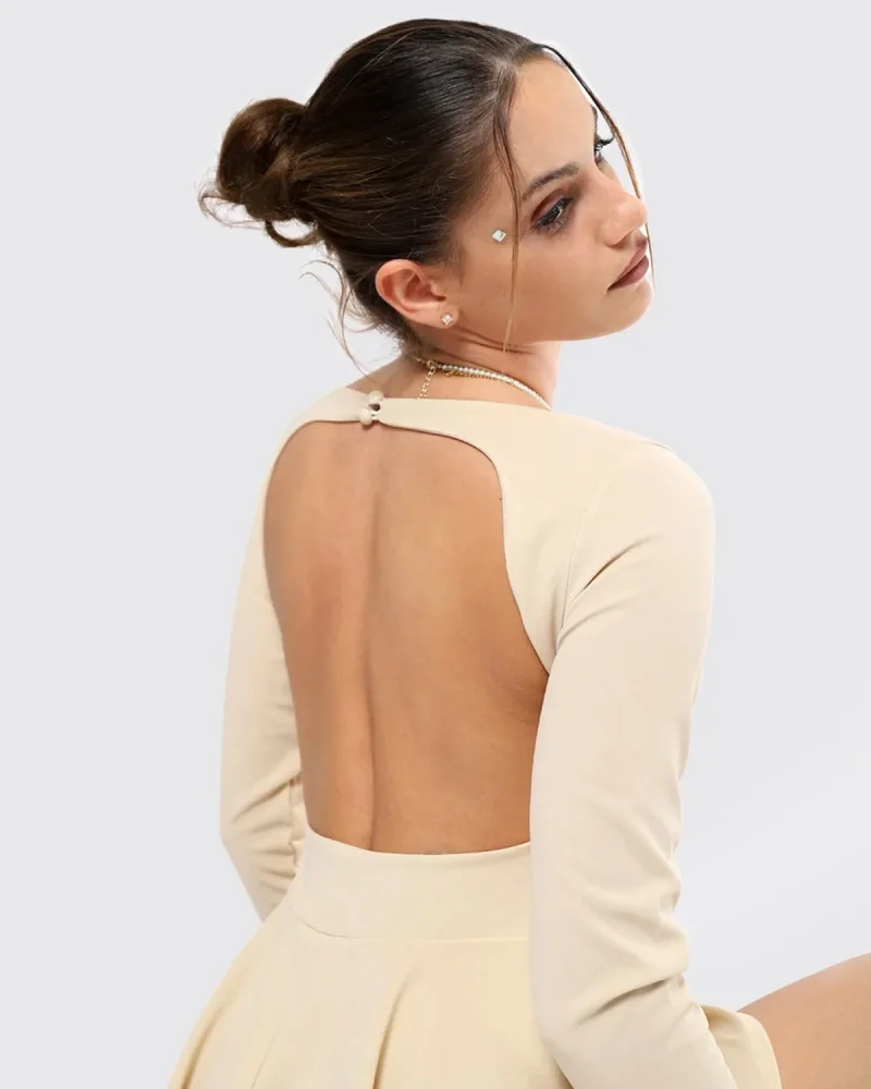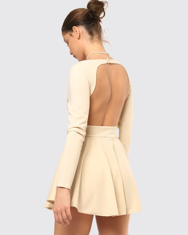 Sırt Dekolteli Volanlı Şort Etek Uzun Kollu Mini Elbise