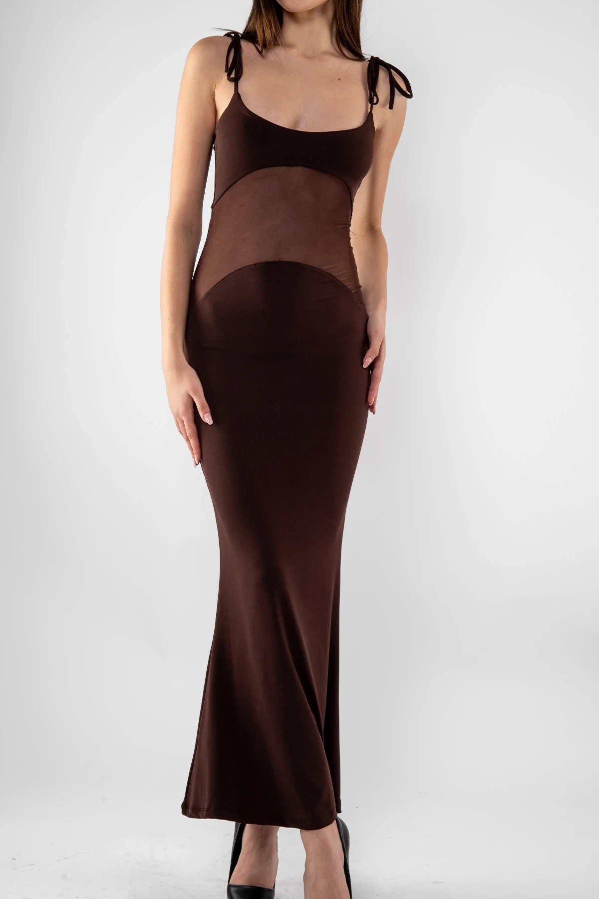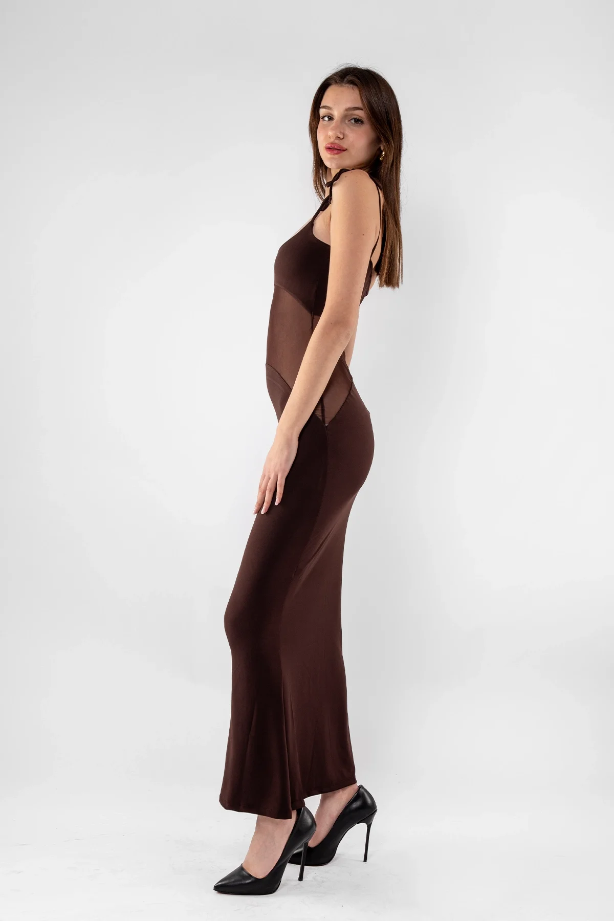 İP ASKILI TÜL GÖBEK DETAYLI SANDY UZUN KAHVERENGİ ELBİSE