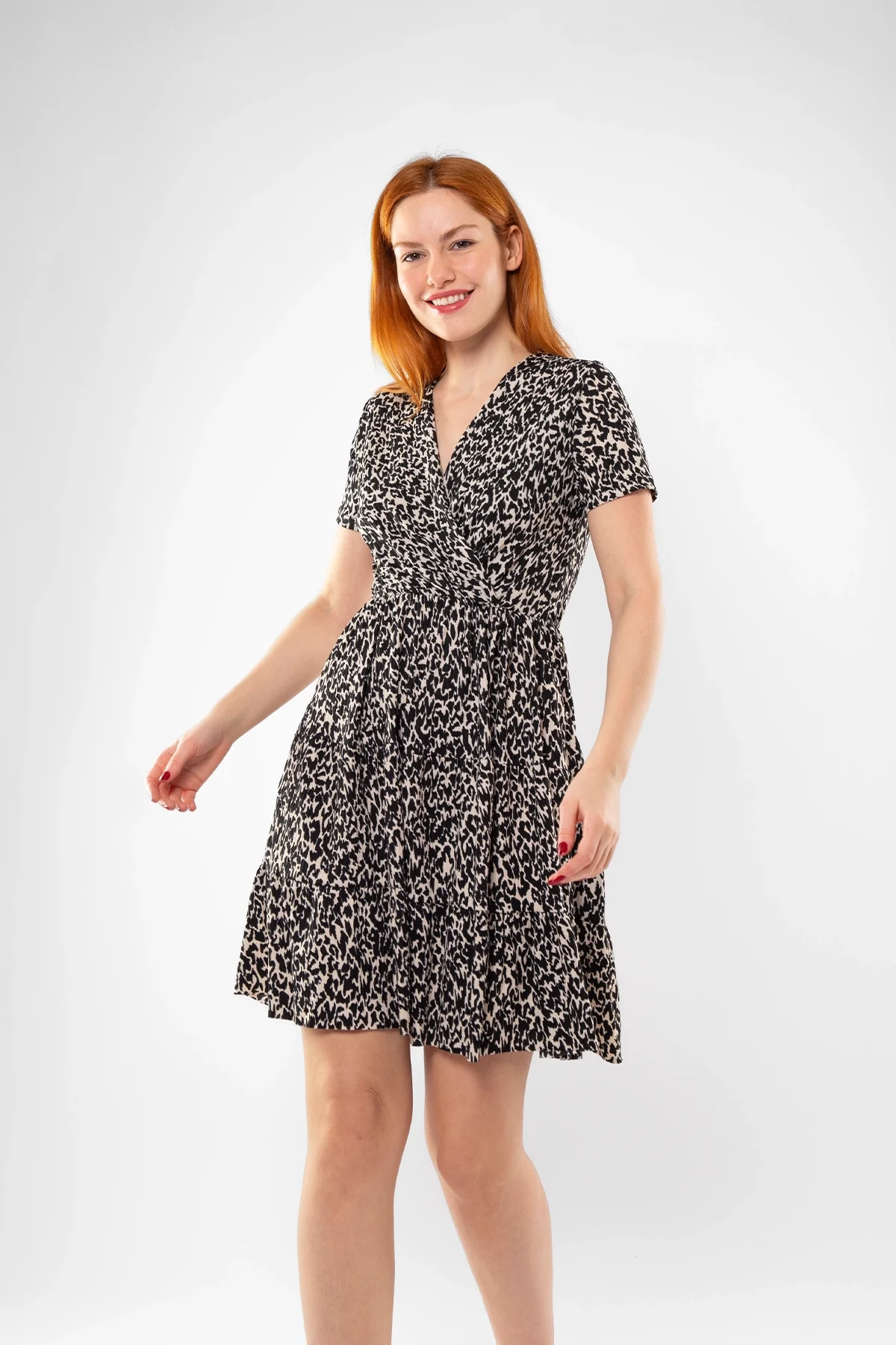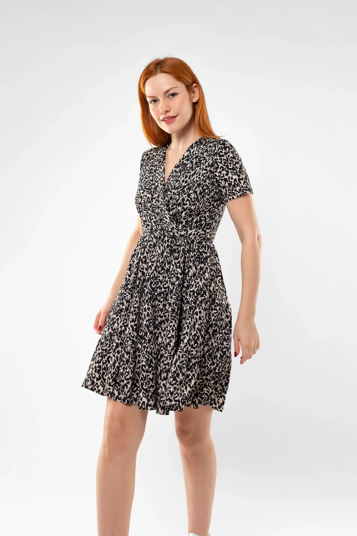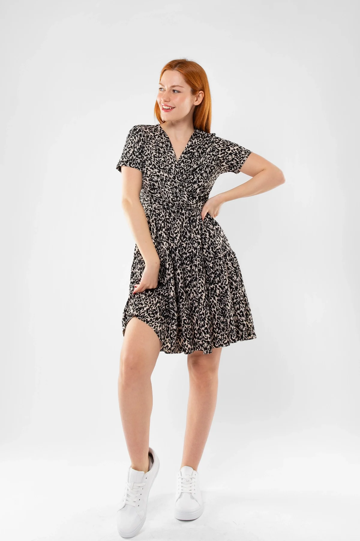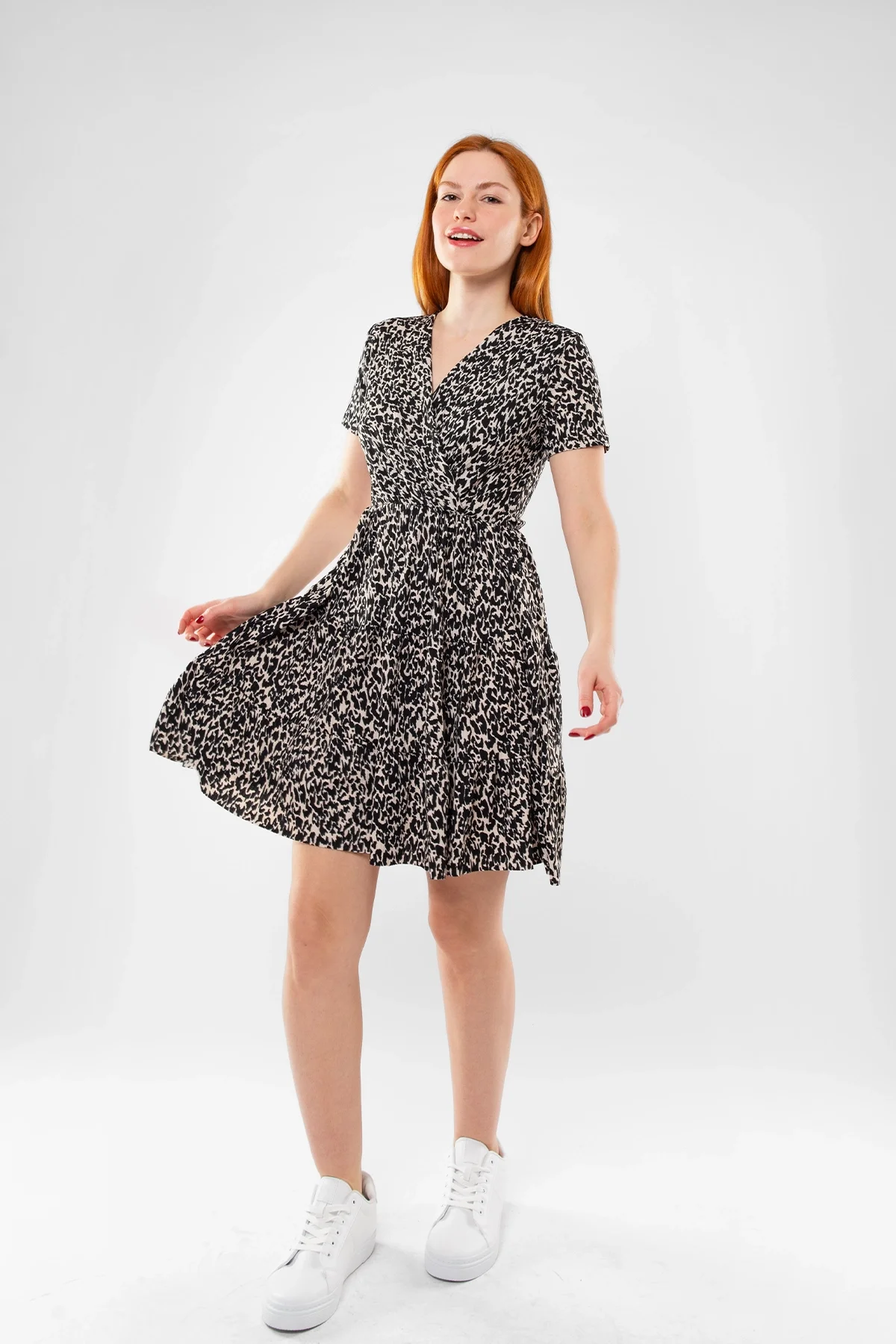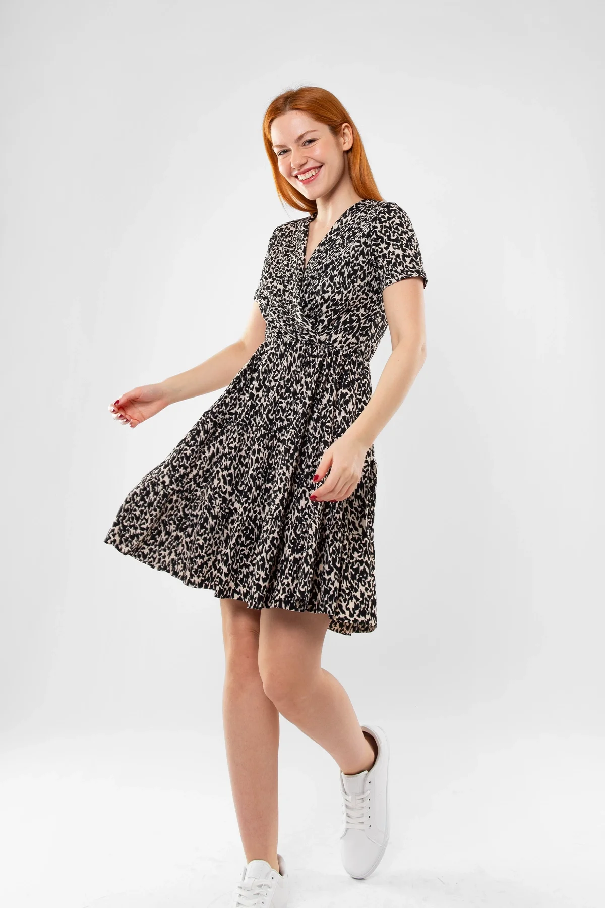 Şıklığı ve cesareti bir araya getiren bu kruvaze yaka mini elbise, siyah leopar desenleriyle bej zemin üzerinde iddialı bir duruş sergiliyor. Günlük şıklıkta ve özel davetlerde stilinizi öne çıkarır.