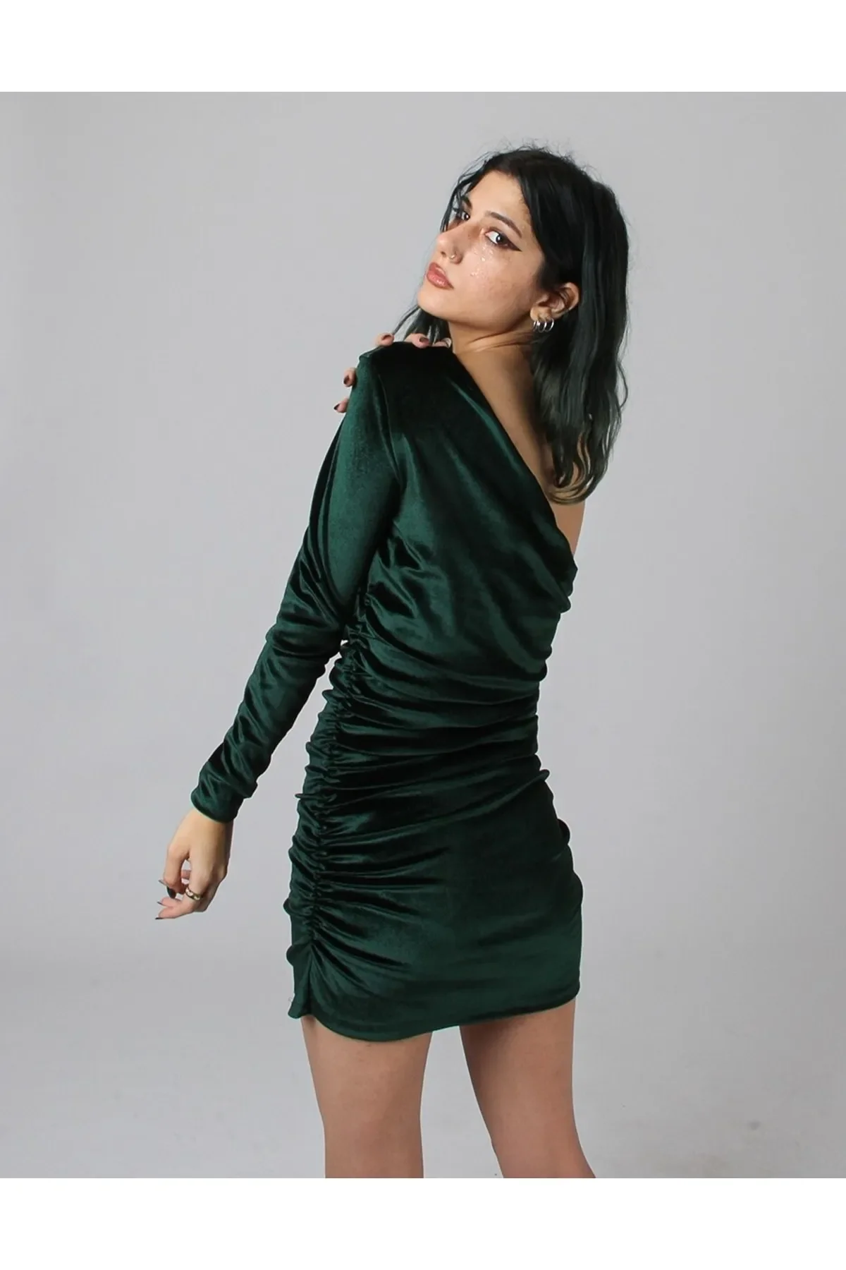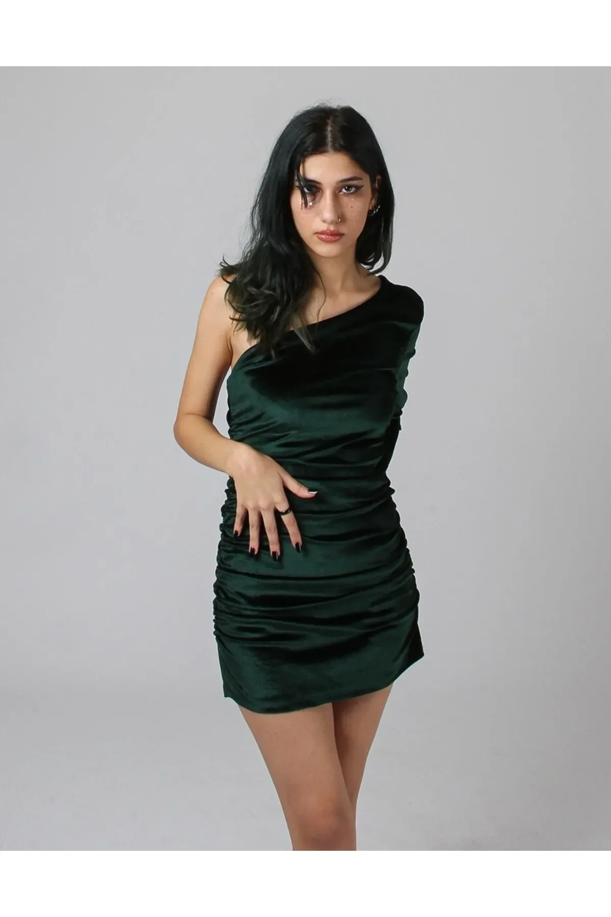 SATEN KADİFE TEK KOL OMUZ DETAYLI ELBİSE