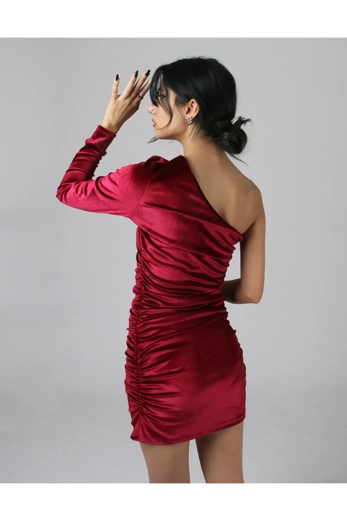 SATEN KADİFE TEK KOL OMUZ DETAYLI ELBİSE