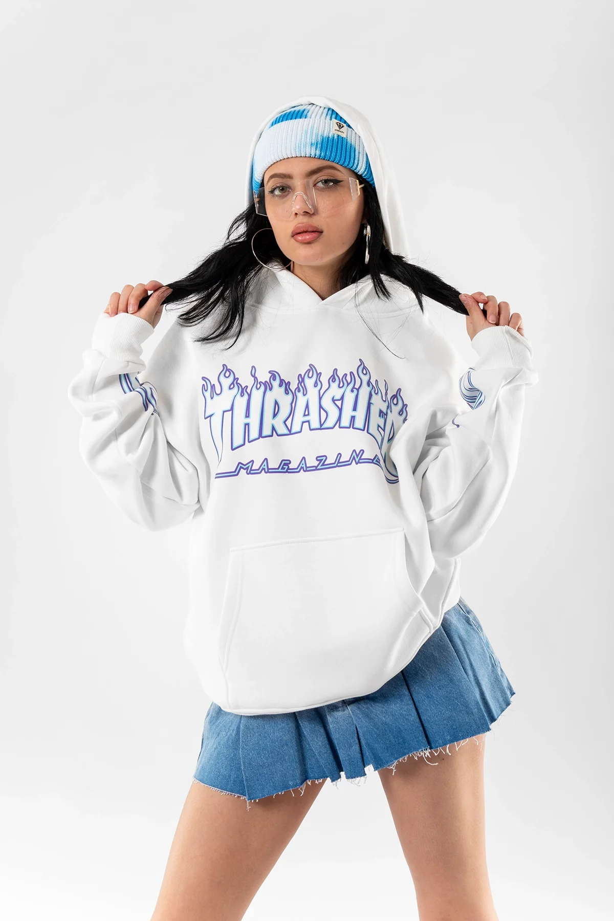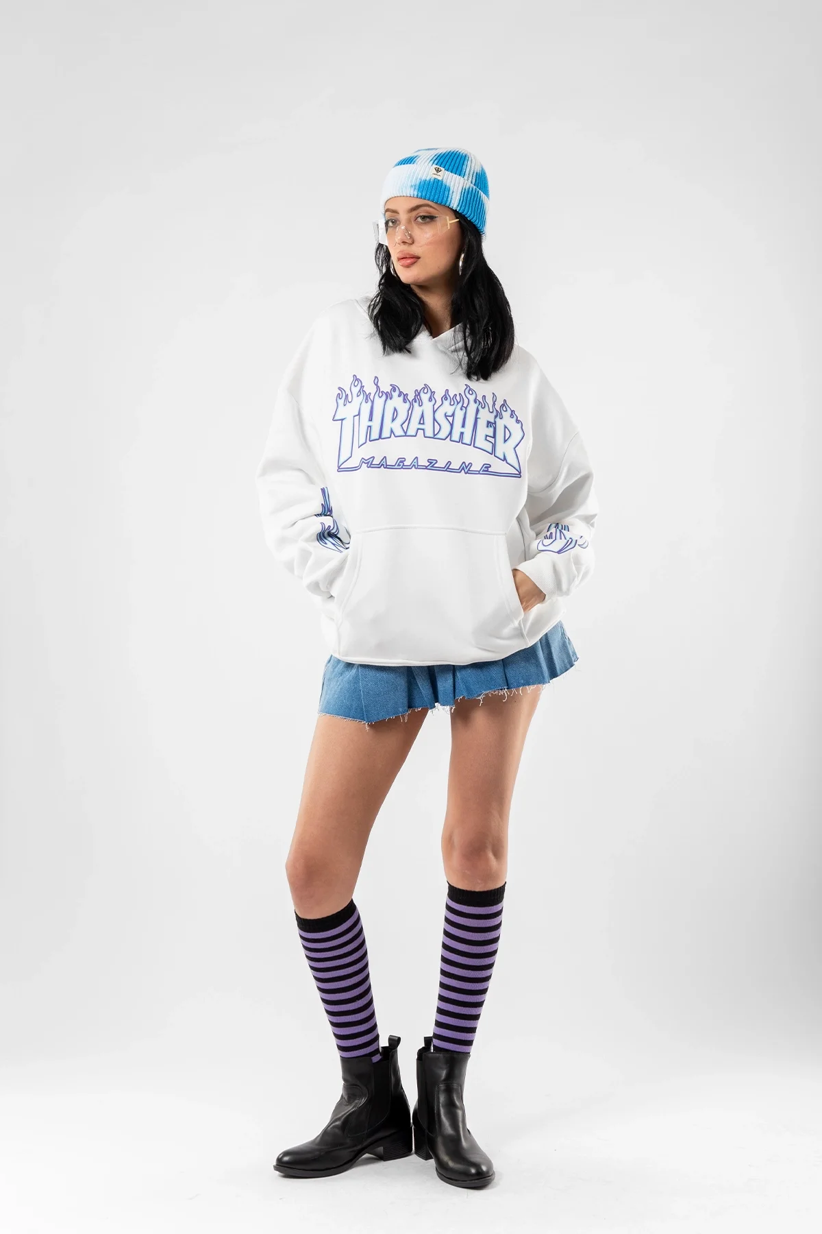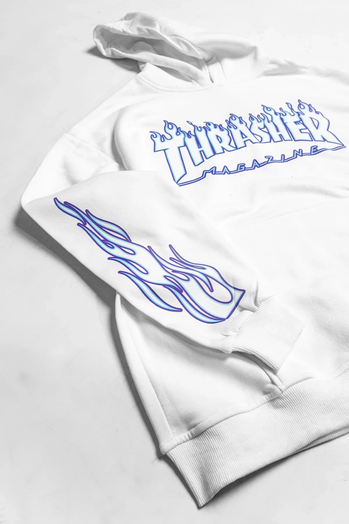 THRASHER FLAM BASKILI OVERSİZE UNİSEX BEYAZ HOODİE