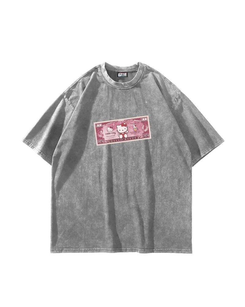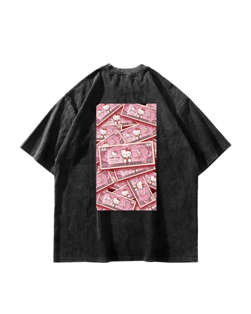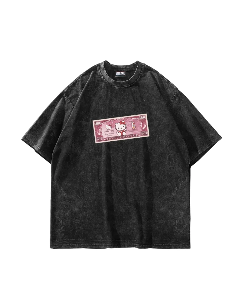 Hello Kitty Money Baskılı Oversize Unisex Yıkamalı Siyah Tshirt